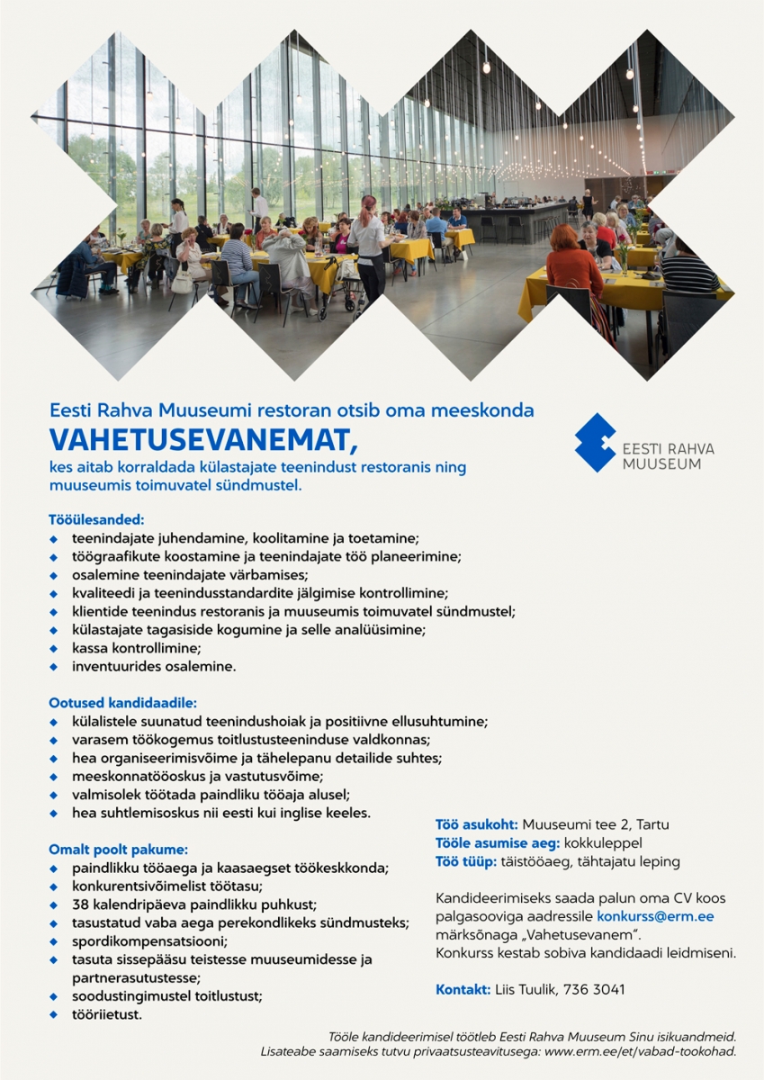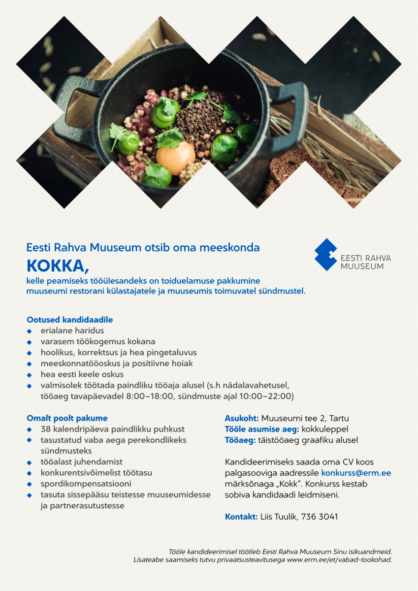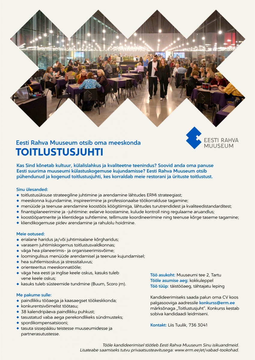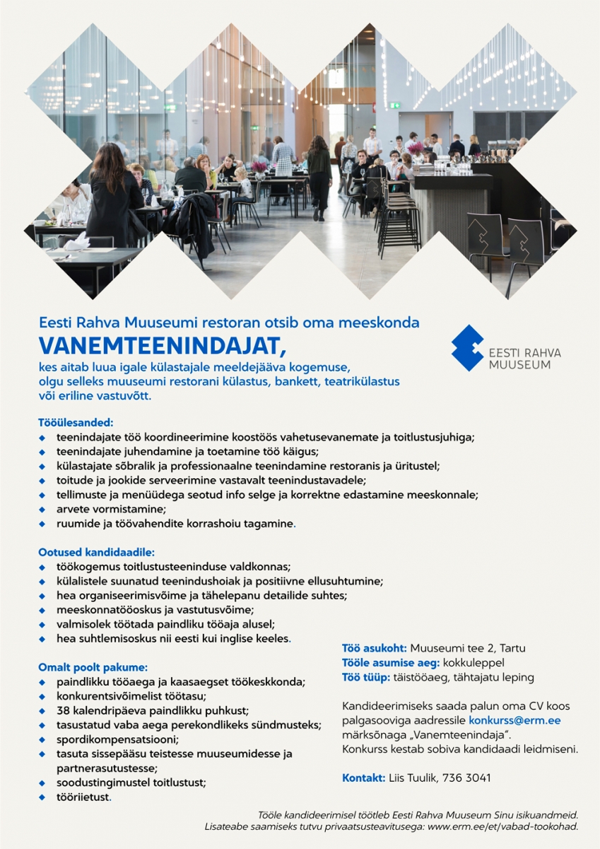 Tööle kandideerides töötleb Eesti Rahva Muuseum Teie isikuandmeid. Lisateabe saamiseks tutvuge privaatsusteavitusega