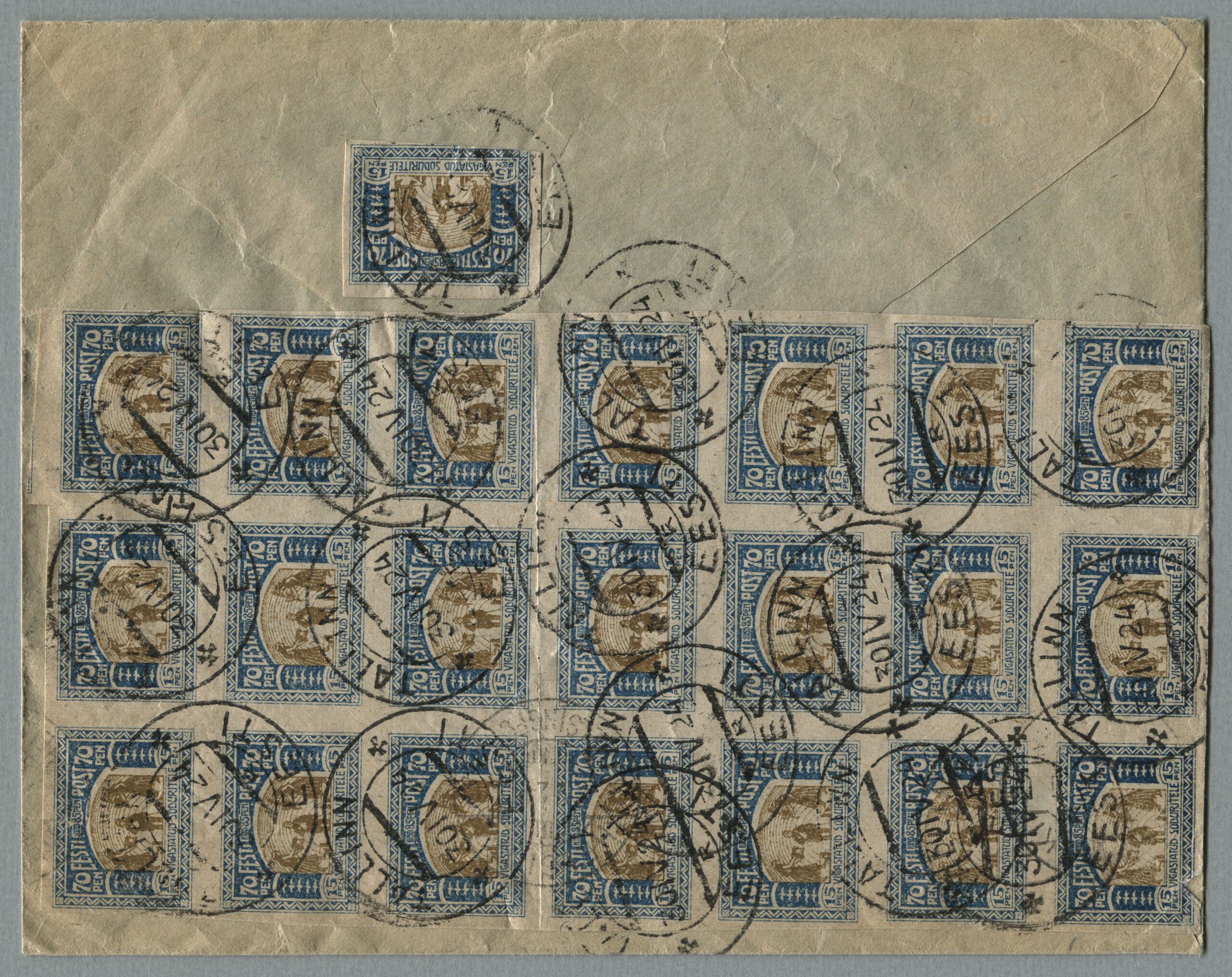 ErakoguRiigi Teataja nr 119, 8.10.1923, lk 851Tähitud õhupostikiri Tallinnast 17.10.1923 Abosse (Soome) 18.10.1923. Tariif 15 + 30 marka kehtis 1.11.1922–1.01.1924. Perforeeritud ületrükiga „Aita hädalist“ margid on kirjal haruldased. Ümbrikul on kõik sarja margid (lõigatud, hammastatud).