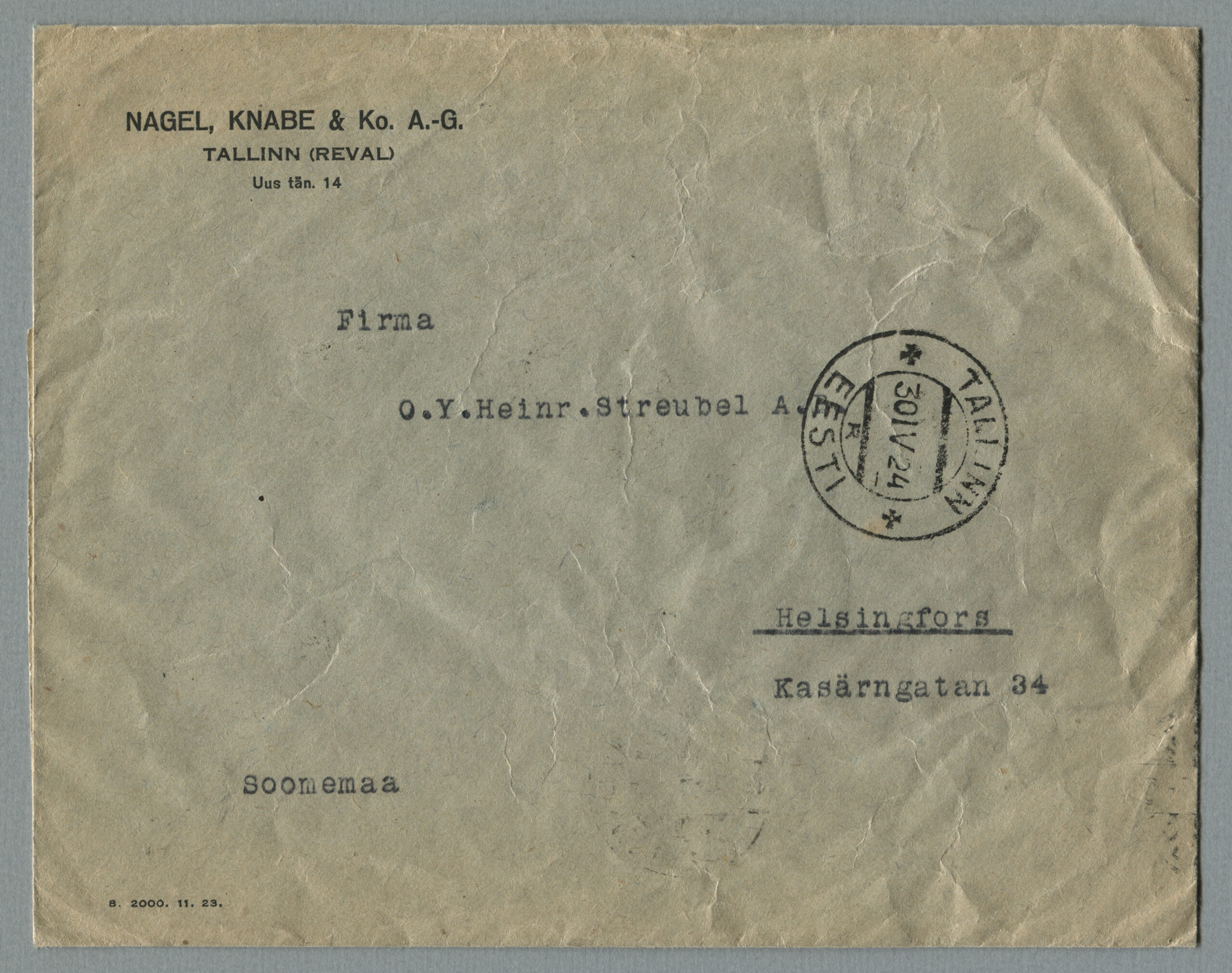 ErakoguKiri on saadetud Tallinnast 30.04.1924 Helsingisse.