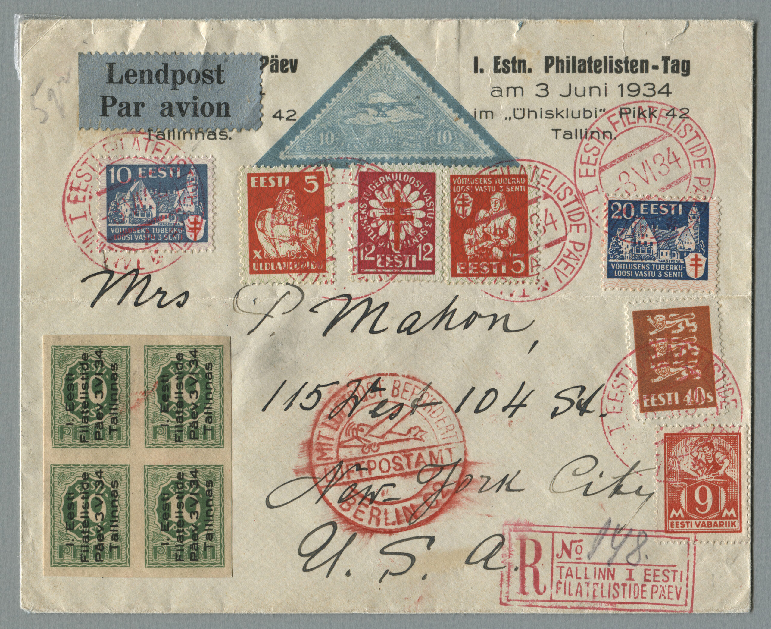 ErakoguÕhupostikiri Tallinnast 3.06.1934 New Yorki. Kirjal margid „Võitluseks tuberkuloosi vastu“, meenemargi plokk „1. Eesti filatelistide päev 3.06.1934 Tallinnas“.