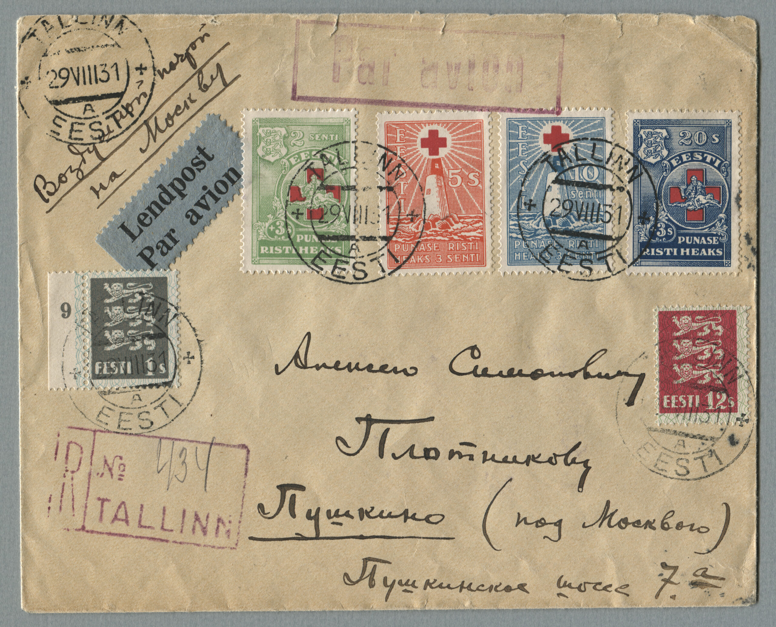 ErakoguTähitud õhupostikiri Tallinnast 29.08.1931 Moskvasse. Käsitsi kirjutatud „Воздушной почтой“.