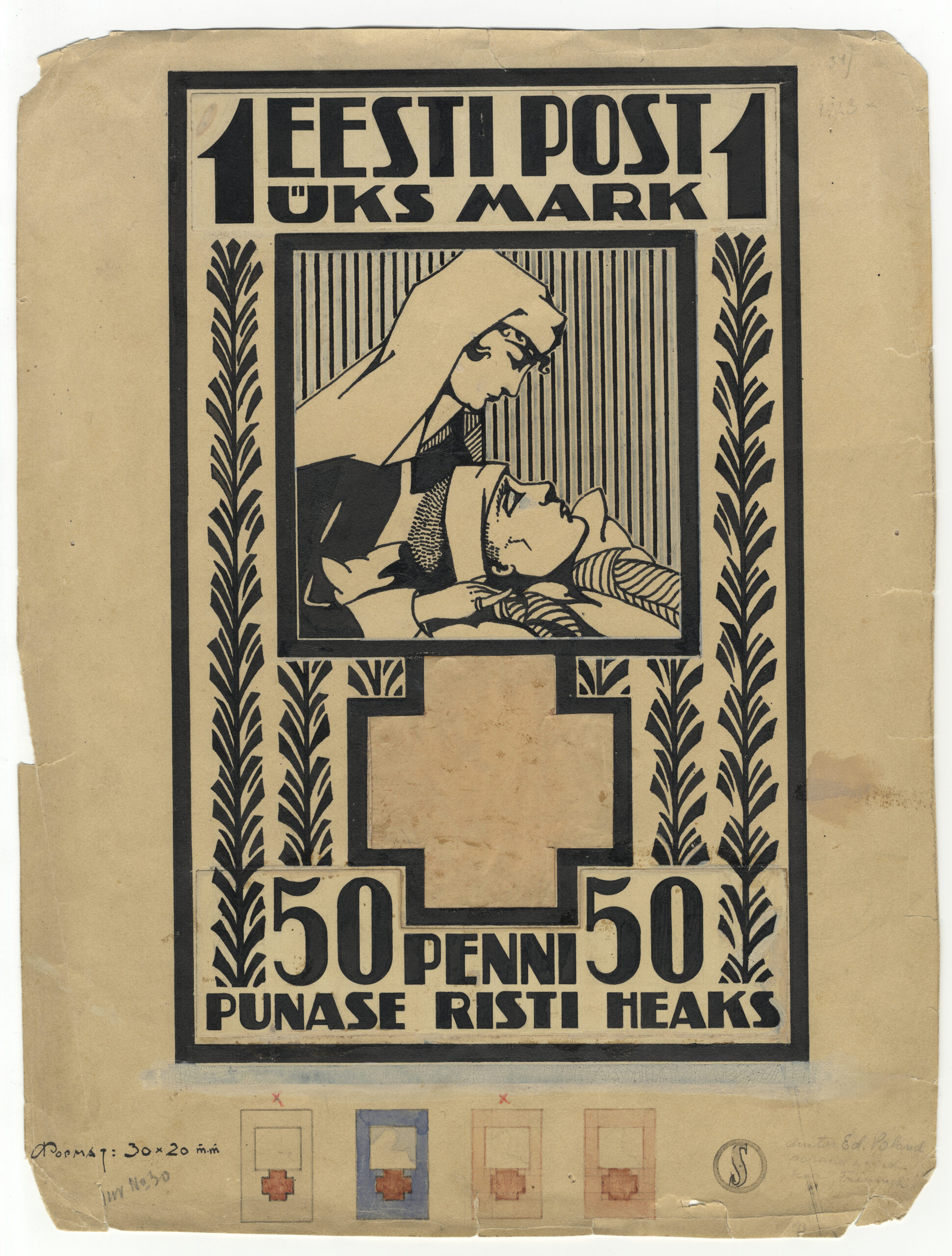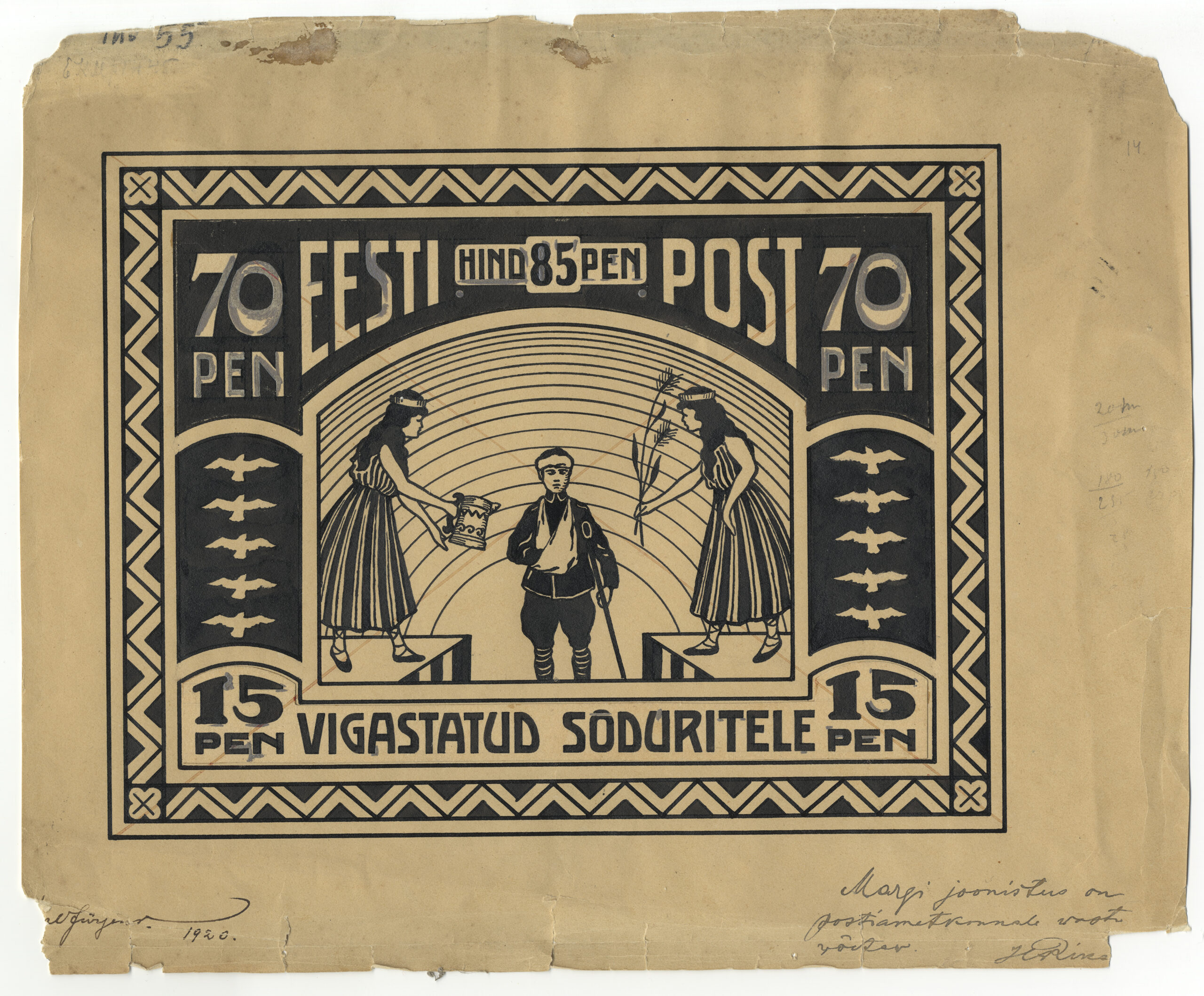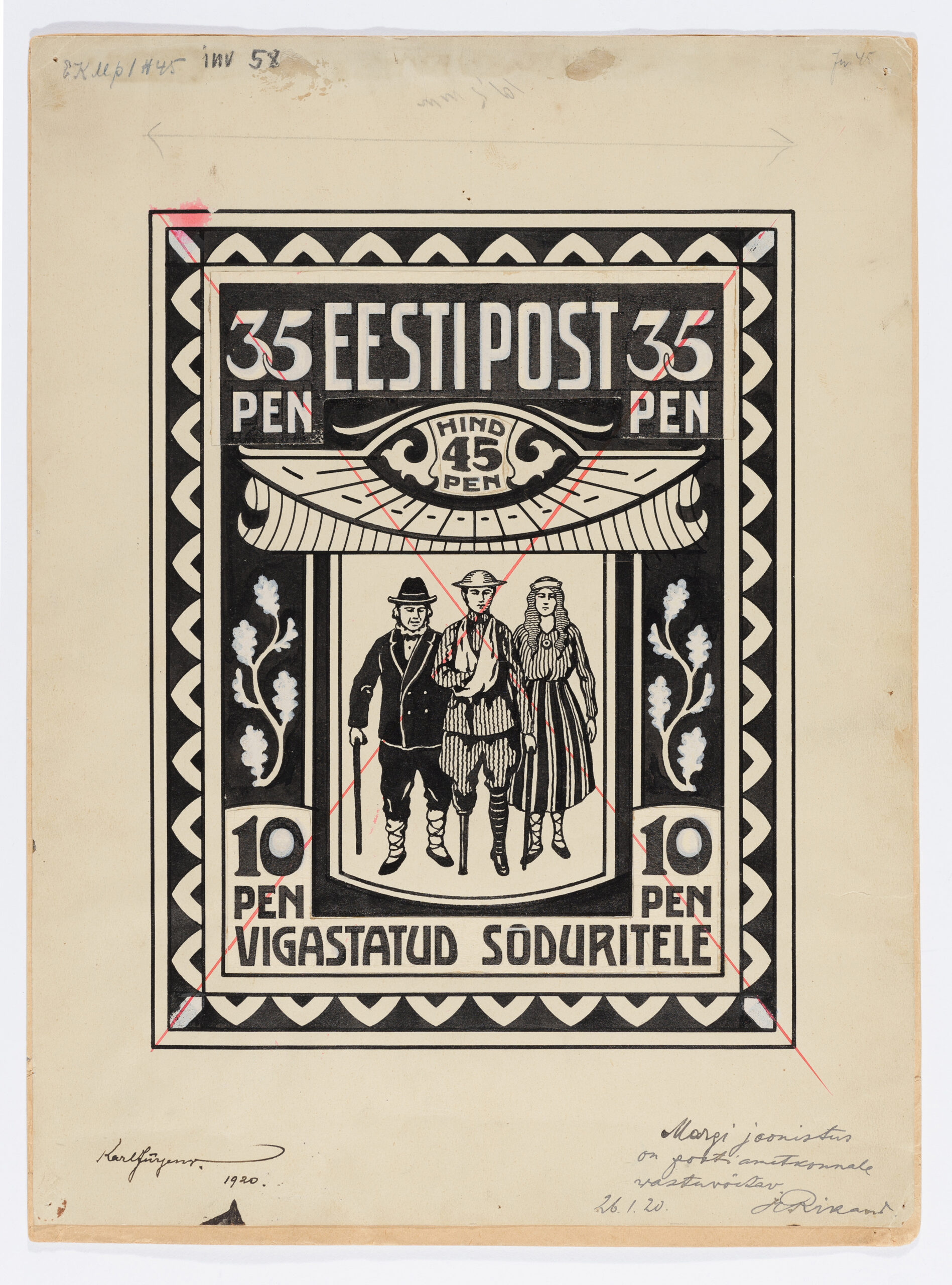 Paremal all Posti Peavalitsuse ülema Hindrek Rikandi (22.12.1874–27.04.1940) märkus „Margi joonistus on postiametkonnale vastu võetav“.