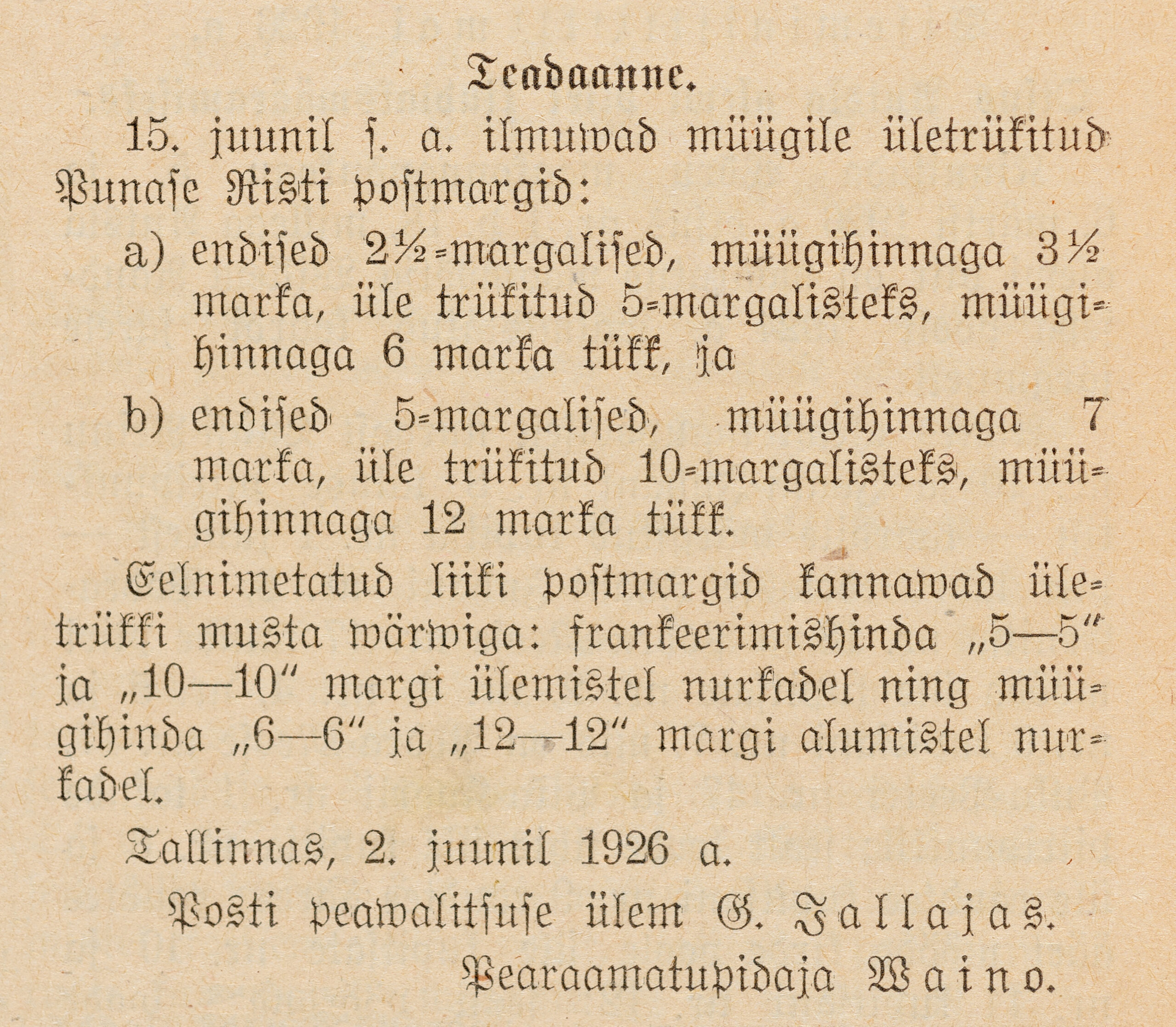 Ületrükk 5 (postitariif) + 6 (müügihind) marka. Heategevuseks läks iga margi müügist 1 mark. Markidelt müügihinnaga 12 marka läks heategevuseks 2 marka.