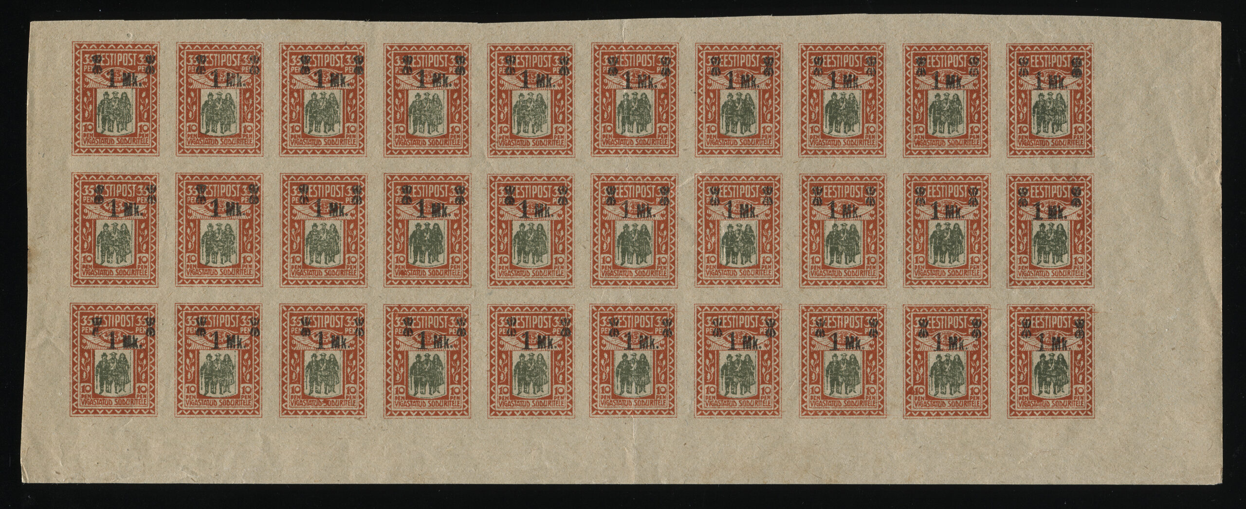 ERMi koguMargi „Vigastatud sõduritele“ ületrükk 2 marka. Ületrükk tehti Tallinna trükikojas „Ühiselu“, tagaküljel ületrüki jälg.