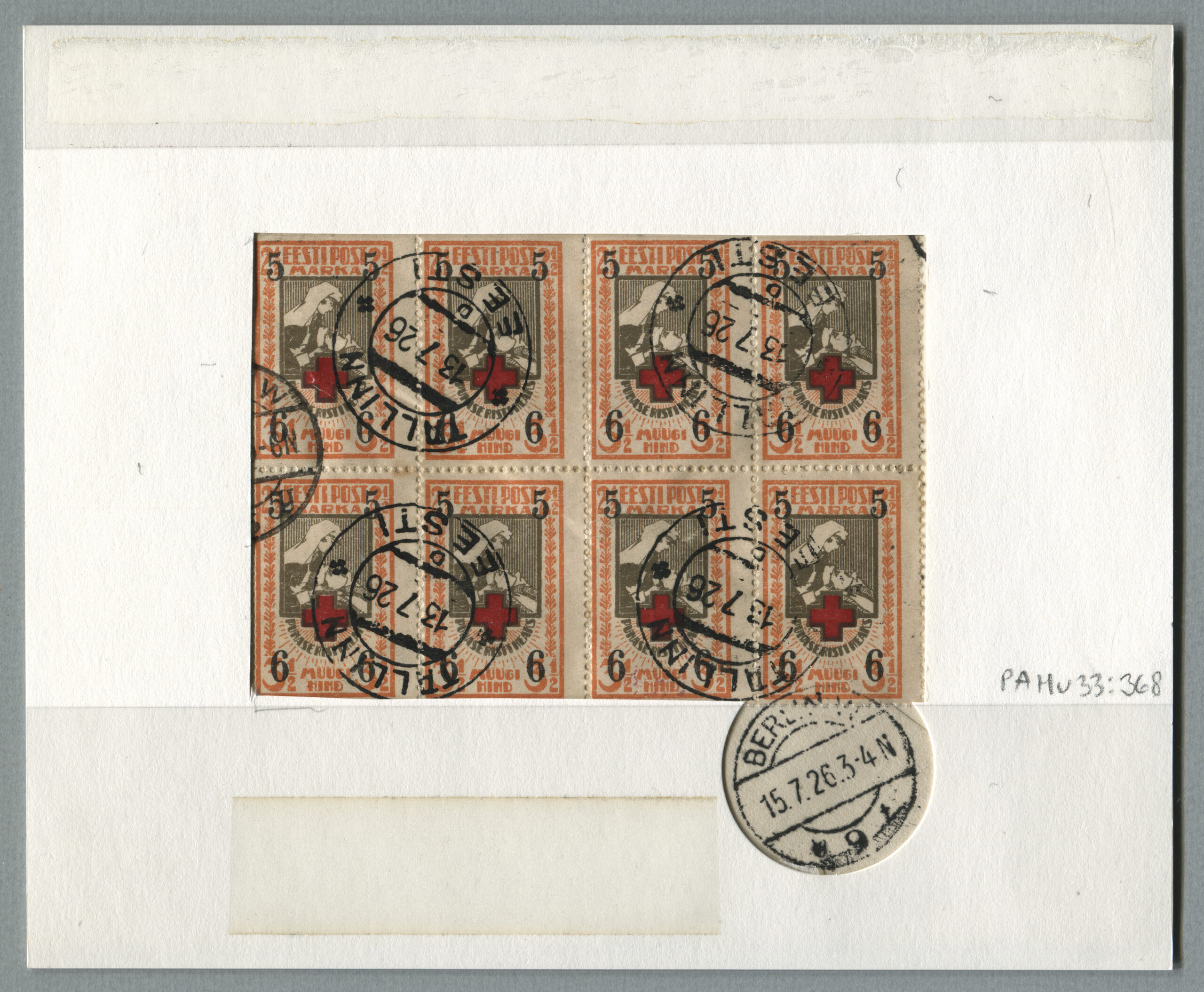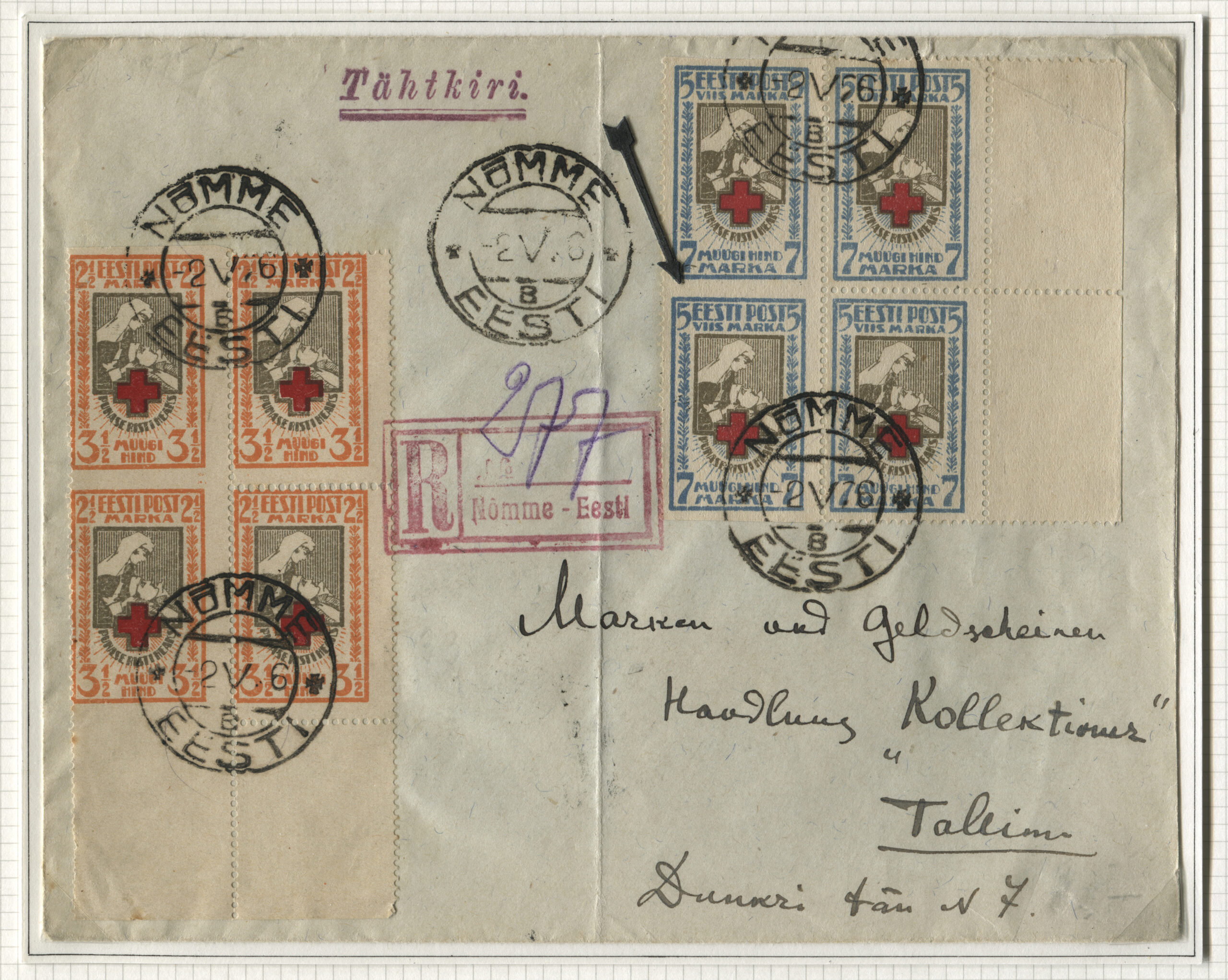 ERMi koguTähitud kiri Nõmmelt 2.05.1926 Tallinna 3.05.1926. „Punase Risti heaks“ margid: hammastatud ja lõigatud horisontaalse hammastusega markide nelikud.