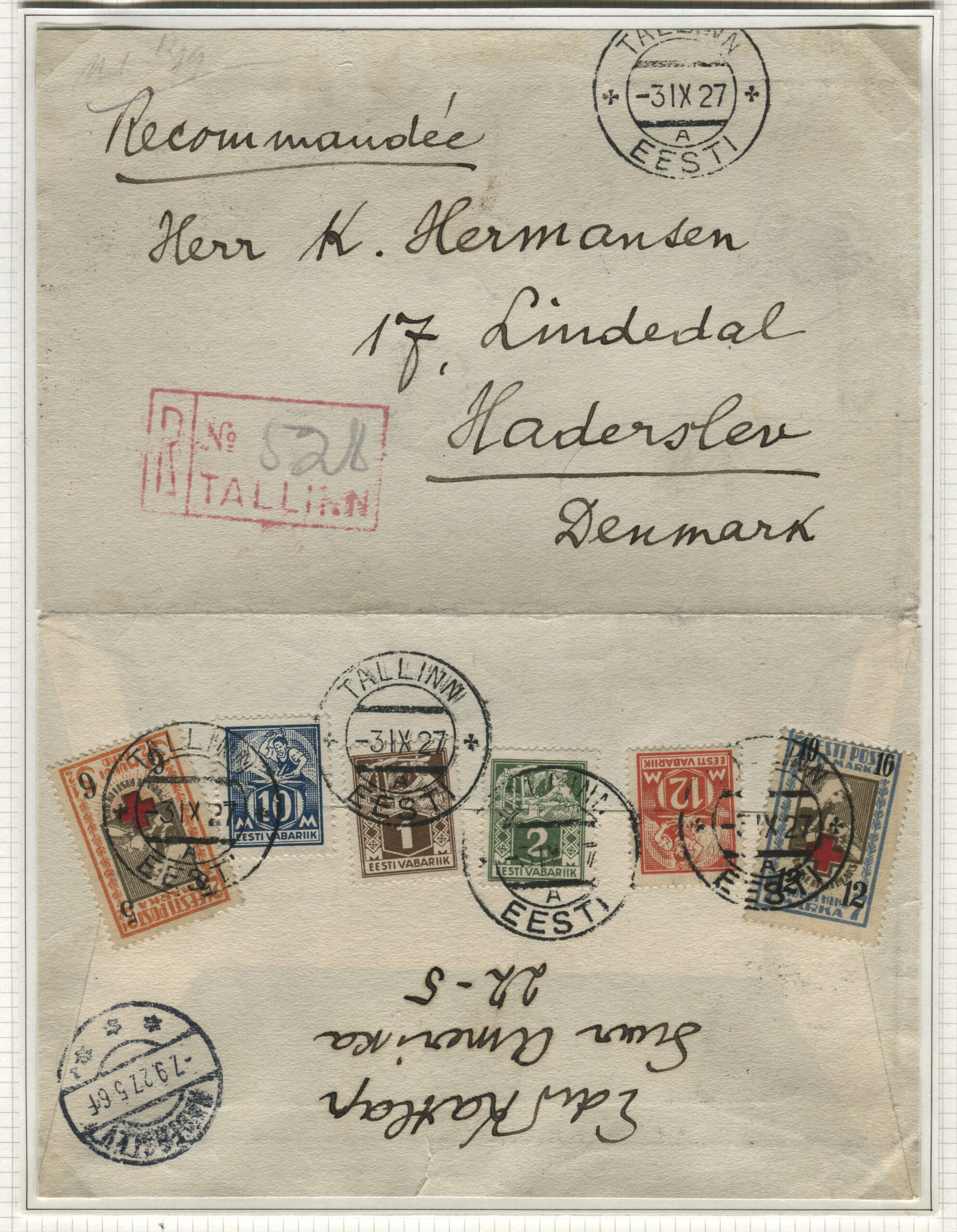 ERMi koguTähitud kiri Tallinnast 3.09.1927 Haderslevi (Taani) 7.09.1927.