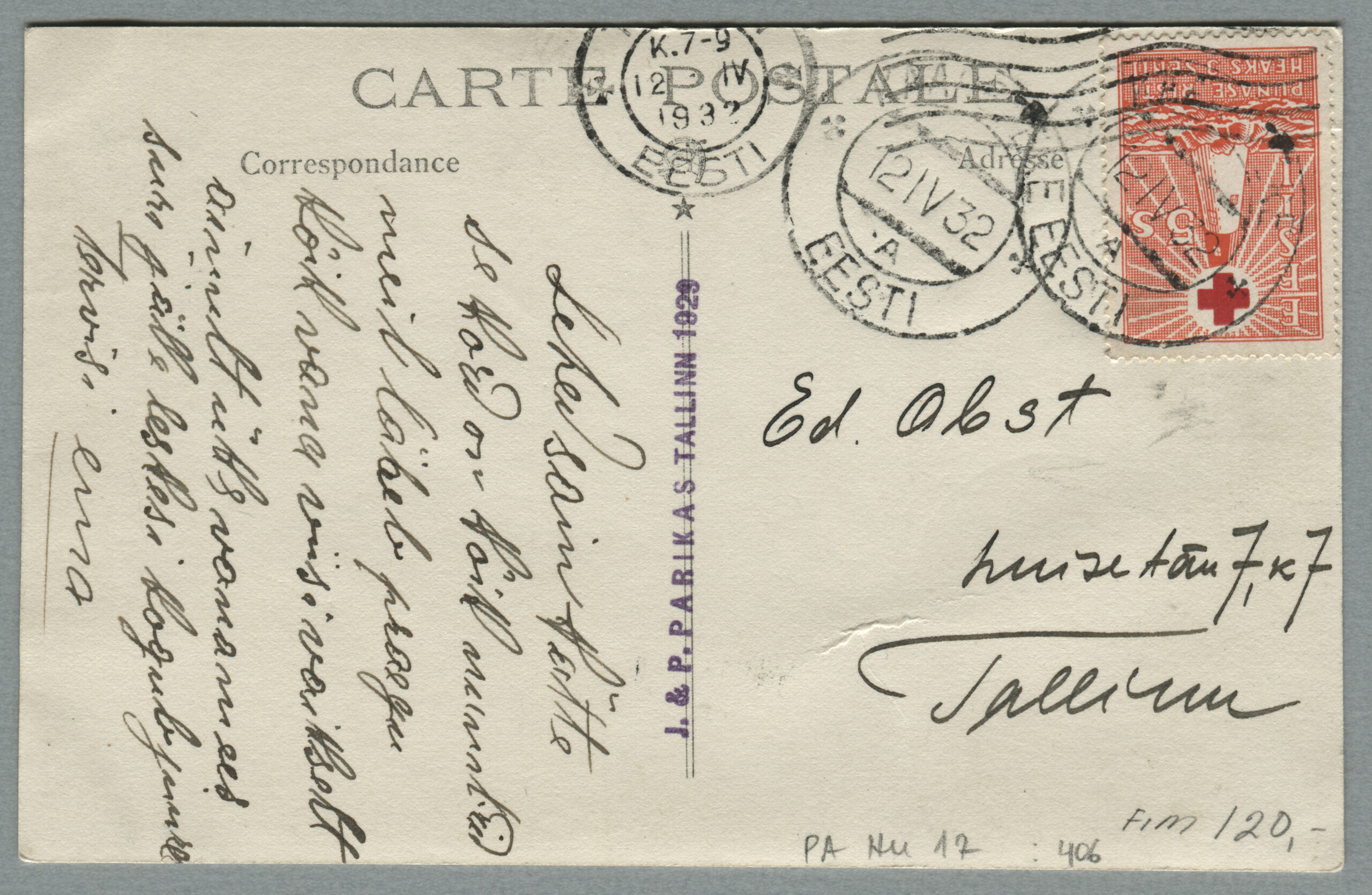 ERMi koguKohalik kiri, postkaart on saadetud Tallinna 12.04.1932.