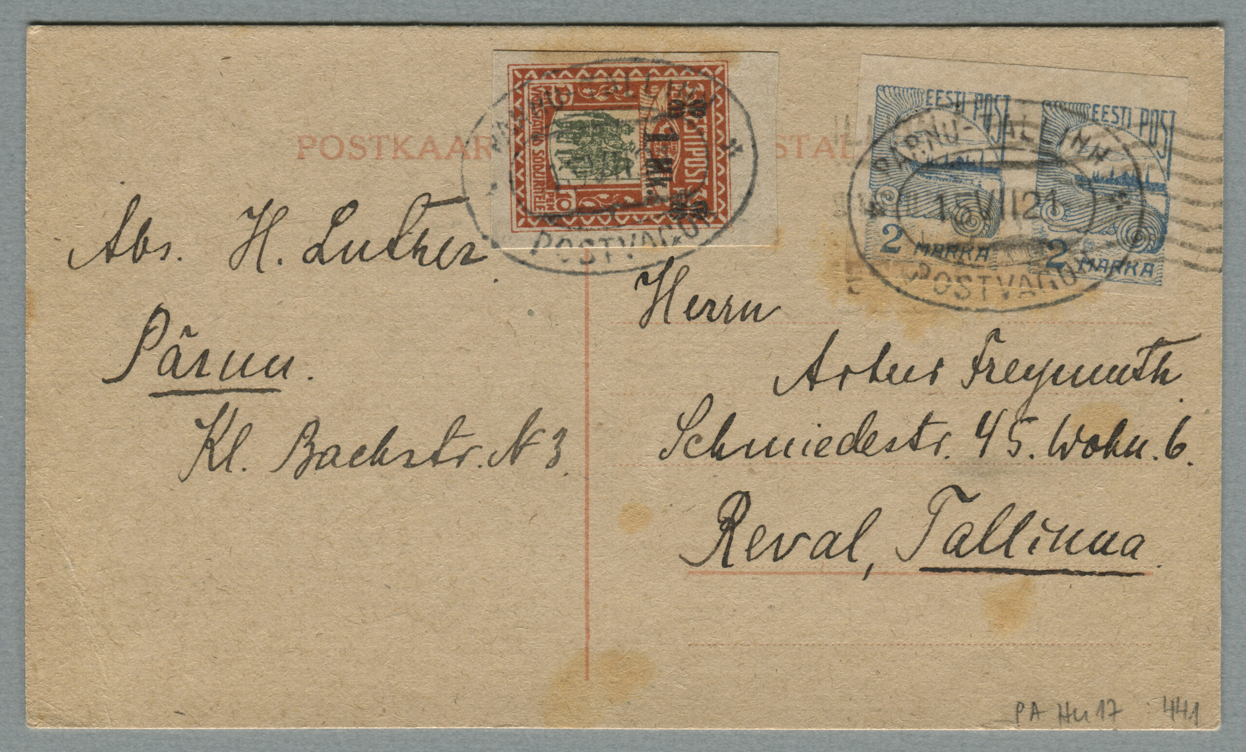 ERMi koguPäewaleht, nr 240, 22. oktoober 1920Kaja nr 88, 21. aprill 1921Postkaart on saadetud Tallinna, postivaguni Pärnu-Tallinn tempel 15.07.1921.