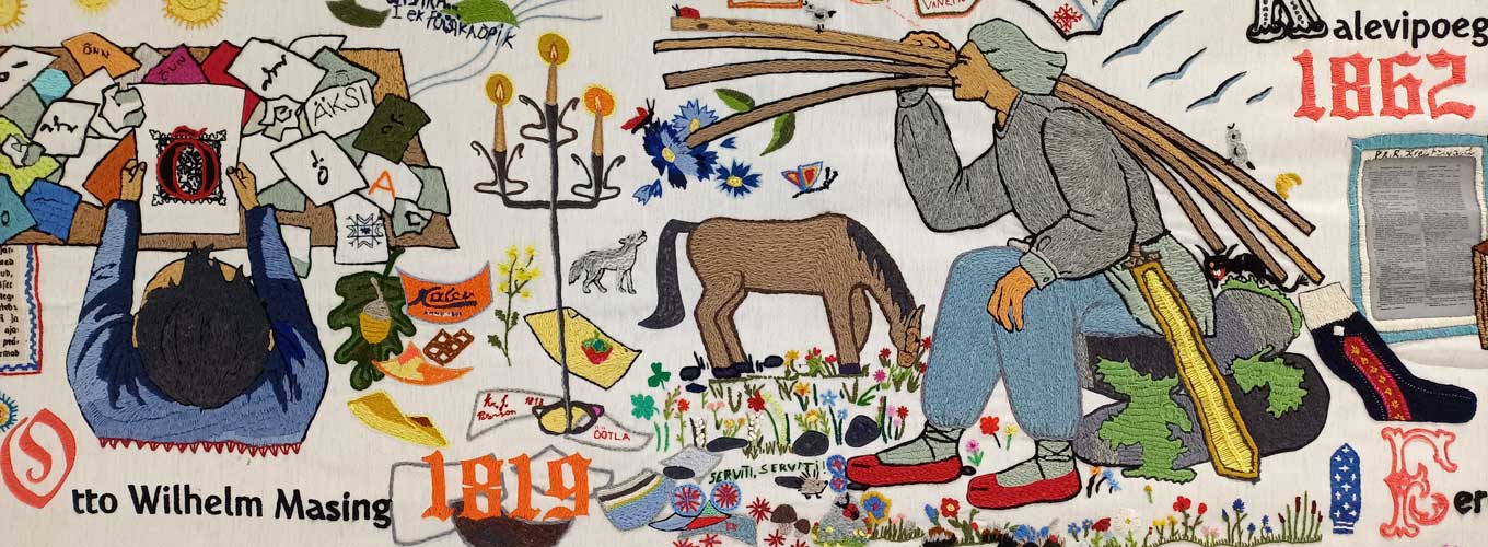 This exhibition brings together two separate bodies of work, made in different periods but animated by the same spirit. The first is the pictorial masterwork The Year of the Book Tapestry, embroidered in 48 locations across Estonia. It travelled more than 3,600 kilometres, and its logbook contains 2,917 signed entries. The idea and initiative behind the work came from Mart Jagomägi, and the design was created by students in the Textile Department of the Pallas University of Applied Sciences.