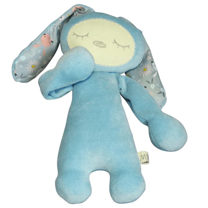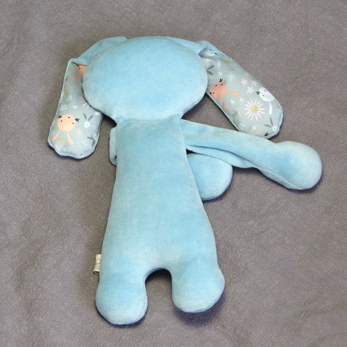 Stuffed bunny is made of safe and ecological cotton fabric (OEKO-TEX Standard 100 certificate), so it is a truly safe toy also for newborns. The face is made of wool fabric and facial expressions are “drawn” using free motion quilting. Toy is filled with non-allergic poly fiber.