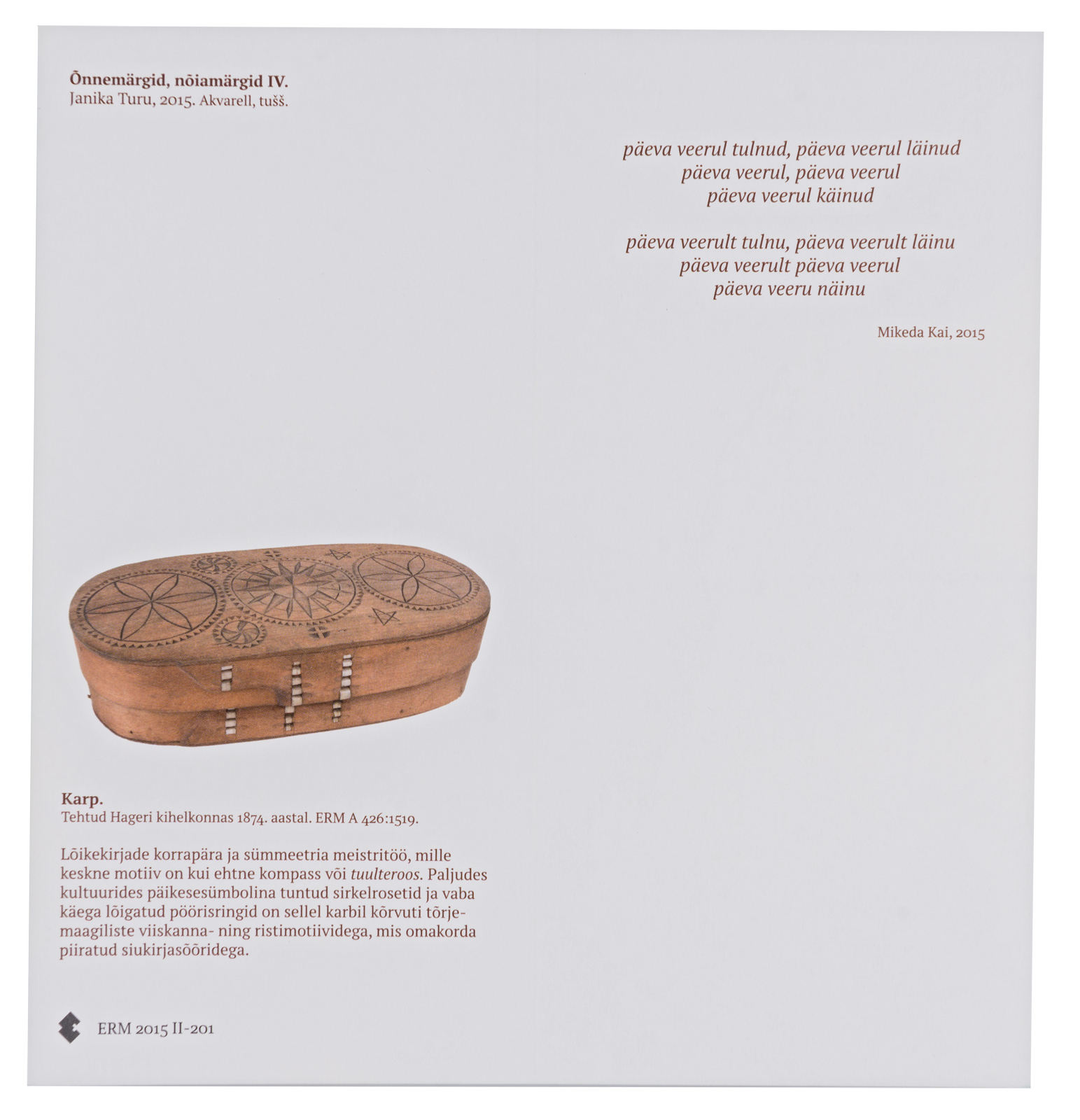 Lõikekirjade korrapära ja sümmeetria meistritöö, mille keskne motiiv on kui ehtne kompass või tuulteroos. Paljudes kultuurides päikesesümbolina tuntud sirkelrosetid ja vaba käega lõigatud pöörisringid on sellel karbil kõrvuti tõrjemaagiliste viiskanna- ning ristmotiividega, mis omakorda piiratud siukirjasõõridega.