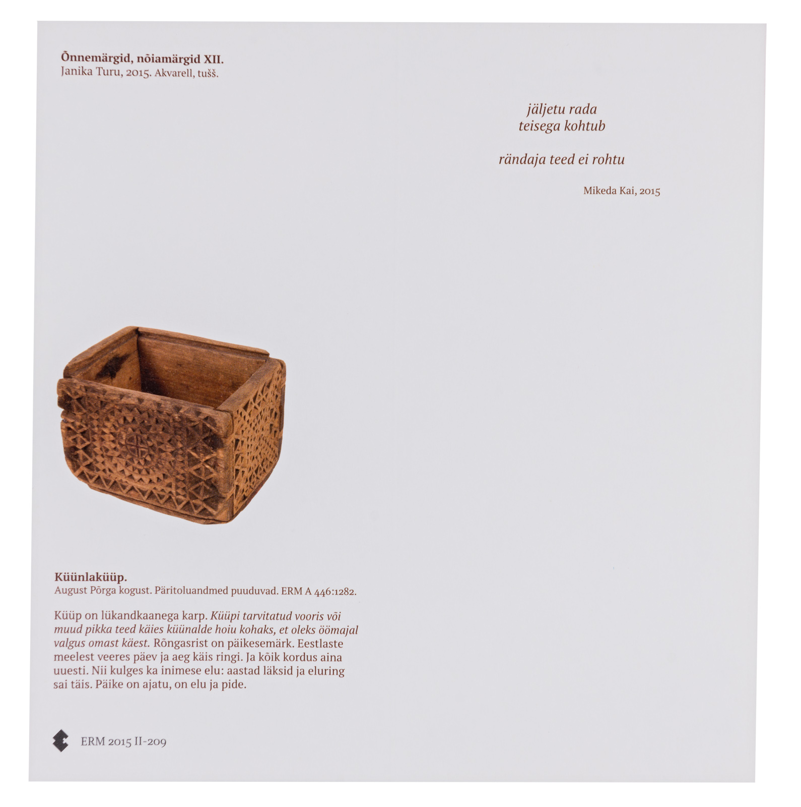 Küüp on lükandkaanega karp. Küüpi tarvitatud vooris või muud pikka teed käies küünalde hoiudkohaks, et oleks öömajal valgus omast käest. Rõngasrist on päikesemärk. Eestlaste meelest veeres päev ja aeg käis ringi. Ja kõik kordus aina uuesti. Nii kulges ka inimese elu: aastad läksid ja eluring sai täis. Päike on ajatu, on elu ja pide.
