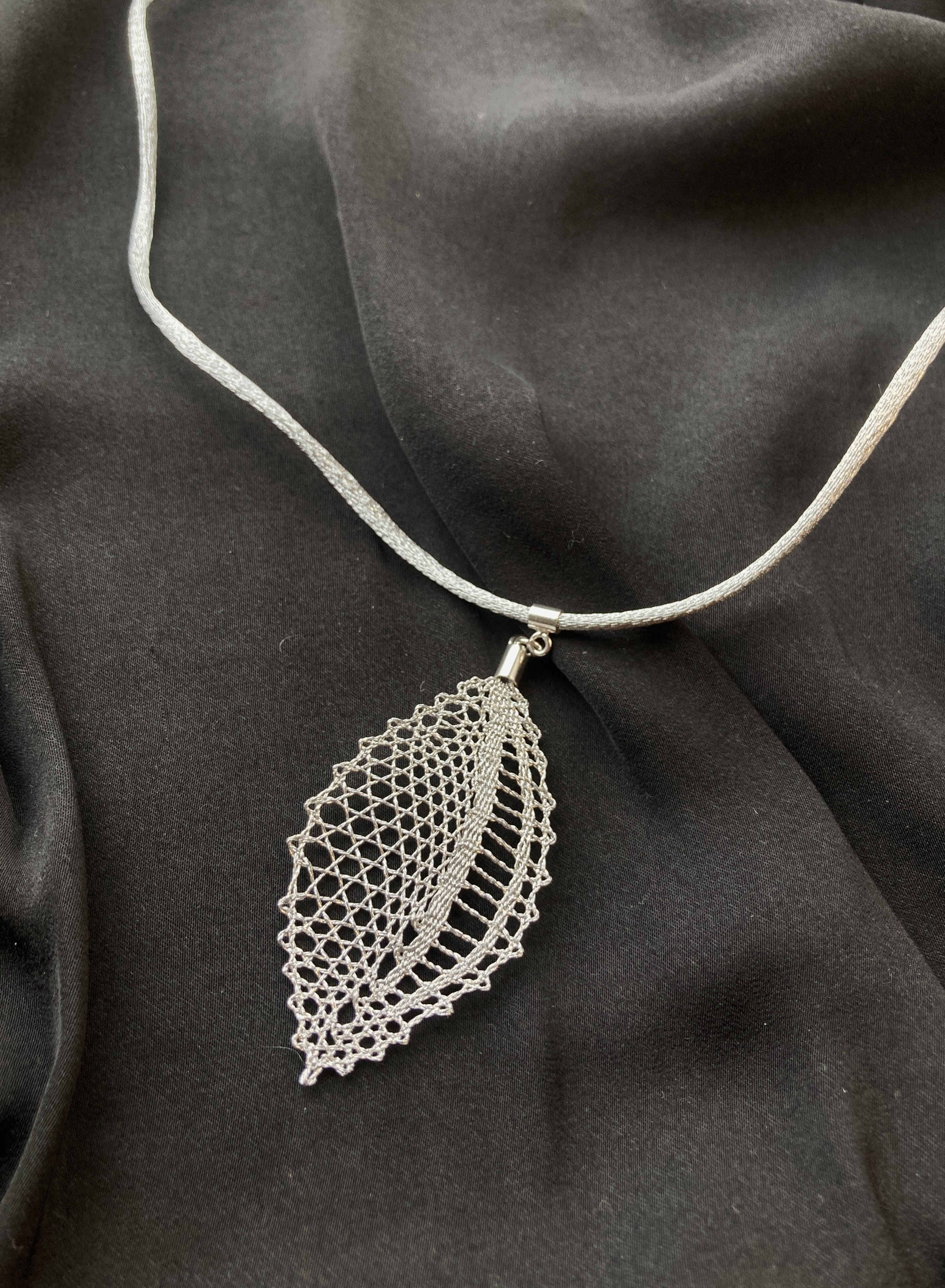 Hõbedane niplispitsist kaelaehe "Leht" | Eesti rahva muuseum