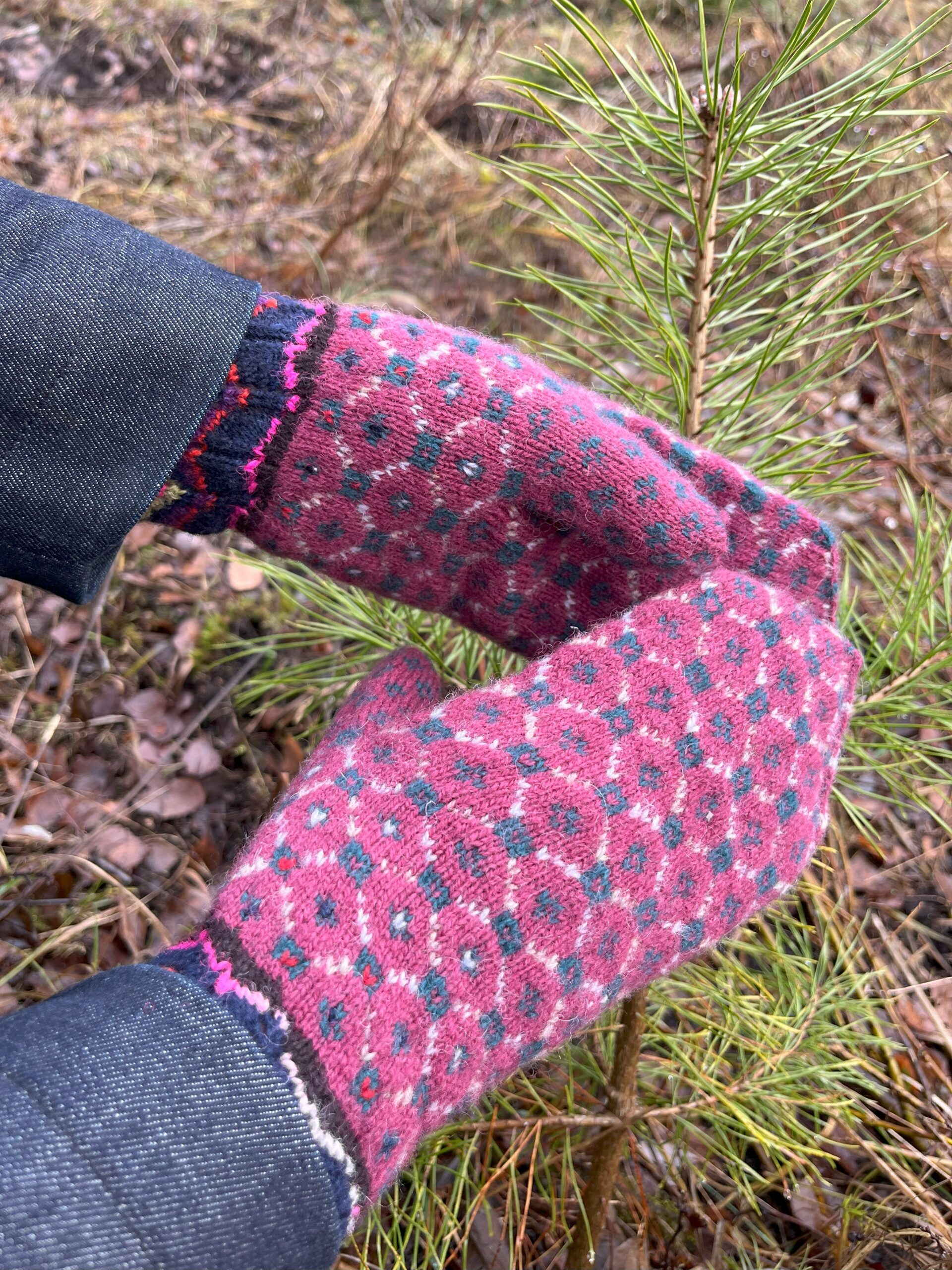 Eesti traditsiooniliste kinnaste eeskujul ja ainetel käsitsi kootud kindad.