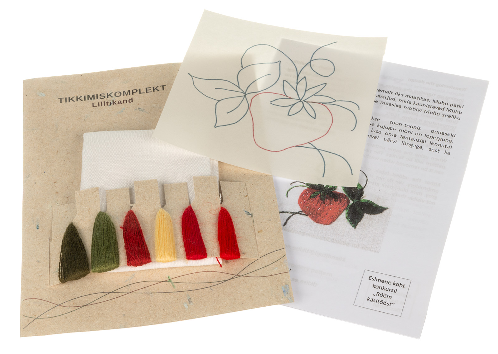 Tikiise tikkimiskomplekt sisaldab mustrit, juhendit, kangast, tikkimismaterjale ja nõela.
