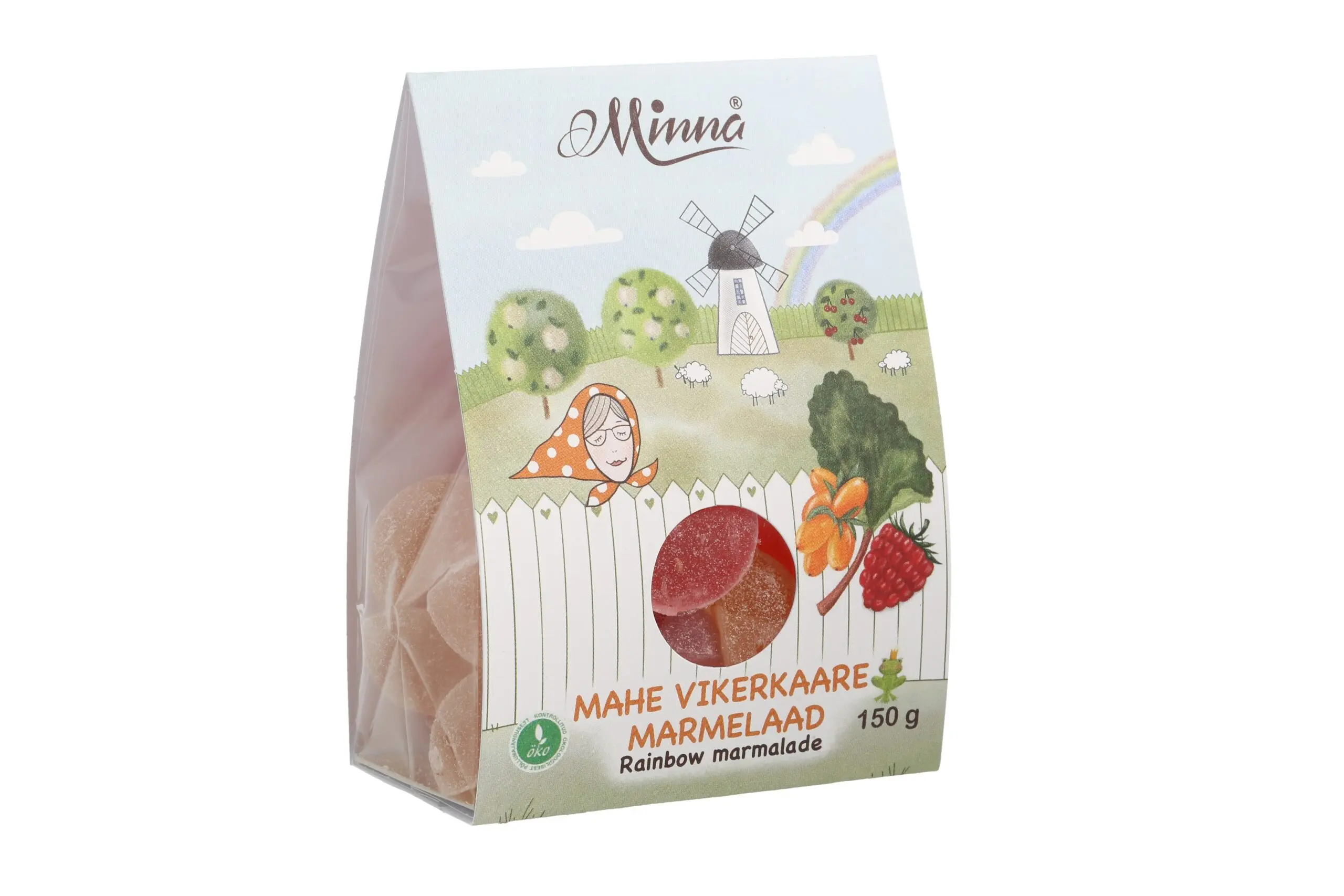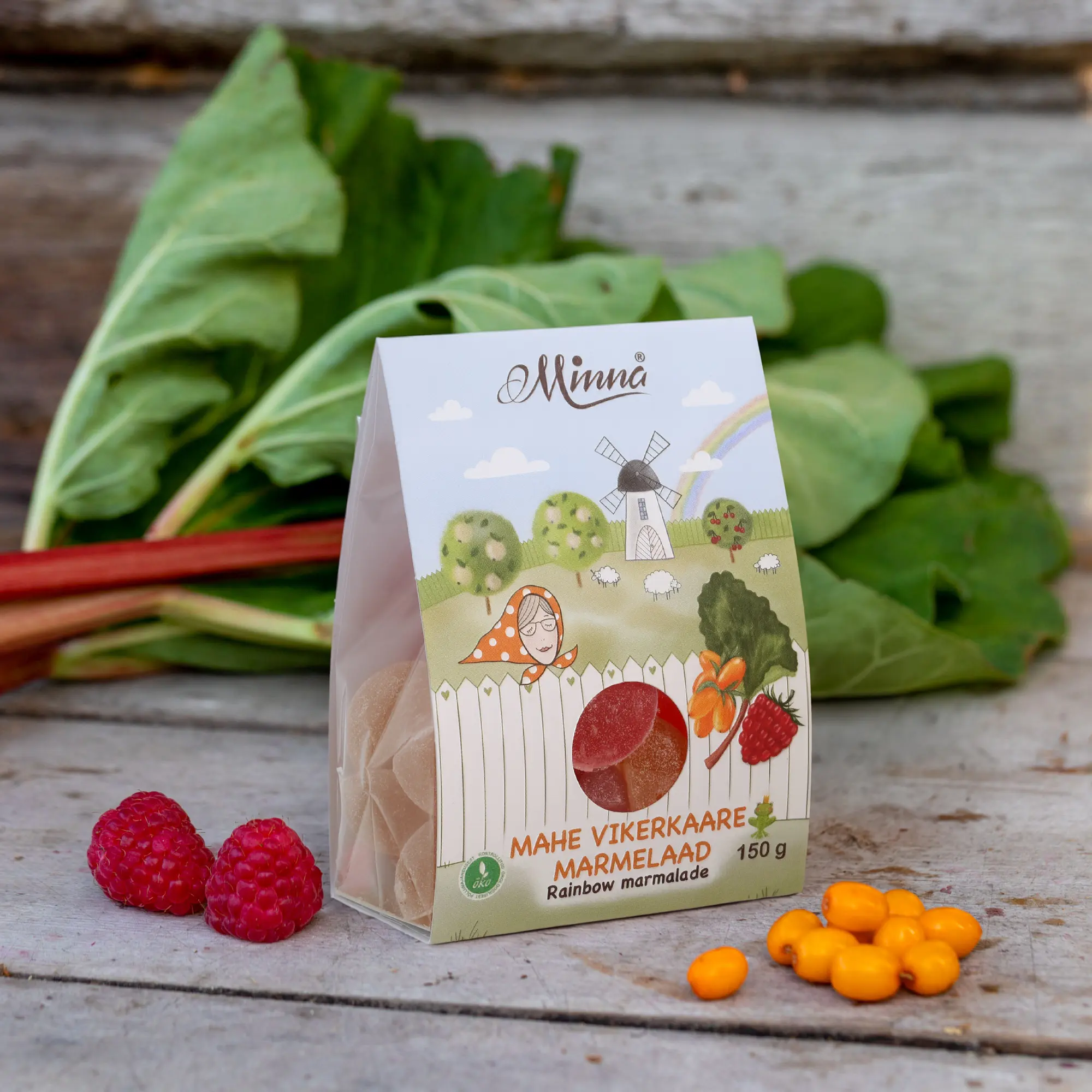 Vanaema Minna eeskujul valmivad kõik marmelaadid käsitööna ja ei sisalda säilitus- ega värvaineid. Marjad, puu- ja köögiviljad ostetakse kokku mahekasvatajatelt ning metsamarjad on korjatud Eestimaa mahealadelt! Puhastatud andidest valmistatakse püree, mis annab marmelaadikommidele naturaalse värvi.