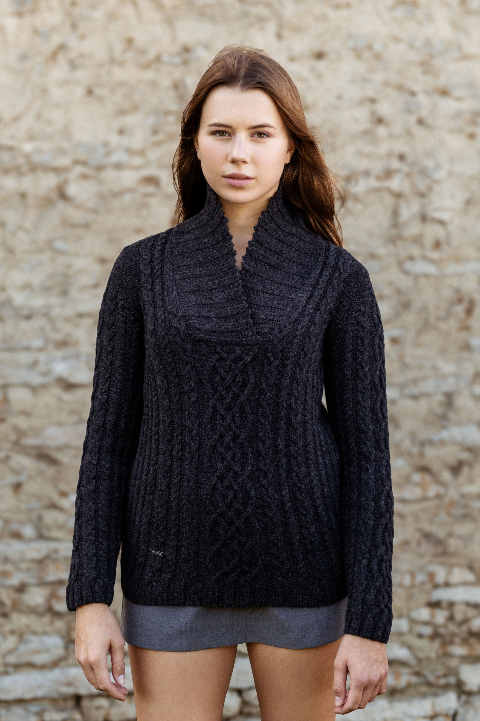 Keskmise paksusega sallkraega kampsun on soe ja väga pehme. Sallkrae servas on kaunistav pitsiline koerida. Kampsun on kootud üleni erinevate palmikute mustrilisena, ka seljaosa.