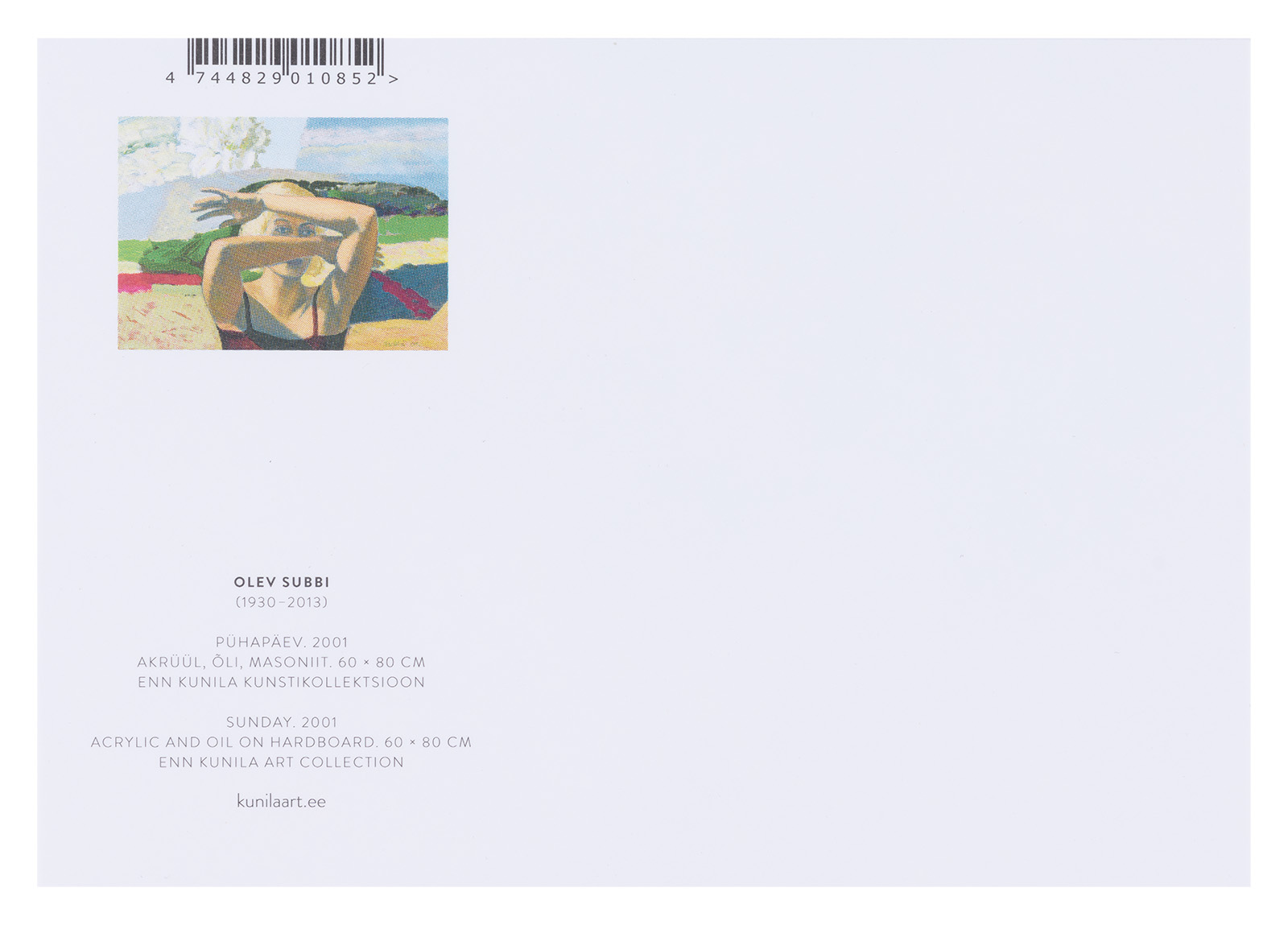 Postkaart on müügil seoses näitusega “Olev Subbi. Täiuse poole püüeldes”. Ülevaatenäitus annab ulatusliku sissevaate Eesti 20. sajandi teise poole ühe kõige olulisema maalikunstniku loomingusse. Kõiki olulisemaid perioode ning žanre hõlmaval näitusel on väljas üle 80 maali nii riiklikest kollektsioonidest kui erakogudest. Väljas on kunstniku mälumaastikud, aktid, portreed, figuraalkompositsioonid ning abstraktsed teosed. Näitusega tähistatakse Olev Subbi 95. sünniaastapäeva.