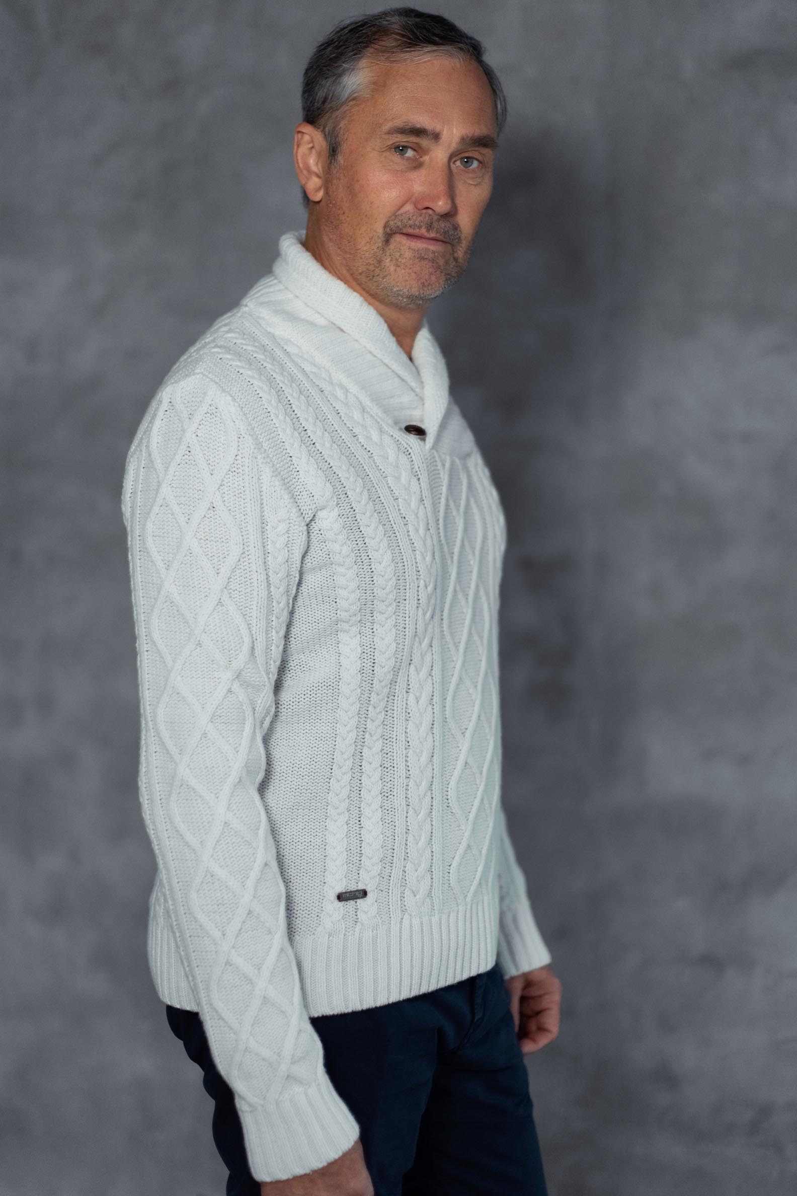 Mõnusalt pehme, paks ja soe klassikalise sallkraega täisvillane kampsun.