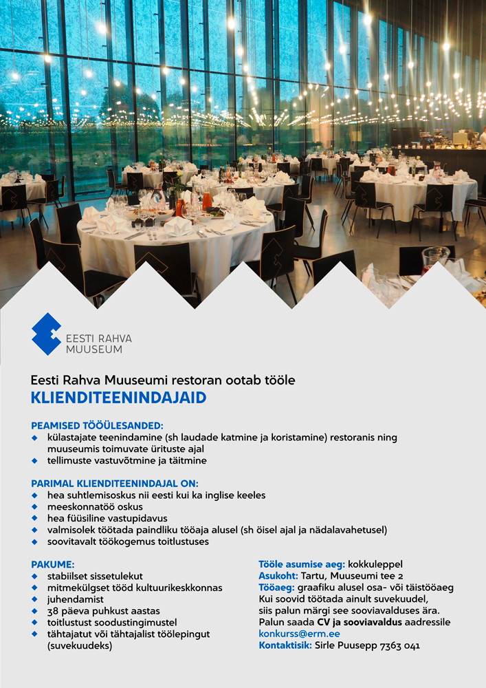 Eesti Rahva Muuseumi restoran ootab tööle klienditeenindajaid. Muuhulgas ka töötajaid vaid suveperioodiks.