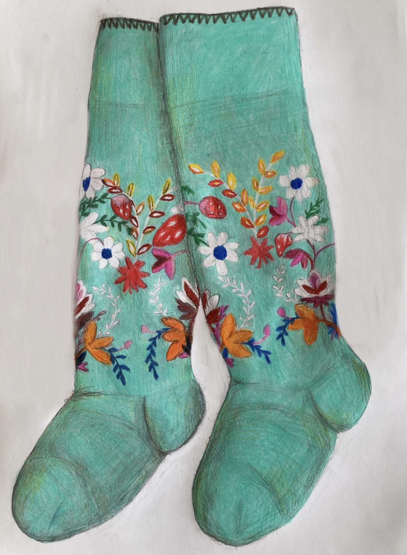 Fotol Anna-Lisa Kollo töö "Sukad", mille saatetekstiks Anna-Lisa kirjutab: "Pildil on Muhu lilltikandiga sukad mis on kindlasti üle saja aasta vanad. Sukad on pärit minu vanema suguvõsast. Kuigi sukad on heas korras ja neid saaks kasutada ei kasuta me neid sest need on liiga vanad ja väärtuslikud. Tikitud sukki on Muhus vähem kui kirimustrisse kootud sukki ja see teeb need eriliseks. Sukad on tikitud peegelpildis ja seda on keeruline teha, eriline on ka sukkade värv. Neid sukki on kantud ainult erilistel puhkudel mida on näha sellest et neid ei ole eriti parandatud."