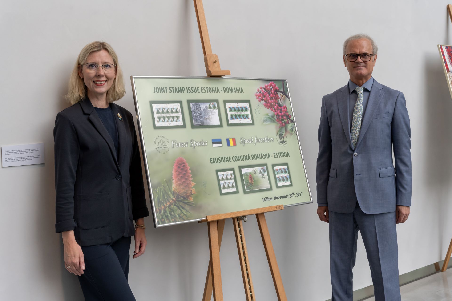 ERMi direktor Kertu Saks ja Rumeenia suursaadik Călin Stoica Rumeenia margipannoode näituse avamisel | Pilt: Arp Karm