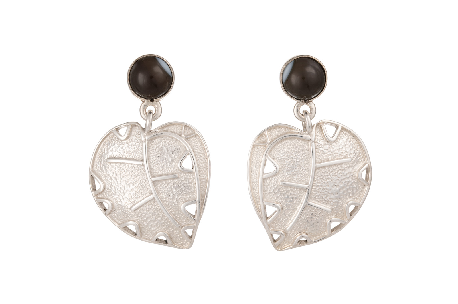 Hõbedast kõrvarõngad on valminud käsitööna. Kõrvarõngaste autoriks on ehtekunstnik Riin Somelar, ta lõpetas 1992. aastal Eesti Kunstiakadeemia metallikateedri ning on Metallikunstnike Liidu liige alates 1994. aastast.<br> <br> Riin Somelari ehted on valmistatud hõbedast ning kõigil on meistri- ja proovimärk. Lisandina kasutab ta kulda, poolvääriskive, maakive, jõepärleid, pärlmutrit ning teisi naturaalseid materjale.<br> <br> Kõrvarõngad on kaunistatud ahhaadiga.<br> Kõrvarõngaste laius 2,5 cm ja kõrgus on 3,5 cm. Ehete kaal on 4 grammi. <br>