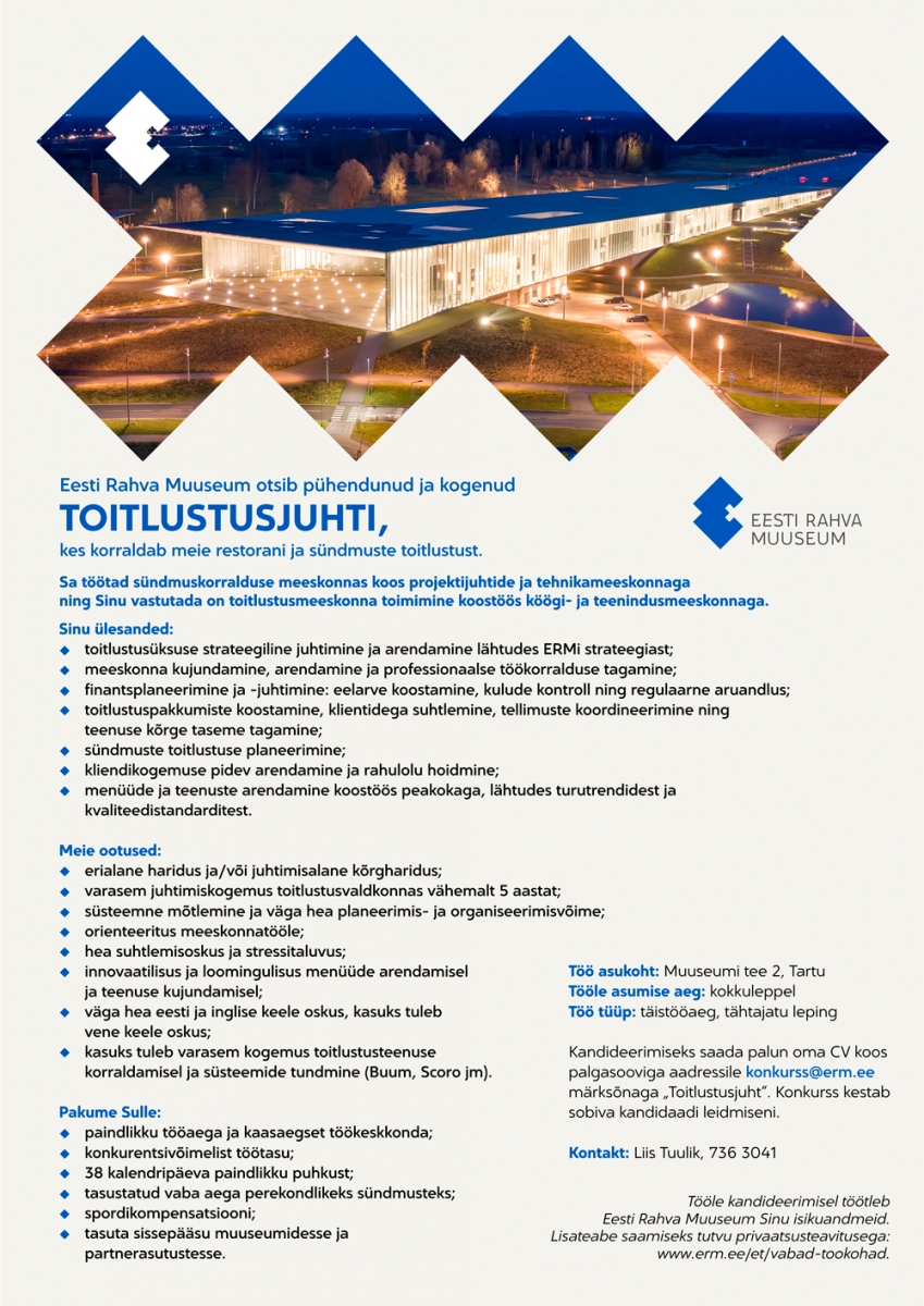 Tööle kandideerides töötleb Eesti Rahva Muuseum Teie isikuandmeid. Lisateabe saamiseks tutvuge privaatsusteavitusega