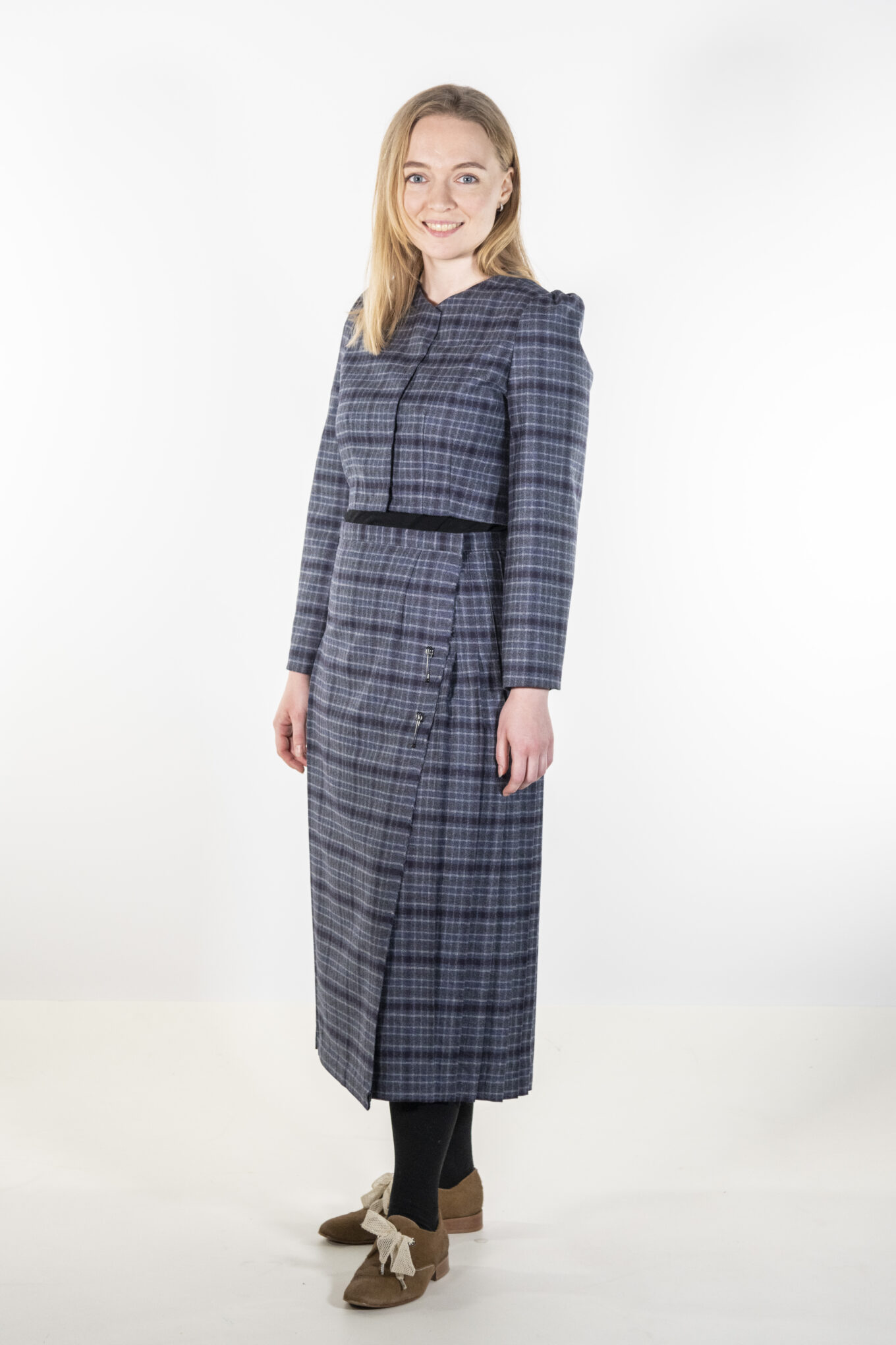 Pürjema lõputöö üheks tulemuseks on ka kaapotkleitidest ja šotiruudulisest kangast inspireeritud rõivakollektsioon. Fotol kannab ta ühte komplekti lõputöö käigus valmivast kollektsioonist.
