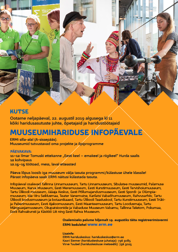 Ootame neljapäeval, 22. augustil 2019 algusega kl 11 kõiki haridusasutuste juhte, õpetajaid ja haridustöötajaid muuseumihariduse infopäevale ERMi silla-alal (A-sissepääs), kus muuseumid tutvustavad oma projekte ja õpiprogramme.