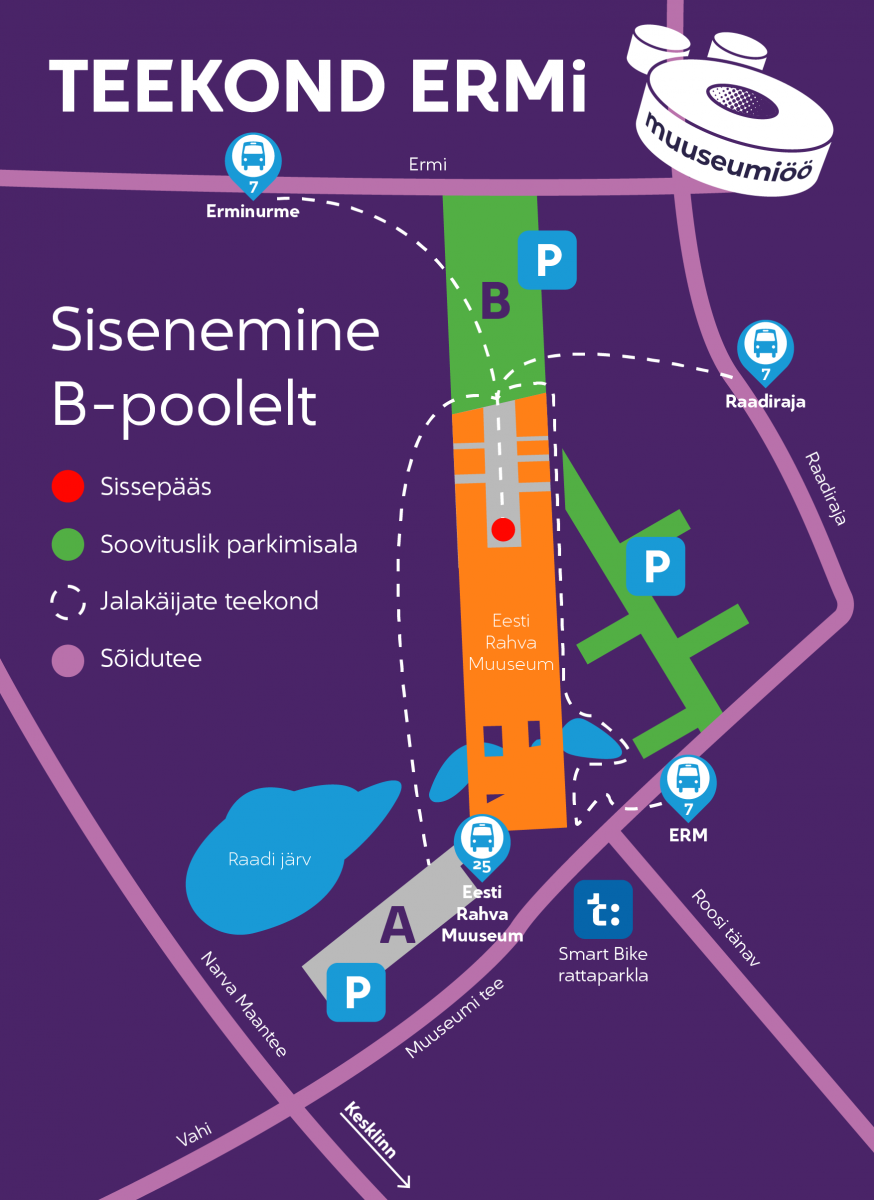 - Parkida palutakse ERMi B-parklasse. Võib tulla hoopis jala, ühistranspordi (bussiliinid nr 7 ja 25) või jalgrattaga.
