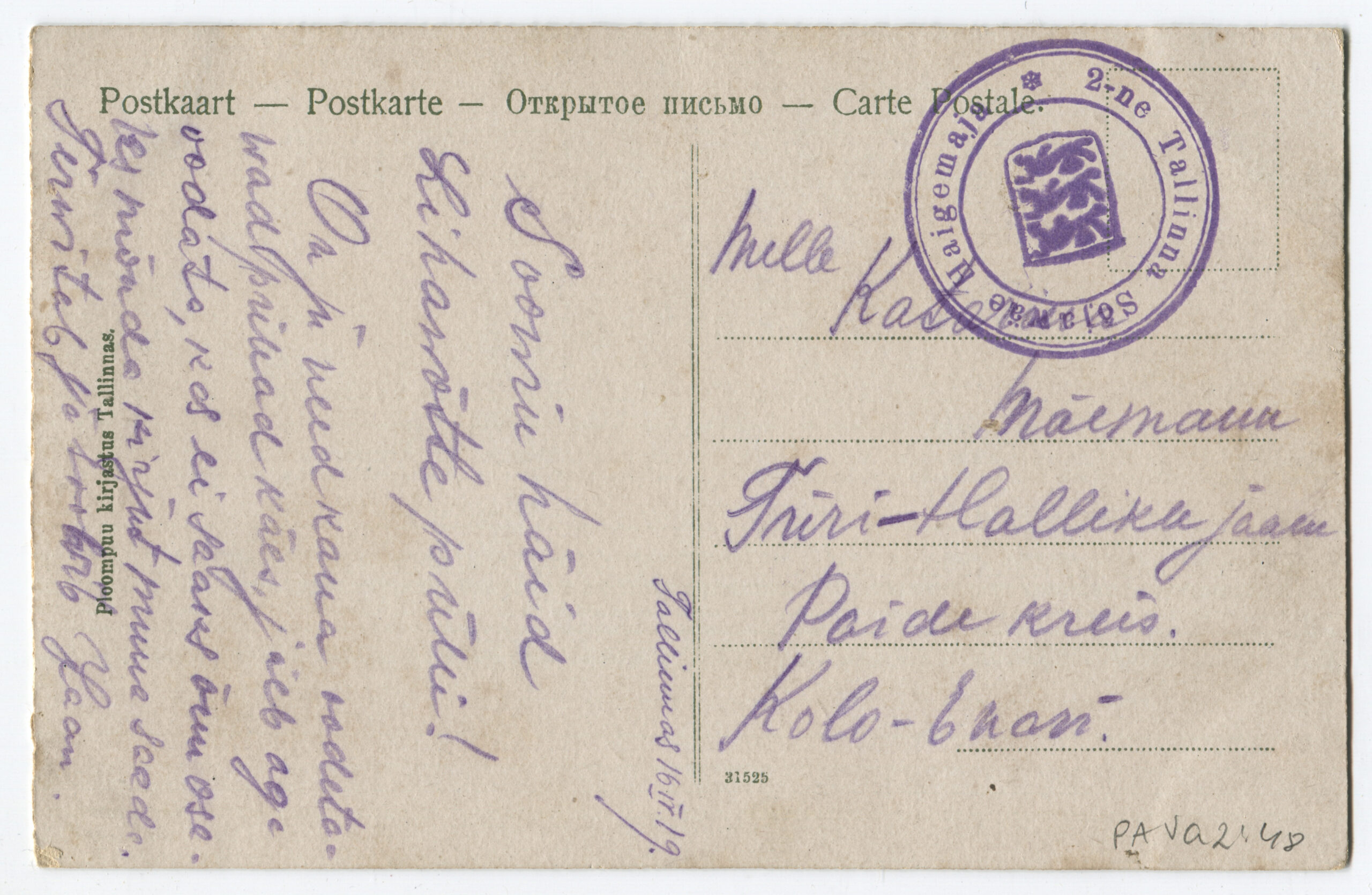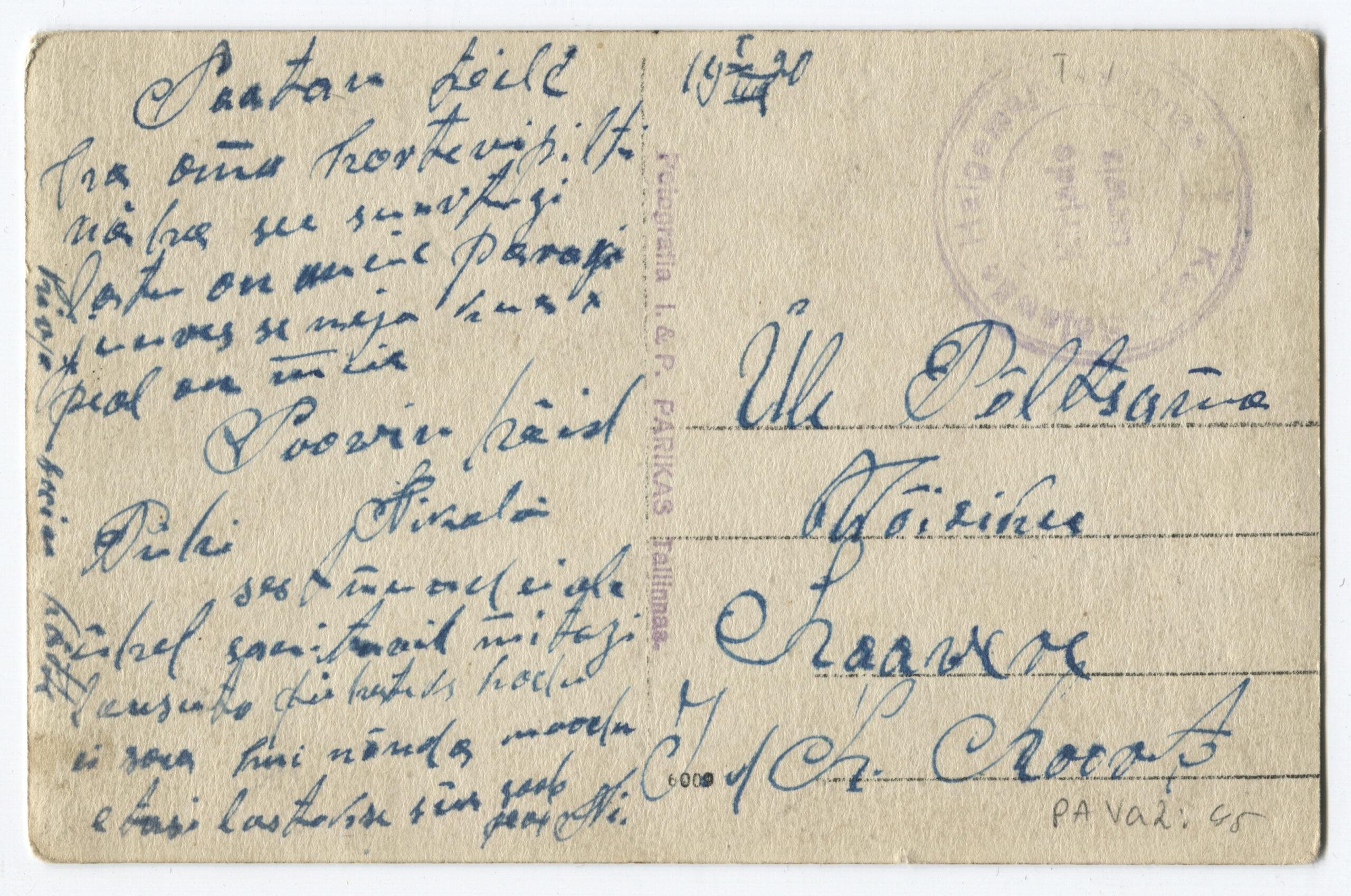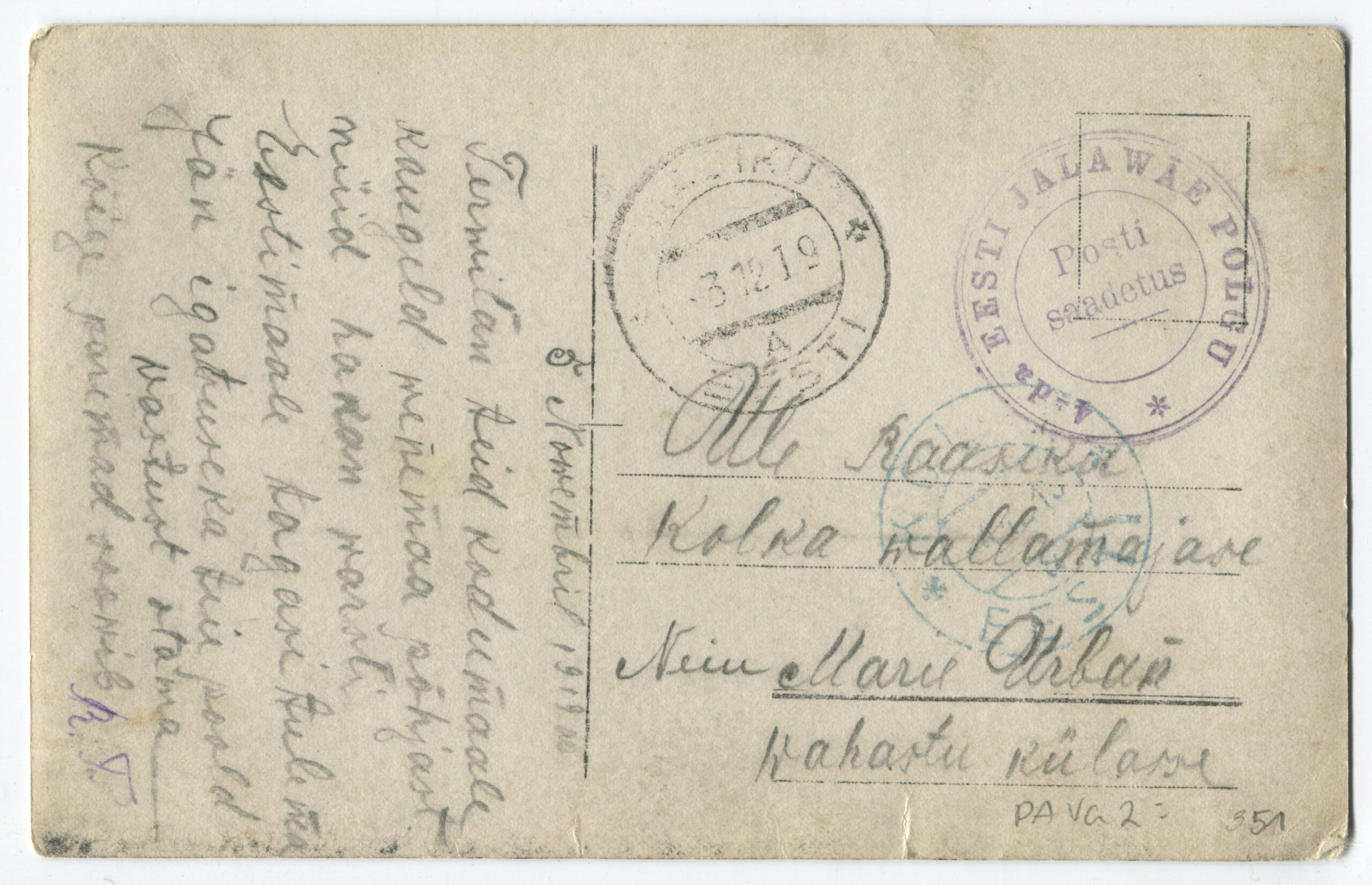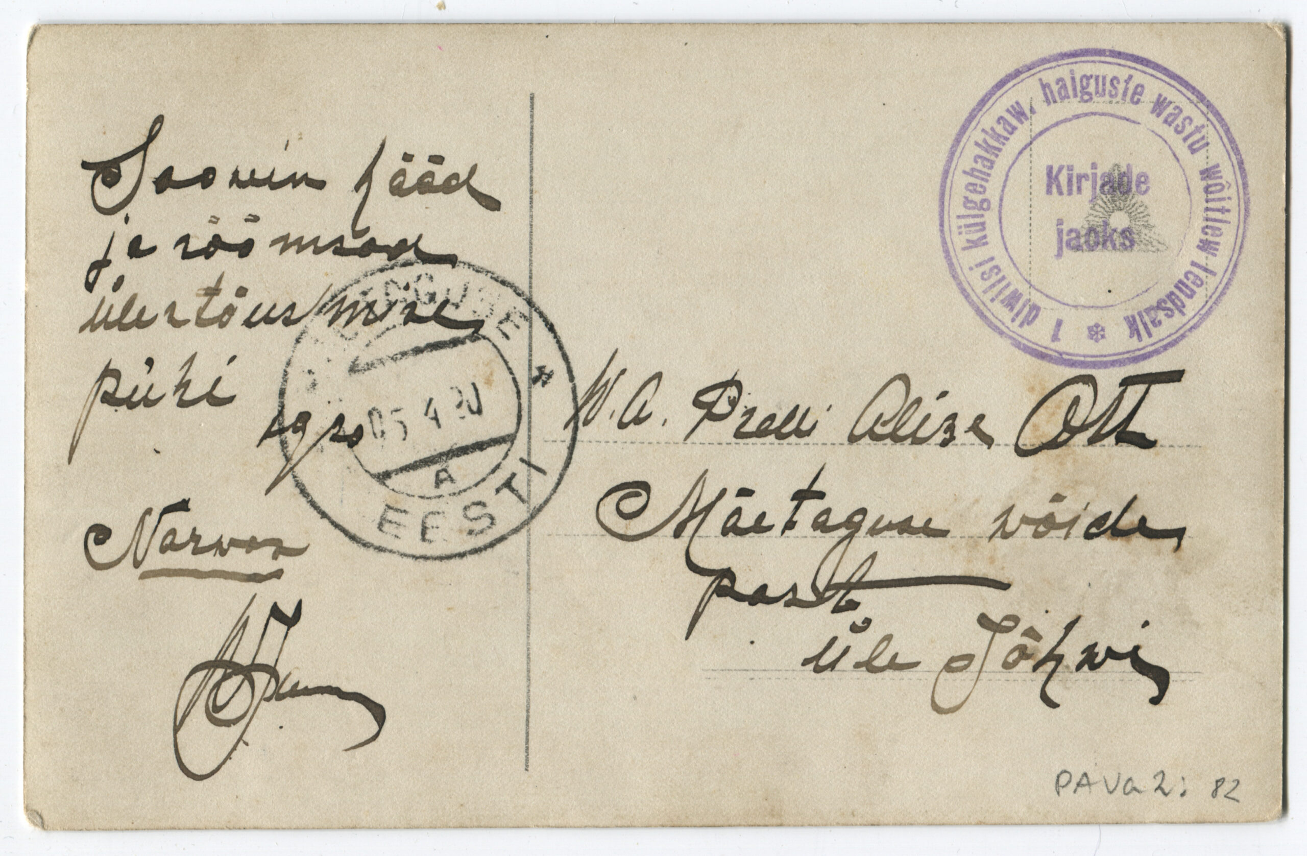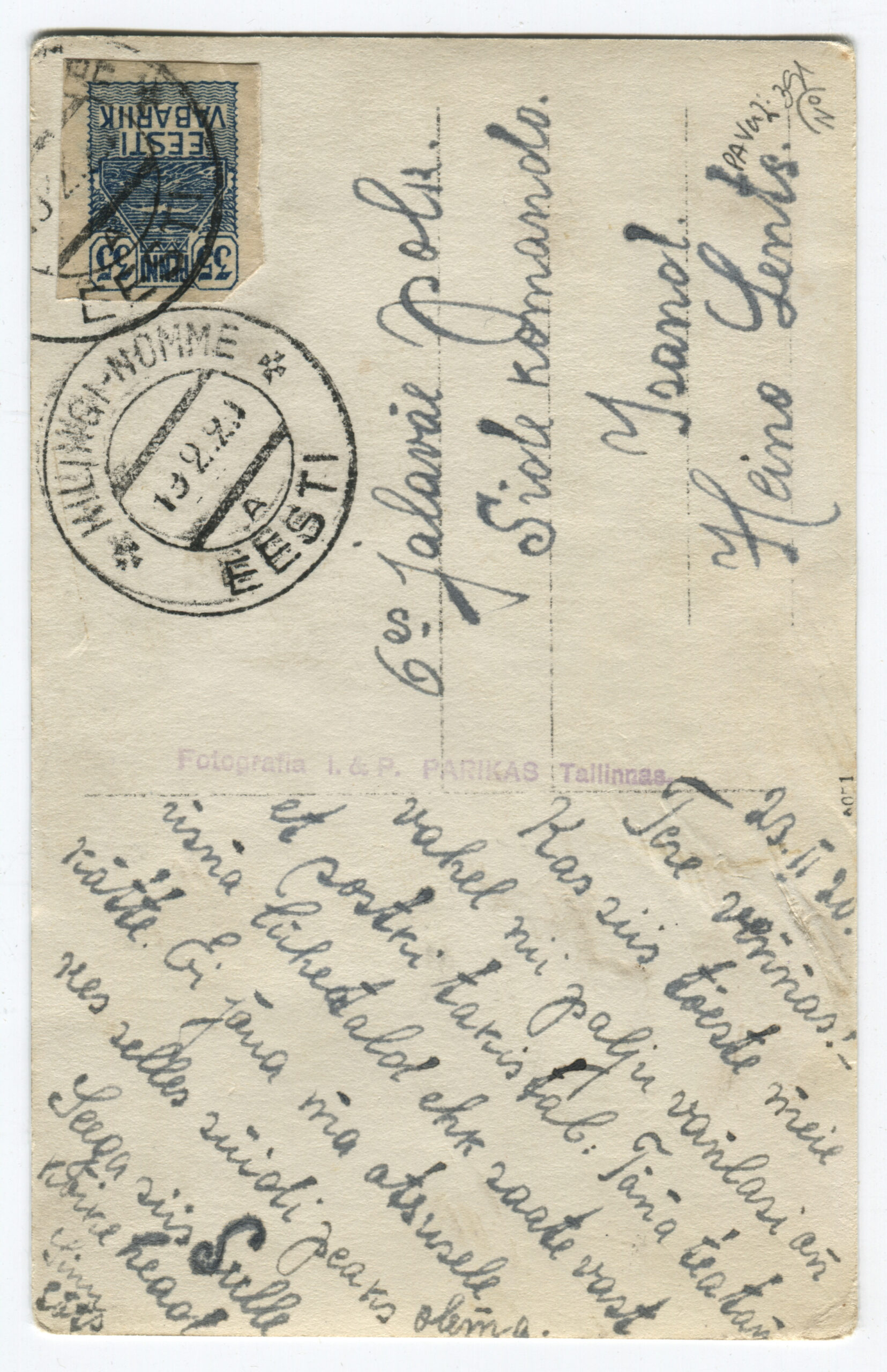 Rahvahulk Estonia teatrimaja ees Asutava Kogu avamise päeval, 23.04.1919. Foto: I. & P. Parikas Tallinnas.Kiri on saadetud 6. jalaväepolgu sidekomando teenistujale 19.02.1920. 6. jalaväepolgu sidekomando ülemaks määrati 20.02.1919 leitnant Aleksander Kulbusch (Kulgver). 23.10.1919 sai ta alamkapteni auastme.