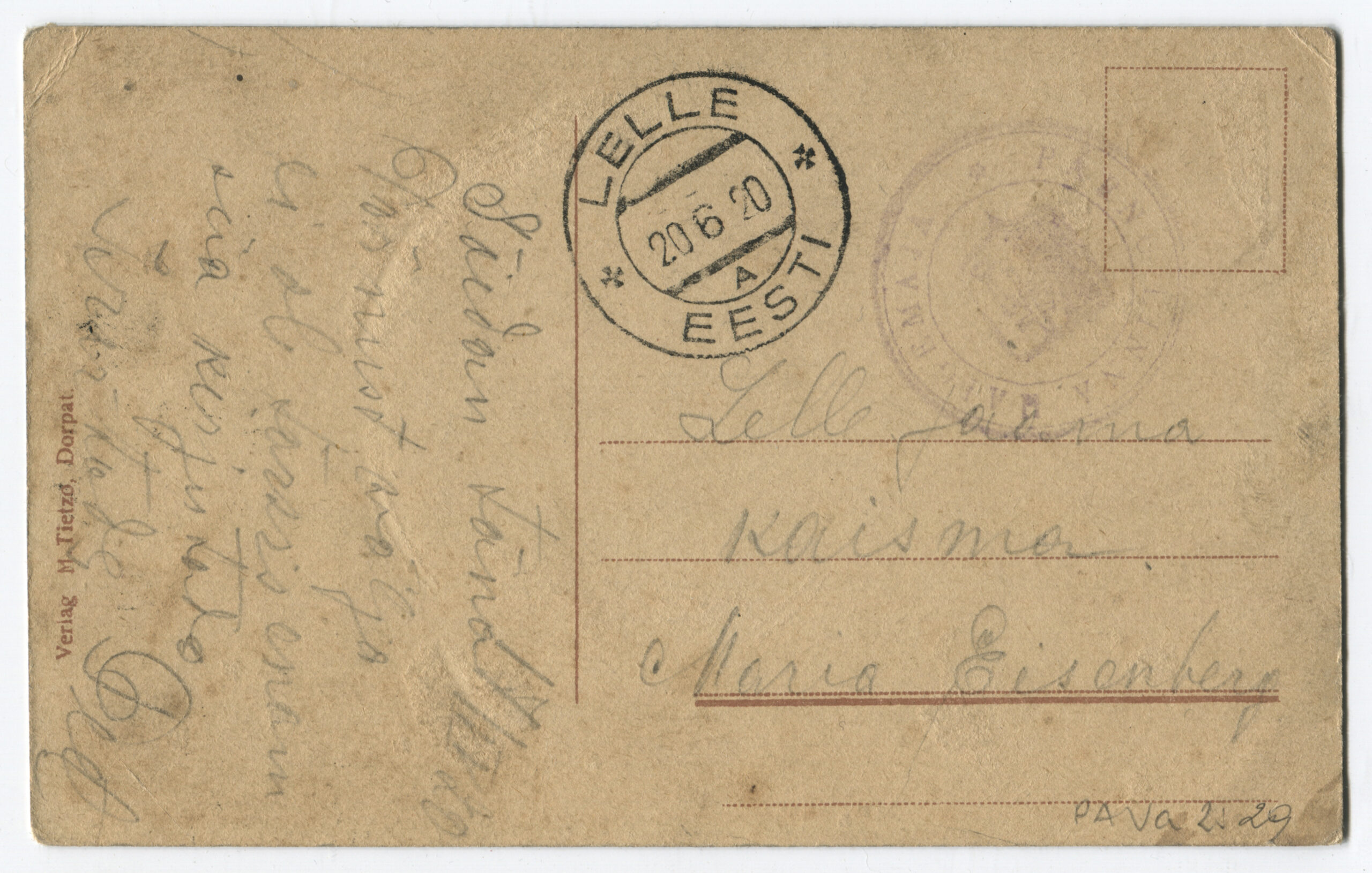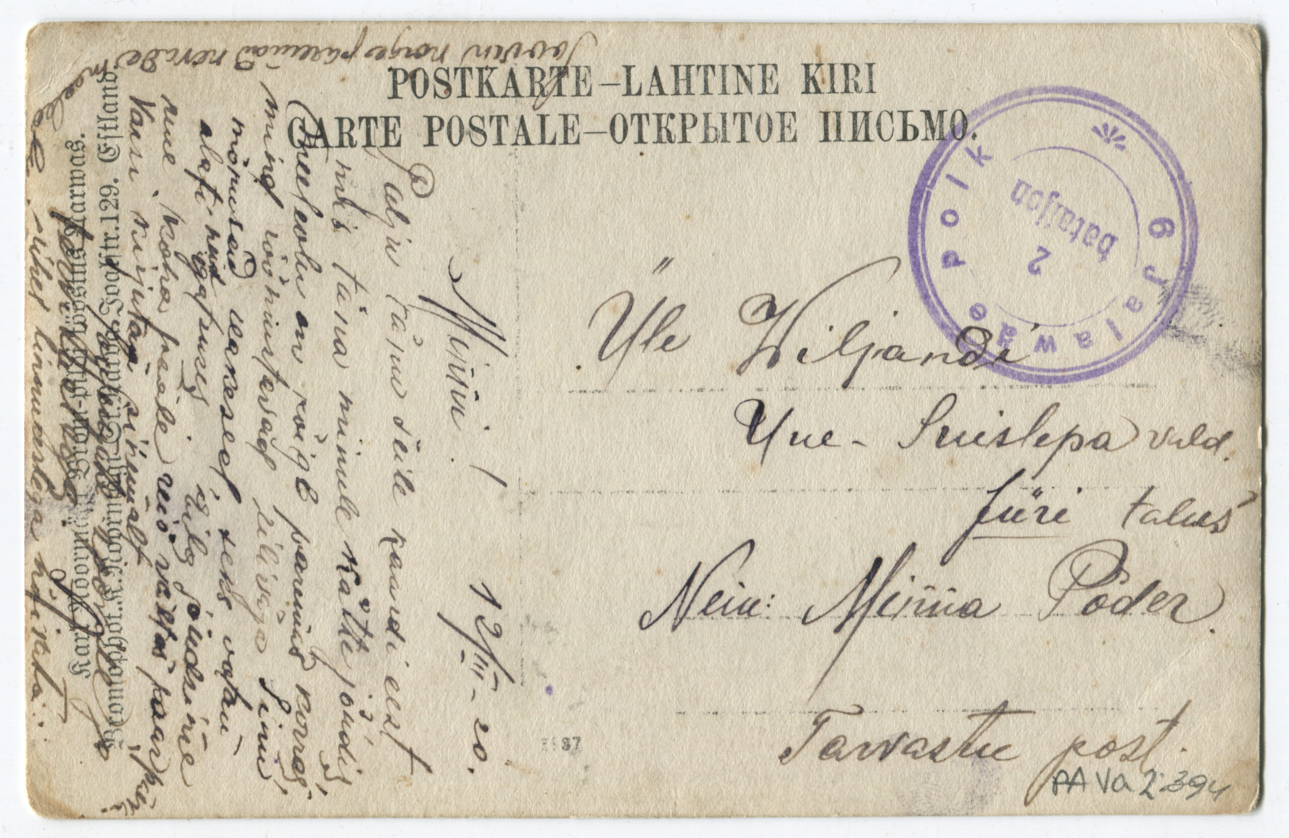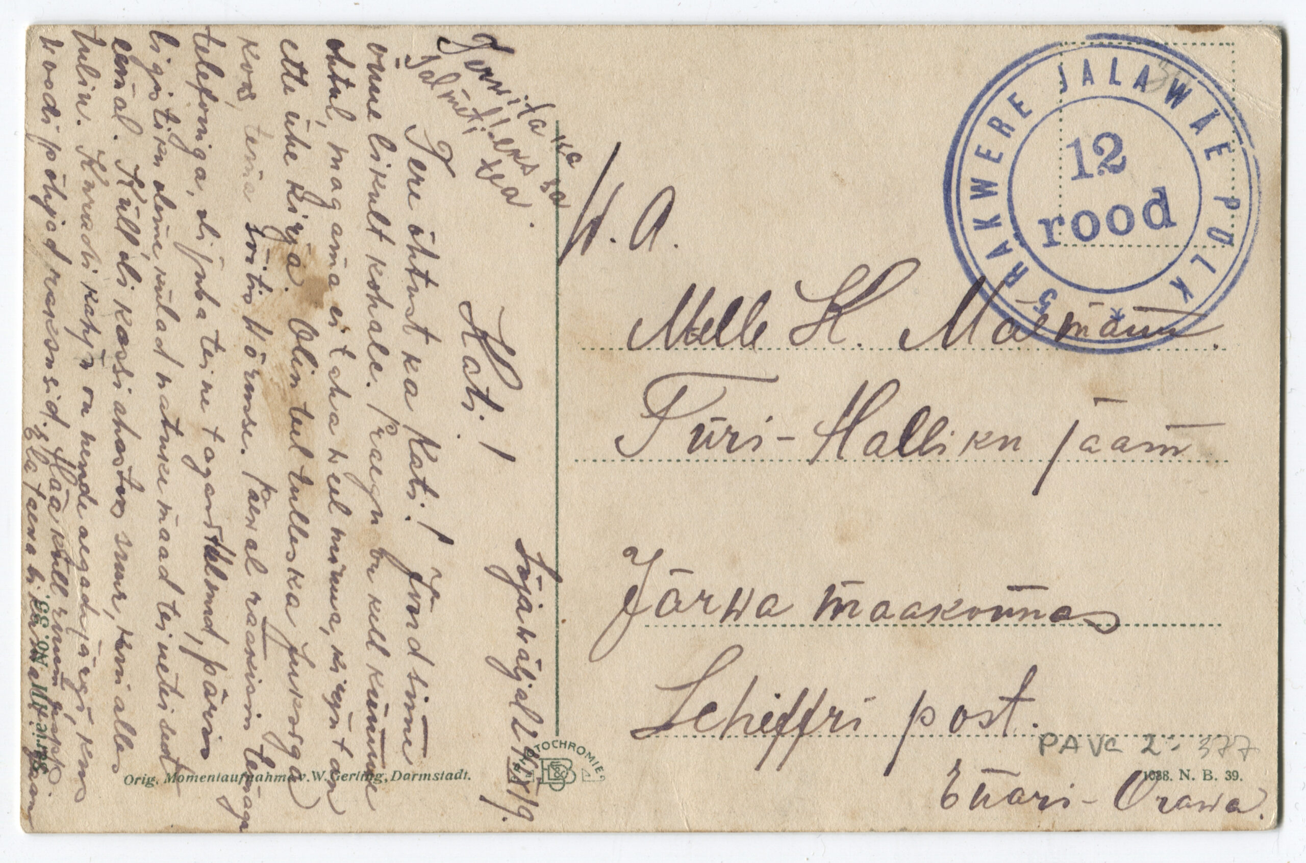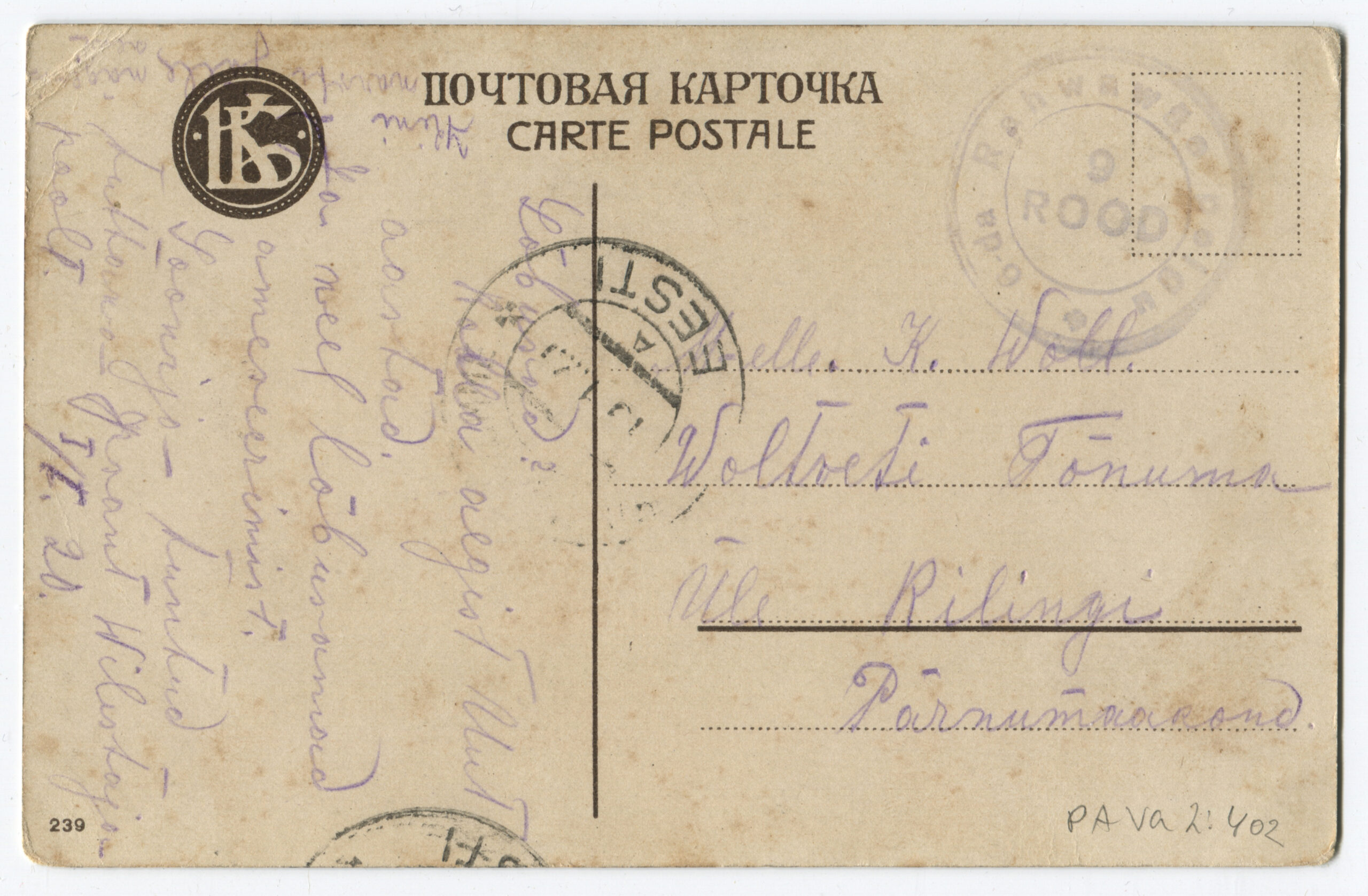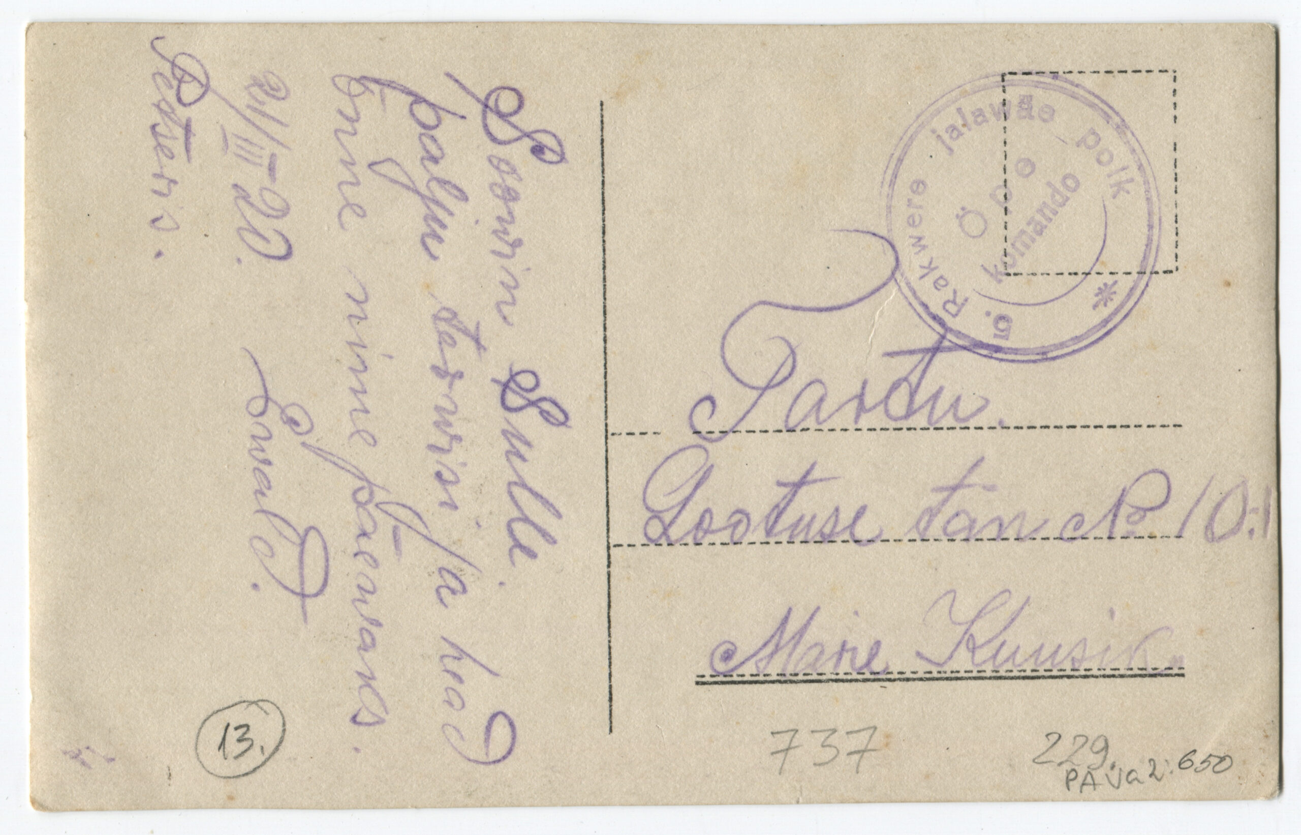 Rahvahulk Estonia teatrimaja ees Asutava Kogu avamise päeval, 23.04.1919. Foto: I. & P. Parikas Tallinnas.Kiri on saadetud 6. jalaväepolgu sidekomando teenistujale 19.02.1920. 6. jalaväepolgu sidekomando ülemaks määrati 20.02.1919 leitnant Aleksander Kulbusch (Kulgver). 23.10.1919 sai ta alamkapteni auastme.