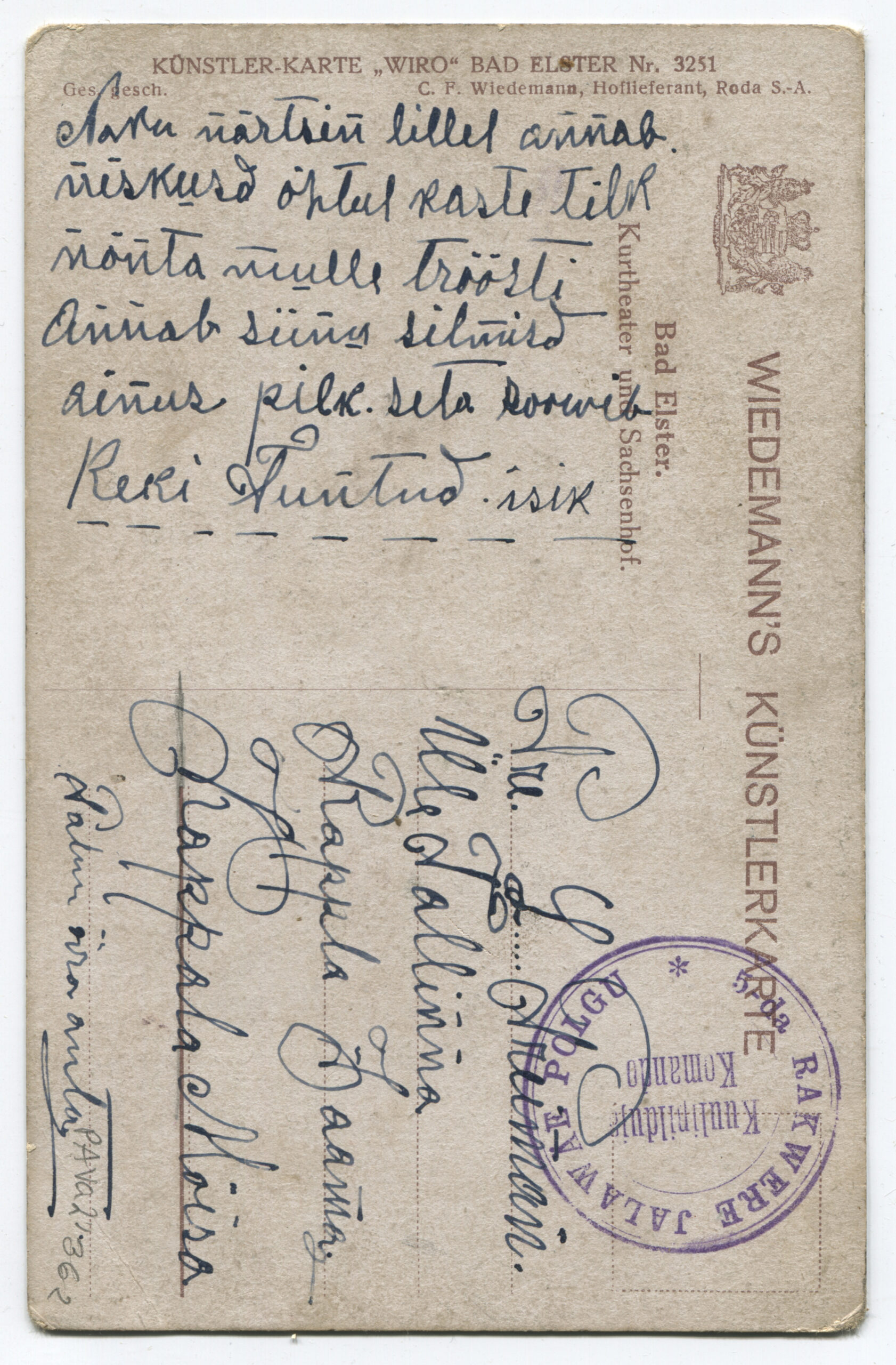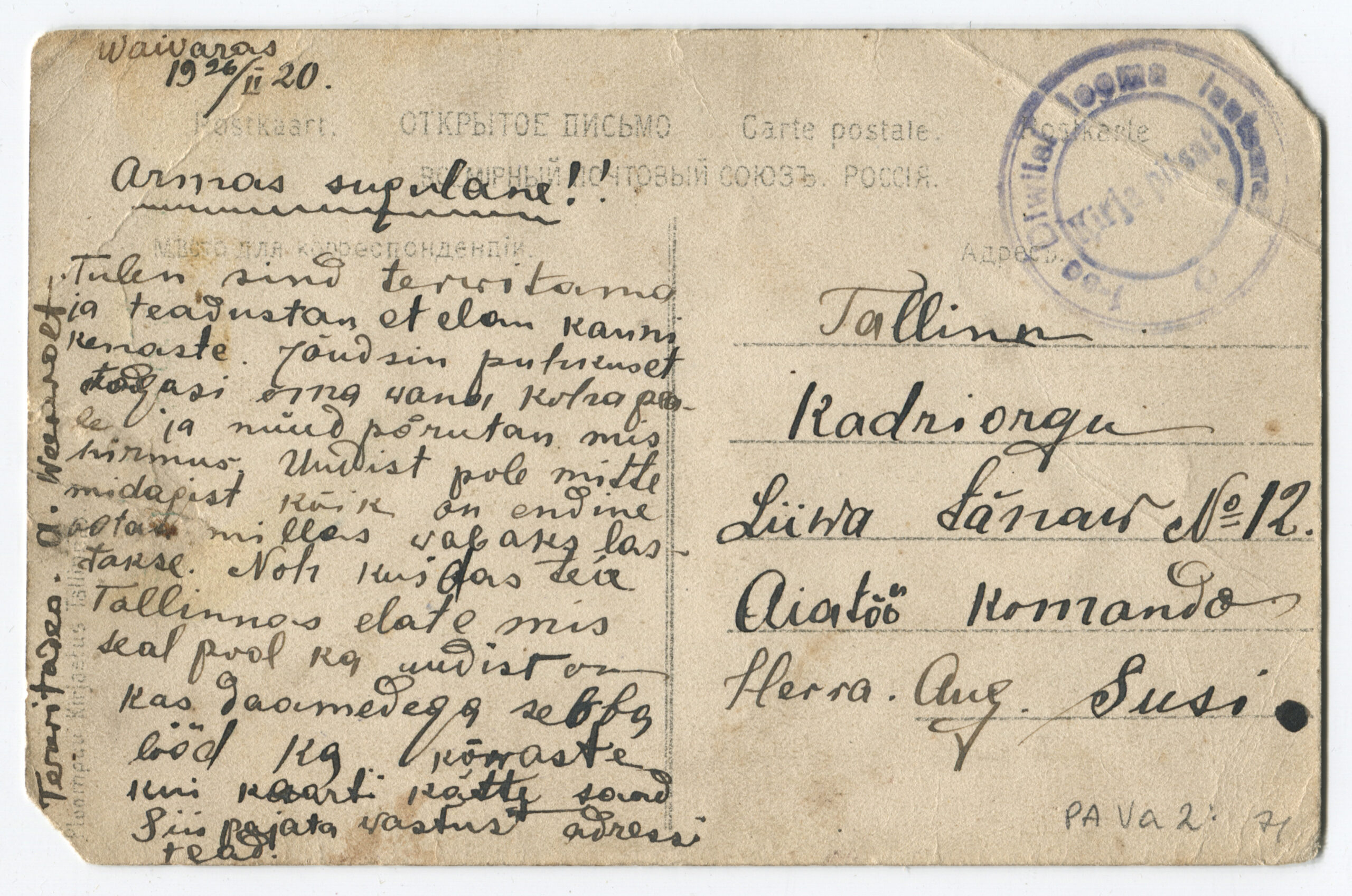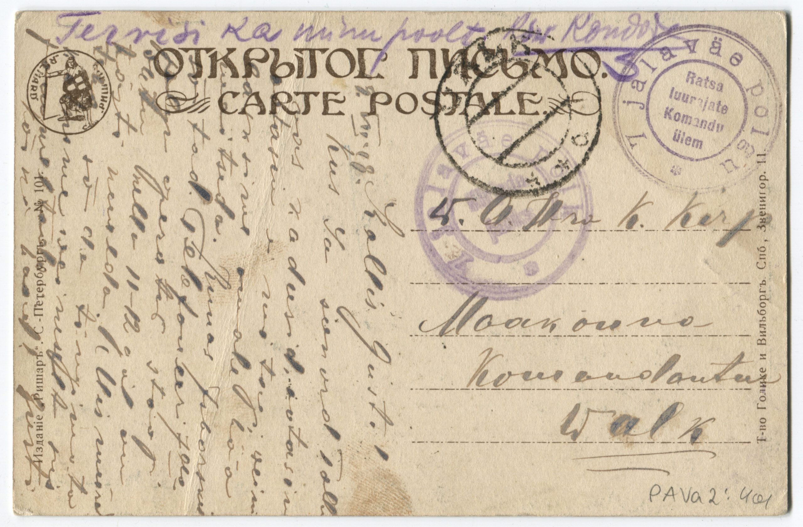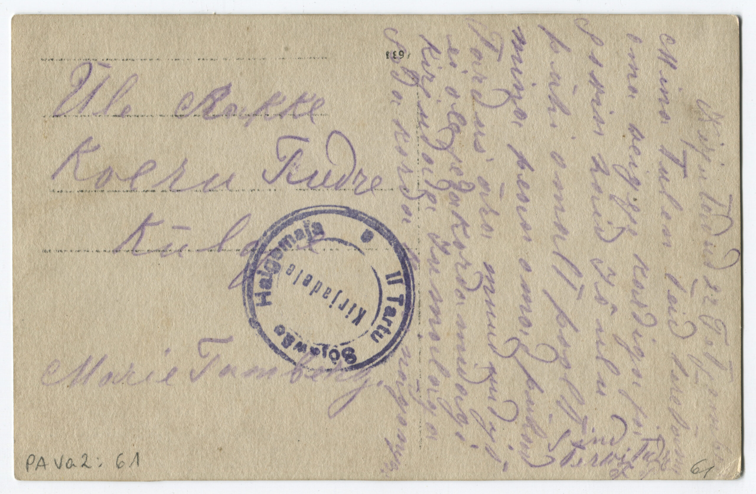 Rahvahulk Estonia teatrimaja ees Asutava Kogu avamise päeval, 23.04.1919. Foto: I. & P. Parikas Tallinnas.Kiri on saadetud 6. jalaväepolgu sidekomando teenistujale 19.02.1920. 6. jalaväepolgu sidekomando ülemaks määrati 20.02.1919 leitnant Aleksander Kulbusch (Kulgver). 23.10.1919 sai ta alamkapteni auastme.