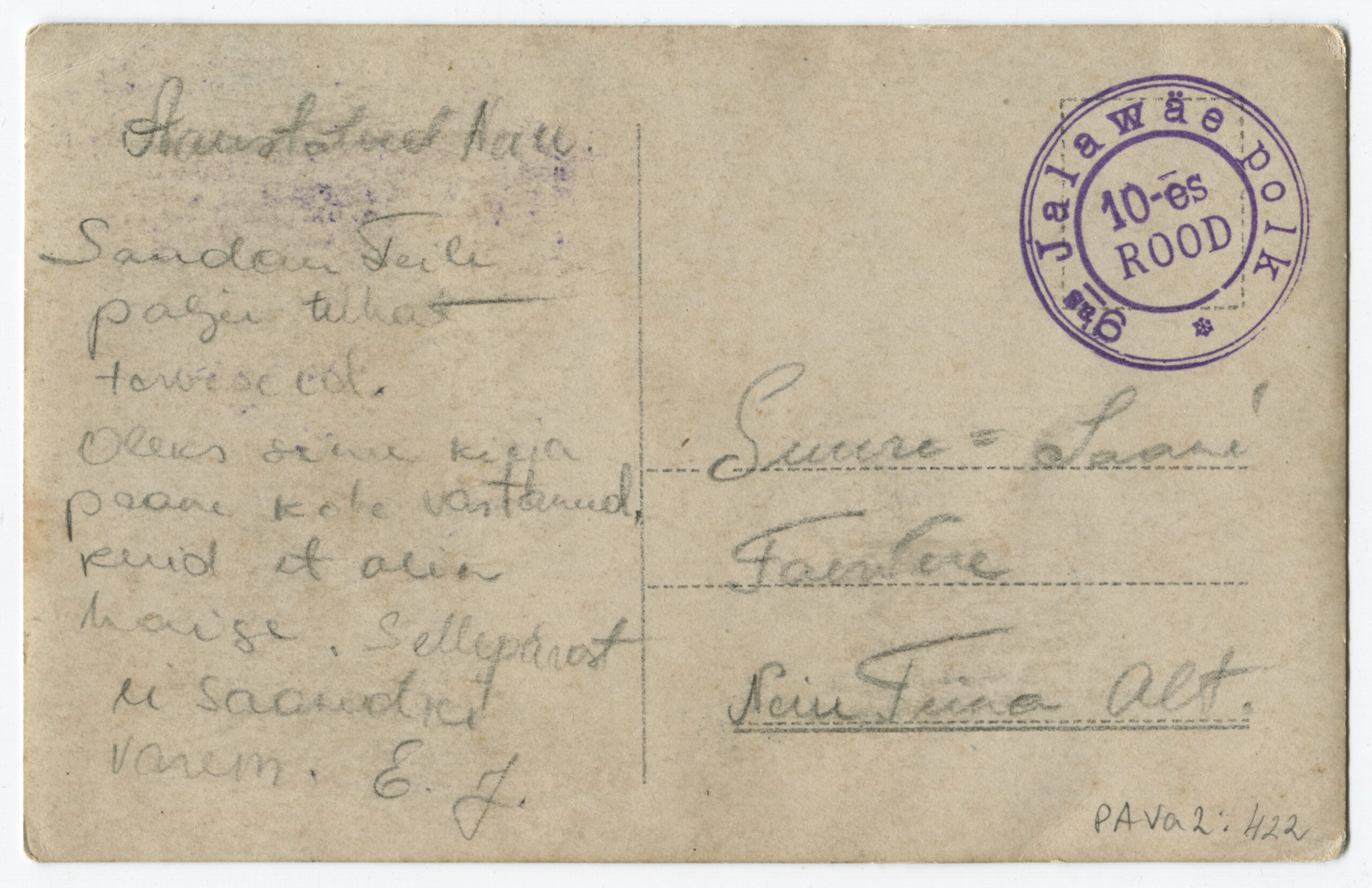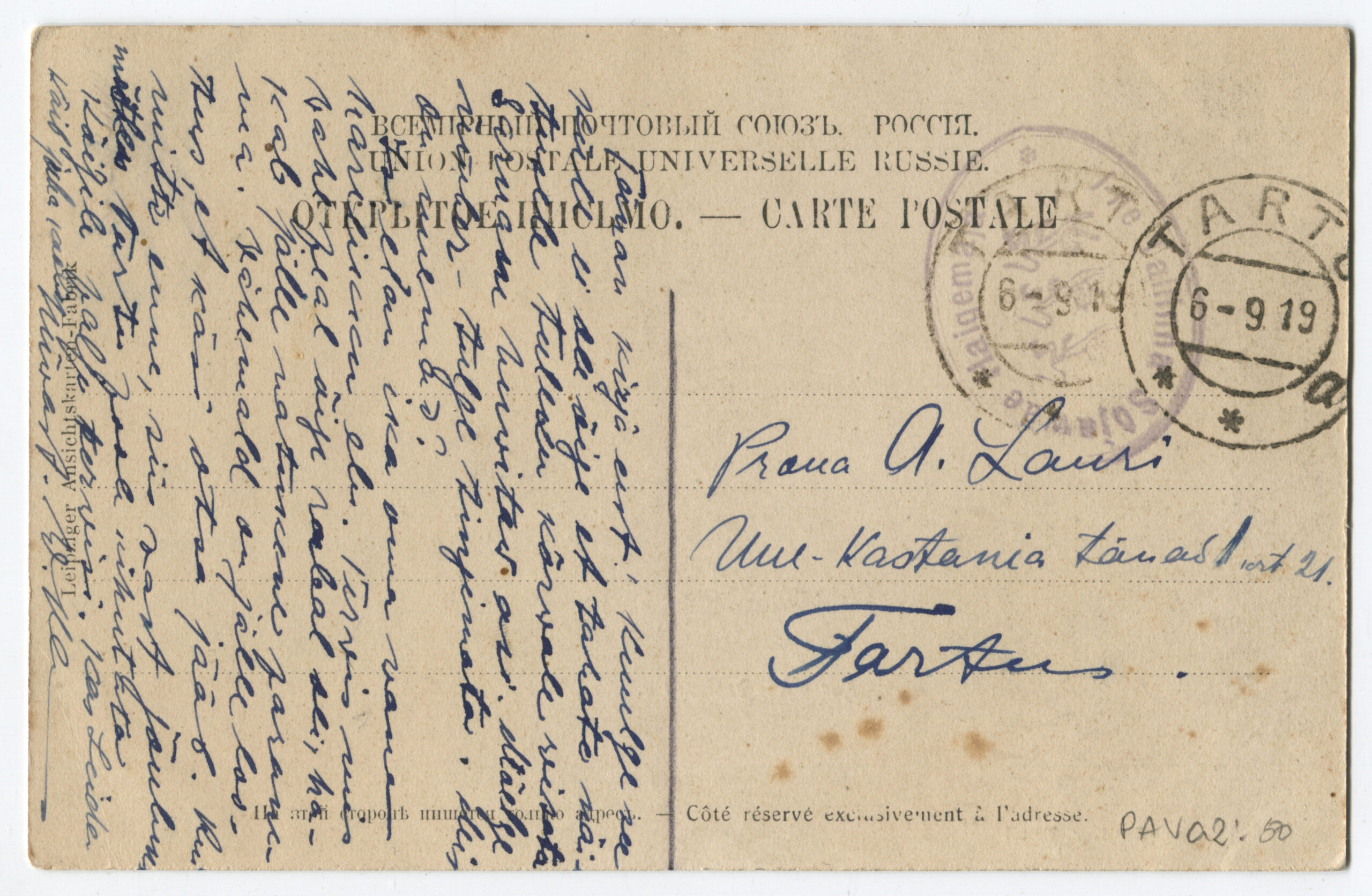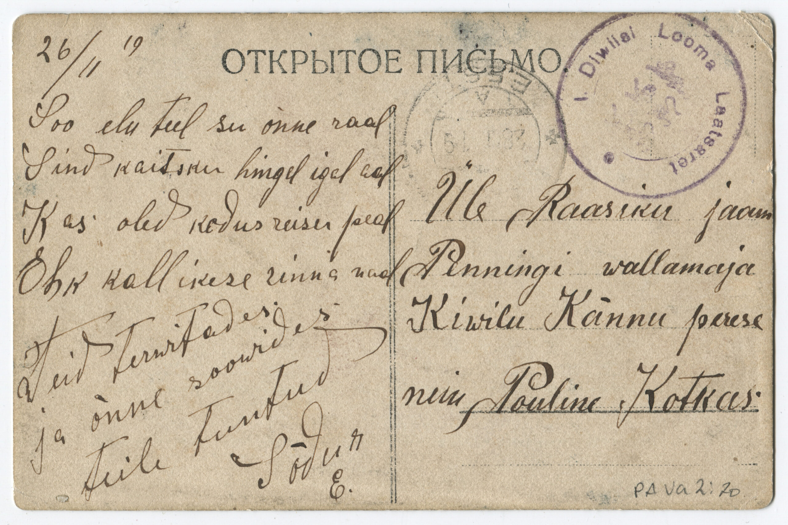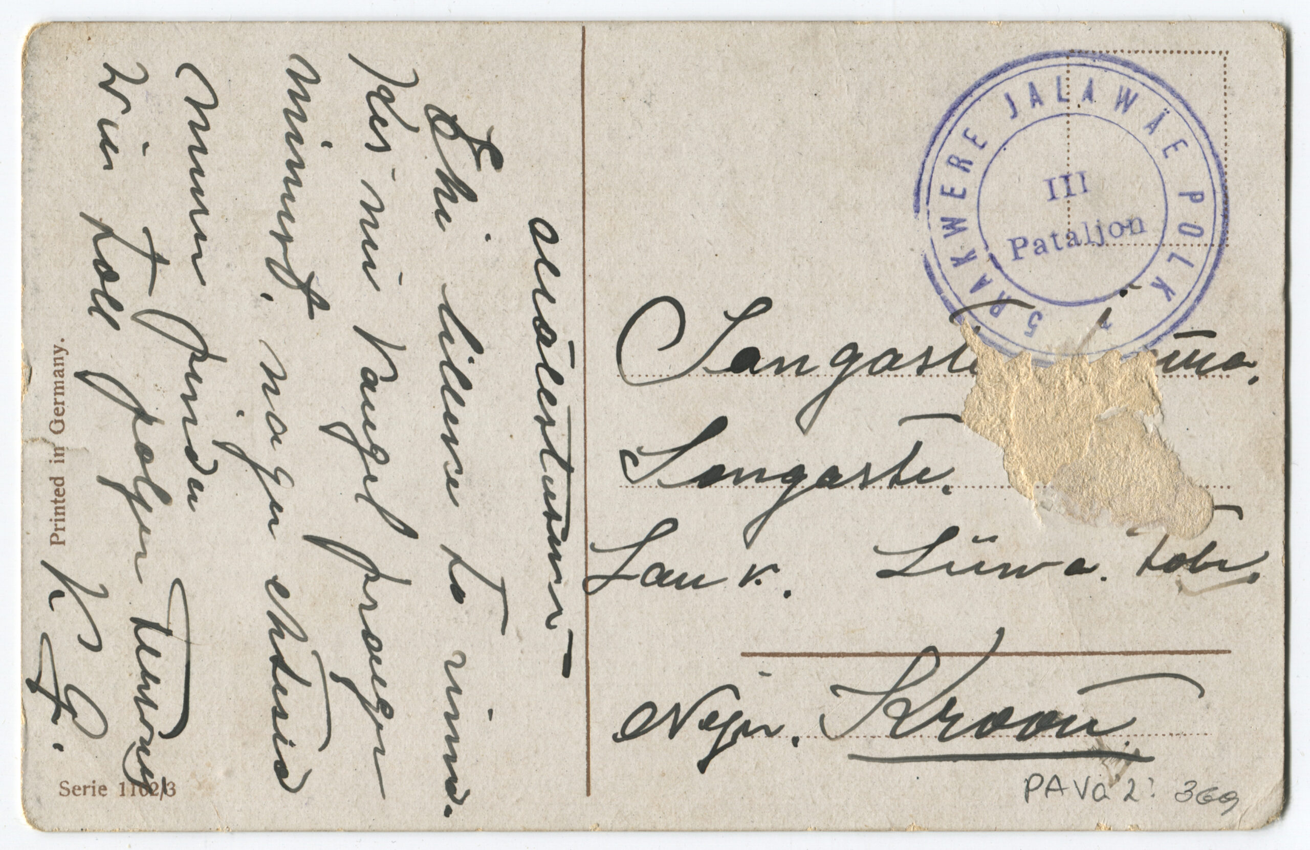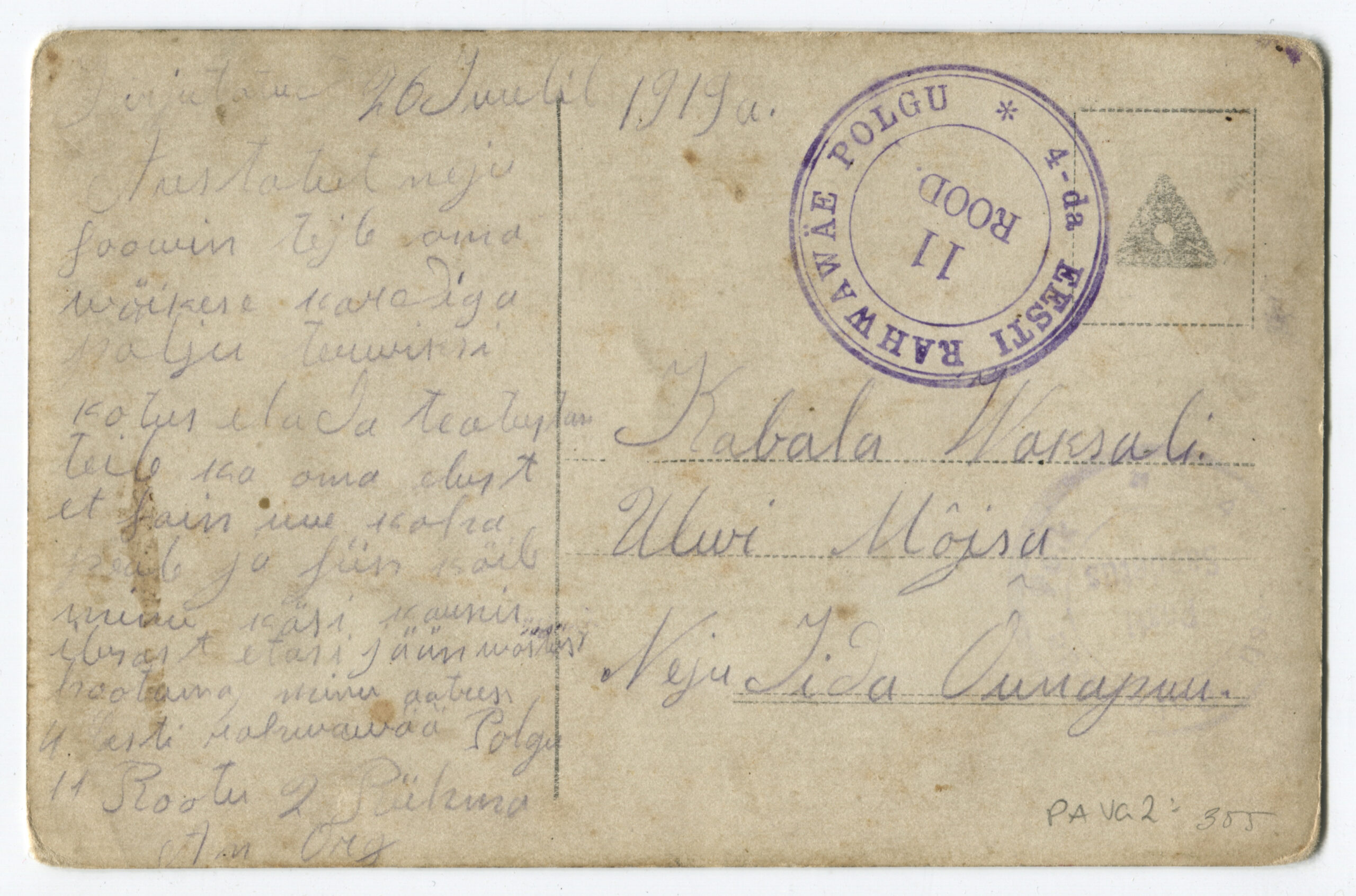Rahvahulk Estonia teatrimaja ees Asutava Kogu avamise päeval, 23.04.1919. Foto: I. & P. Parikas Tallinnas.Kiri on saadetud 6. jalaväepolgu sidekomando teenistujale 19.02.1920. 6. jalaväepolgu sidekomando ülemaks määrati 20.02.1919 leitnant Aleksander Kulbusch (Kulgver). 23.10.1919 sai ta alamkapteni auastme.