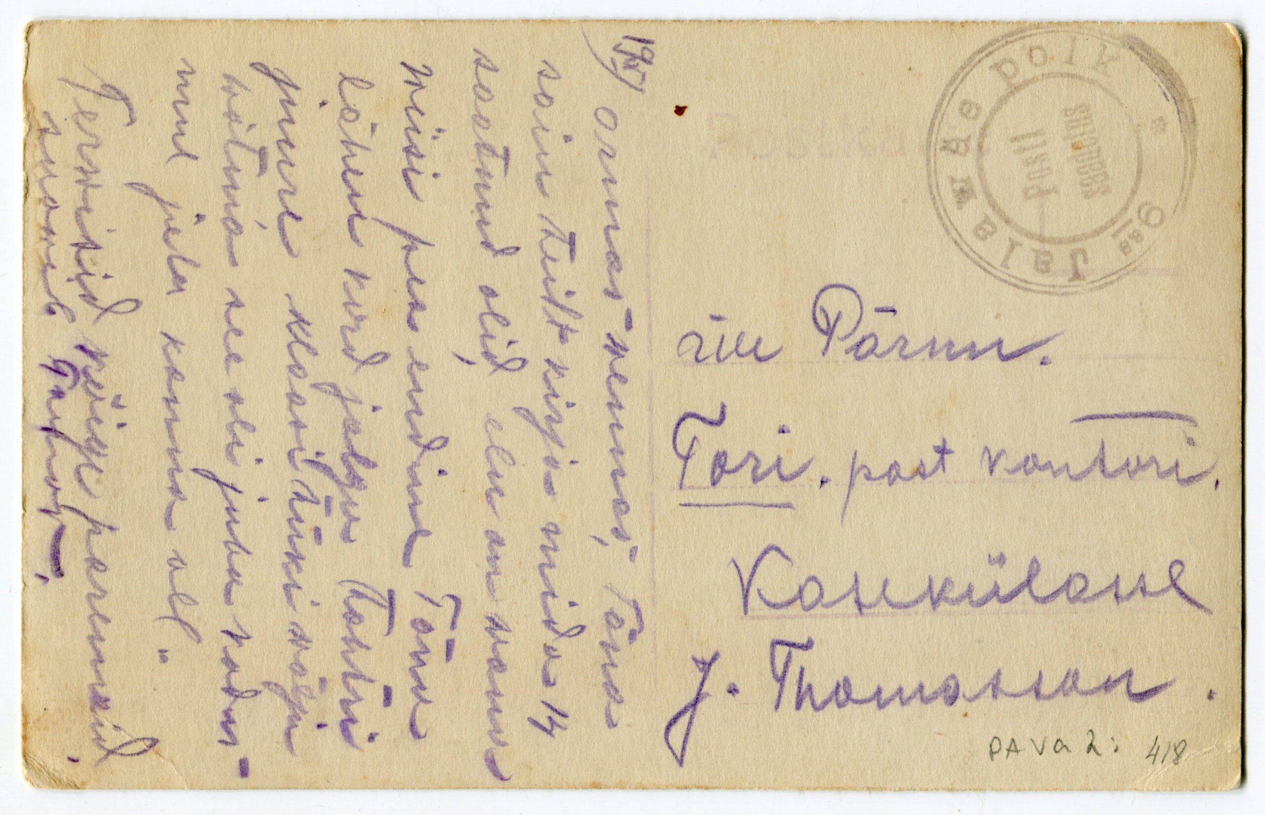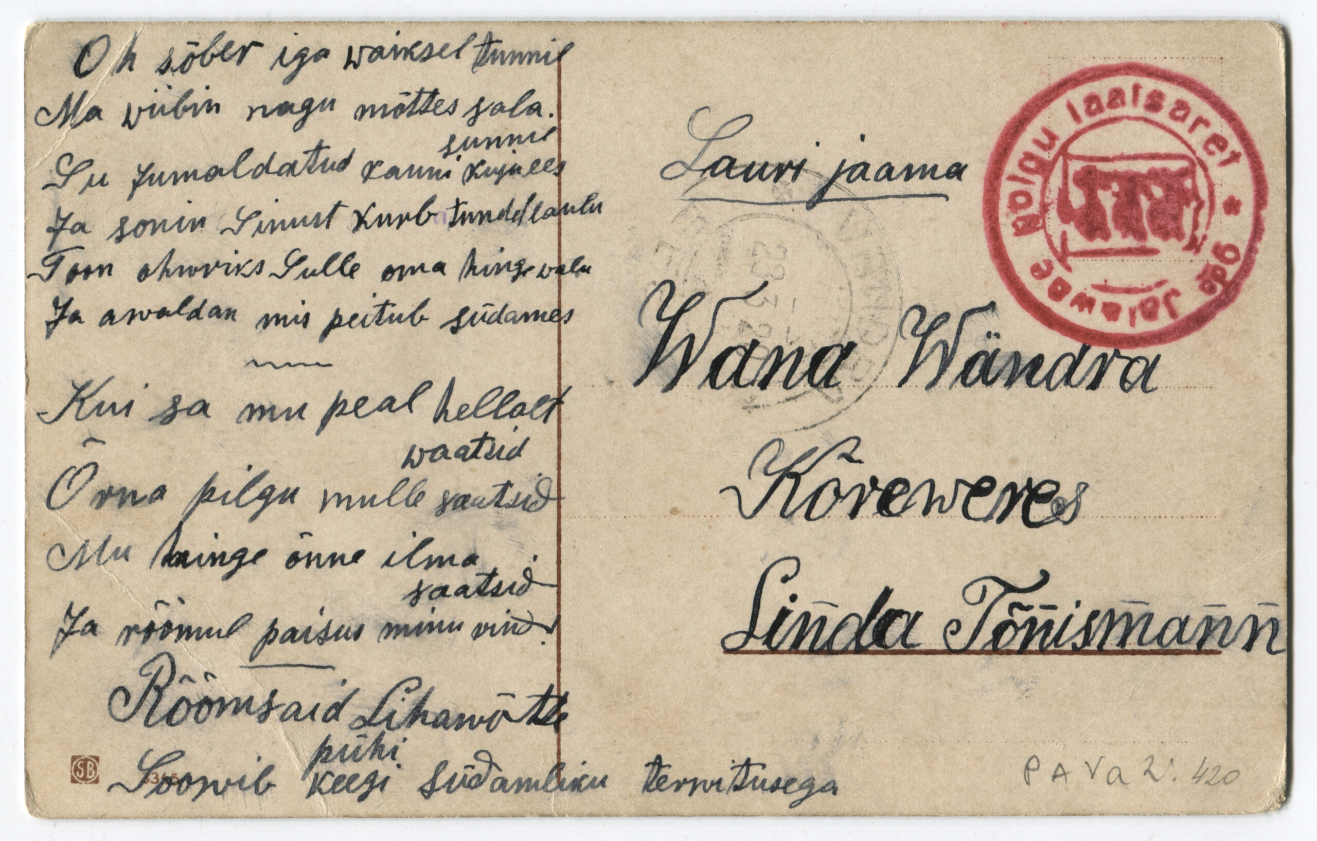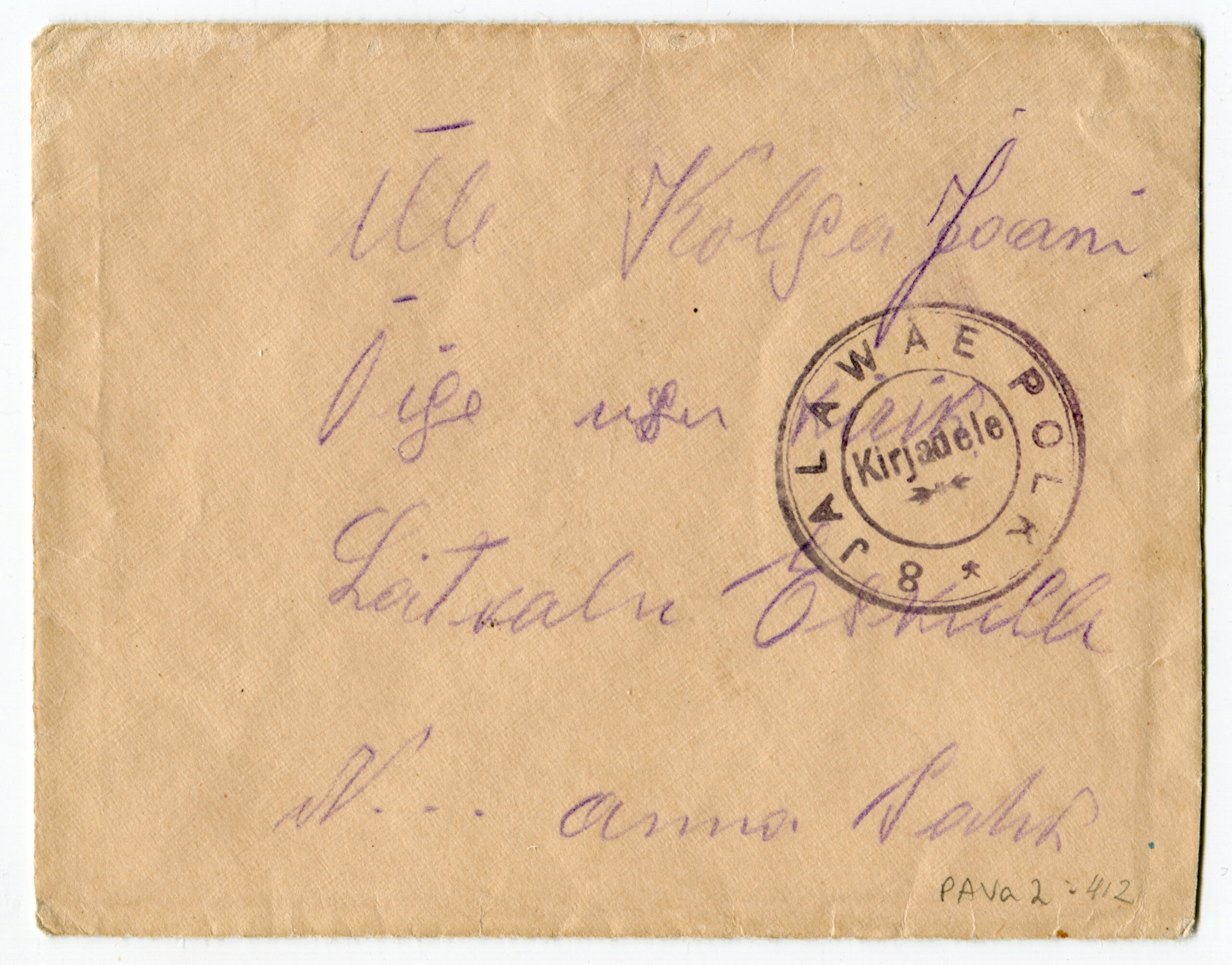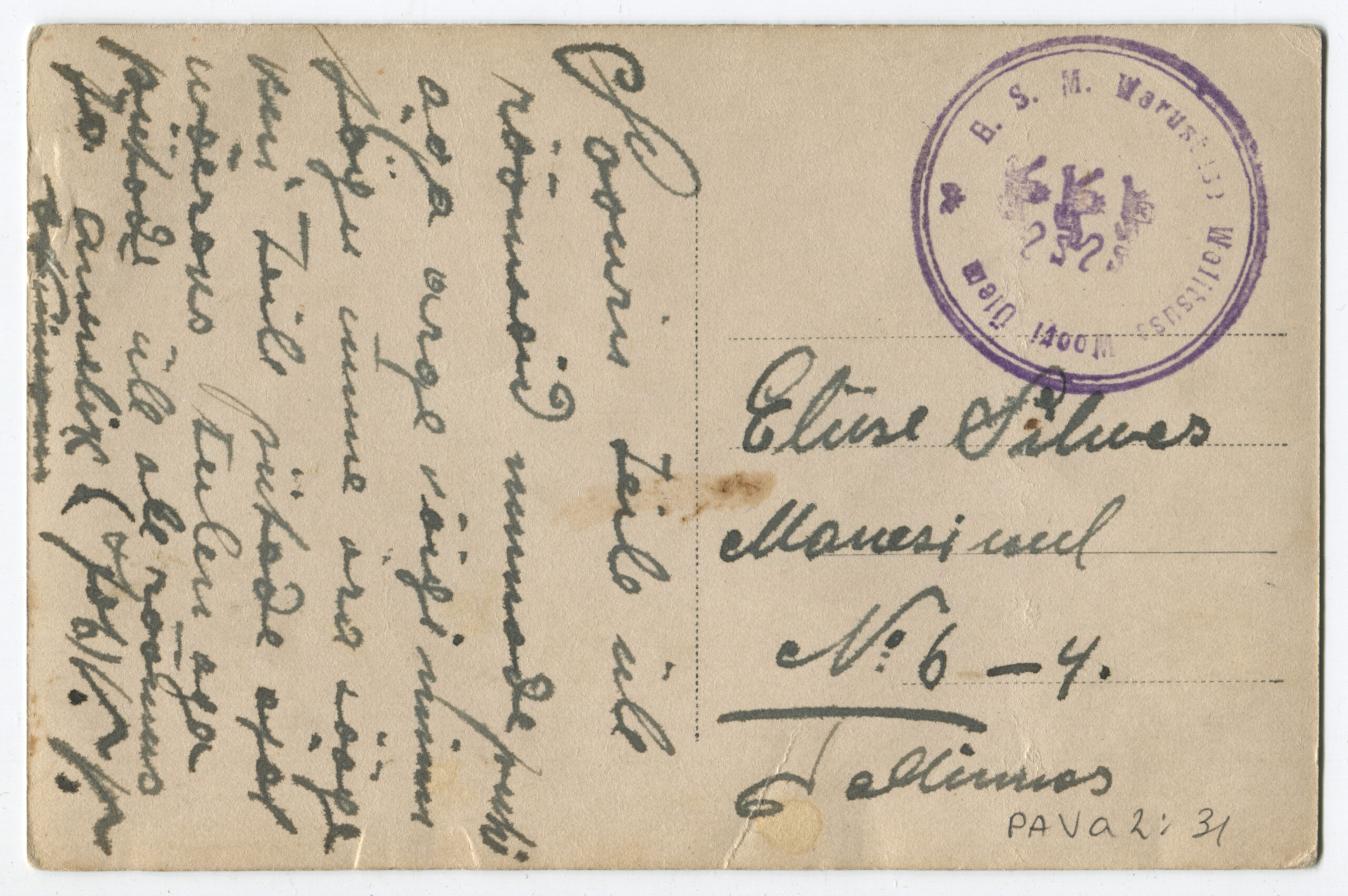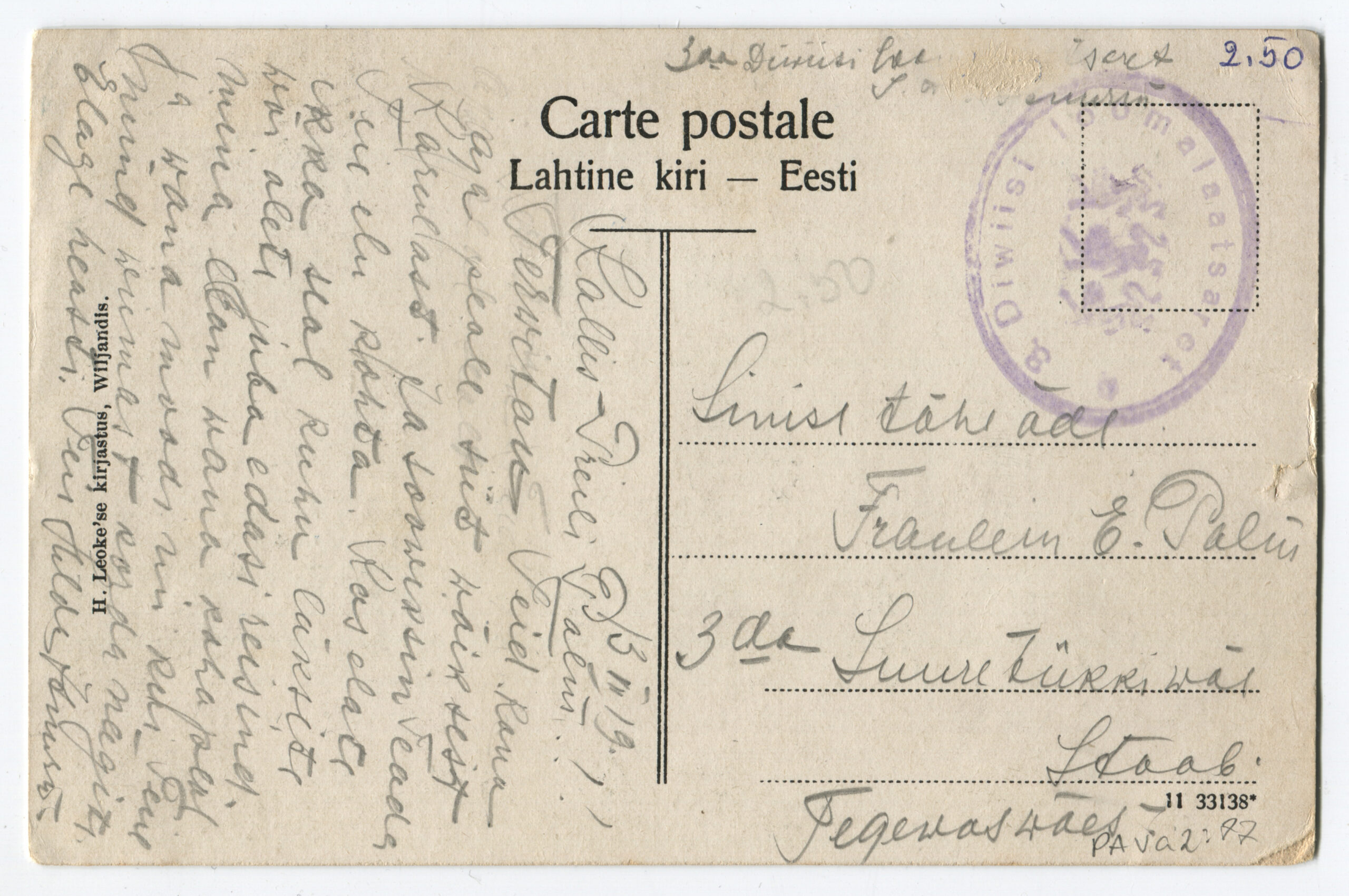 Rahvahulk Estonia teatrimaja ees Asutava Kogu avamise päeval, 23.04.1919. Foto: I. & P. Parikas Tallinnas.Kiri on saadetud 6. jalaväepolgu sidekomando teenistujale 19.02.1920. 6. jalaväepolgu sidekomando ülemaks määrati 20.02.1919 leitnant Aleksander Kulbusch (Kulgver). 23.10.1919 sai ta alamkapteni auastme.
