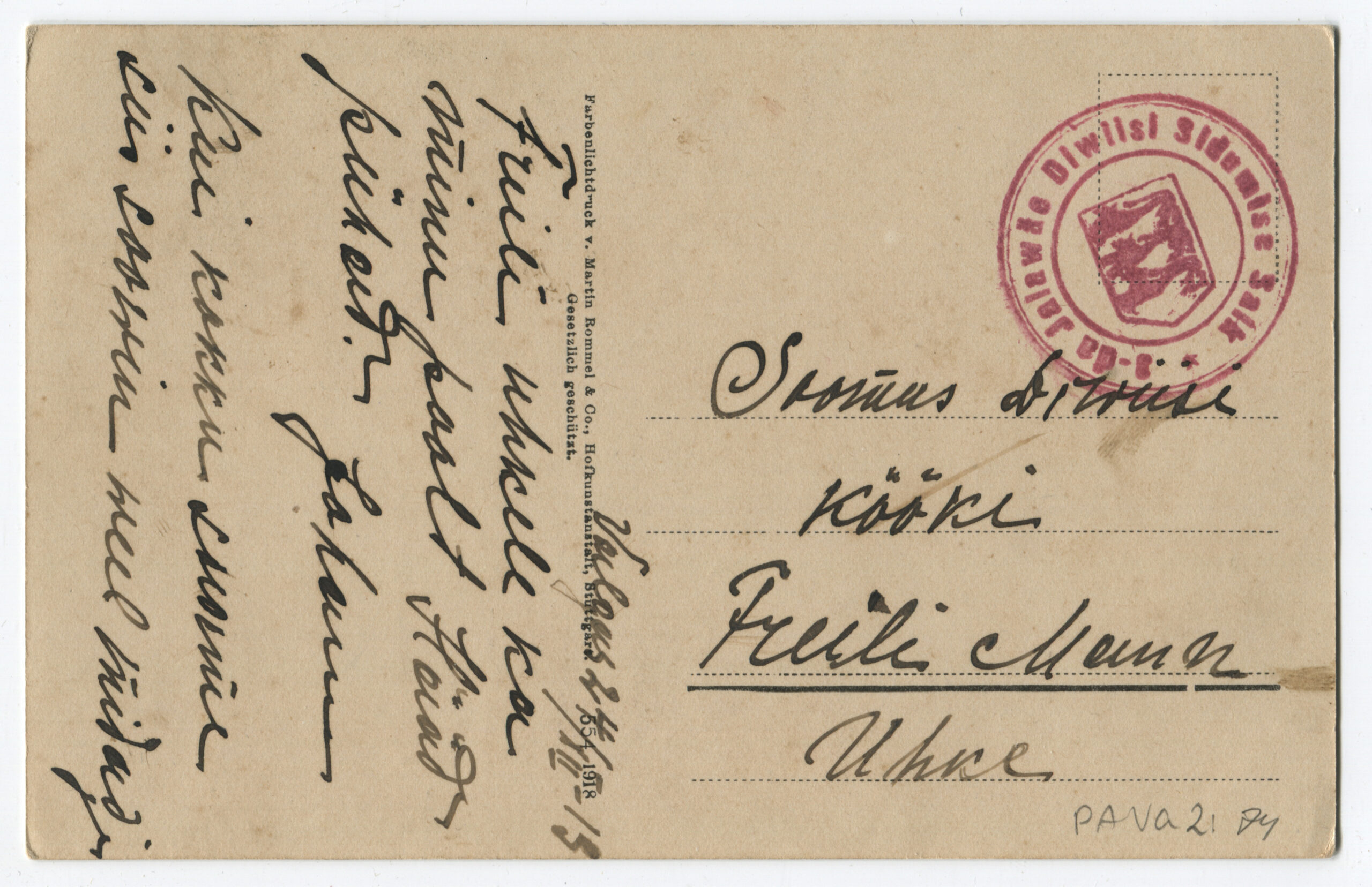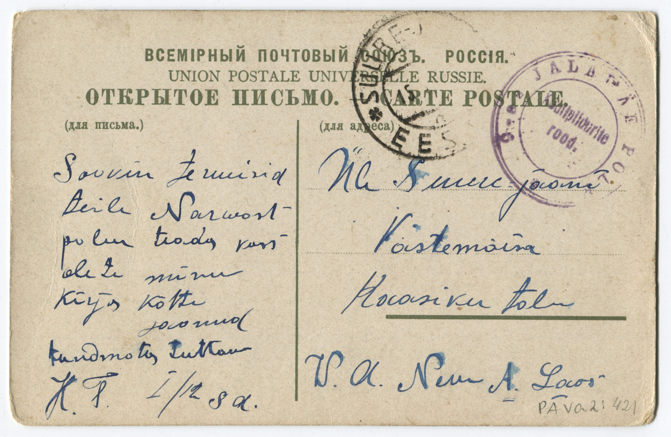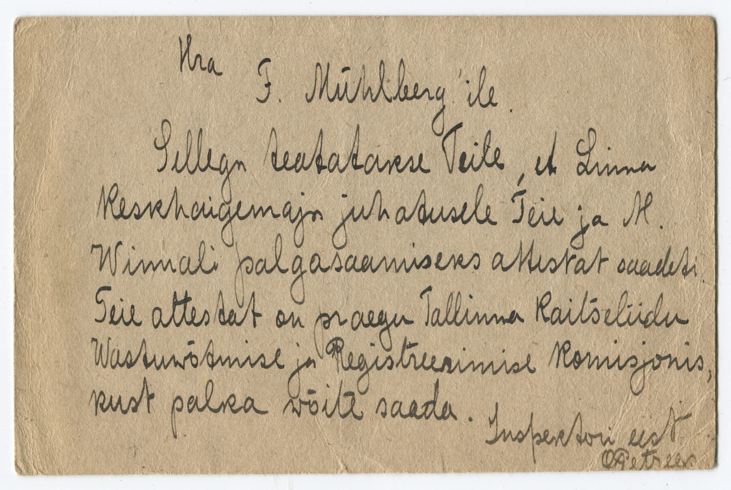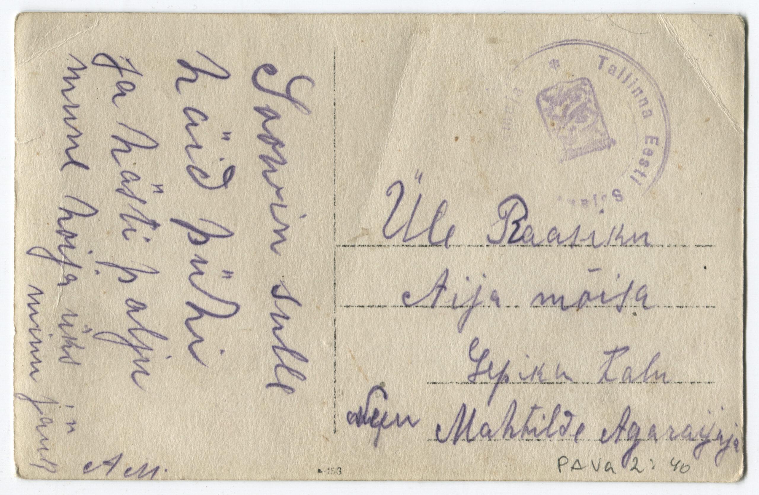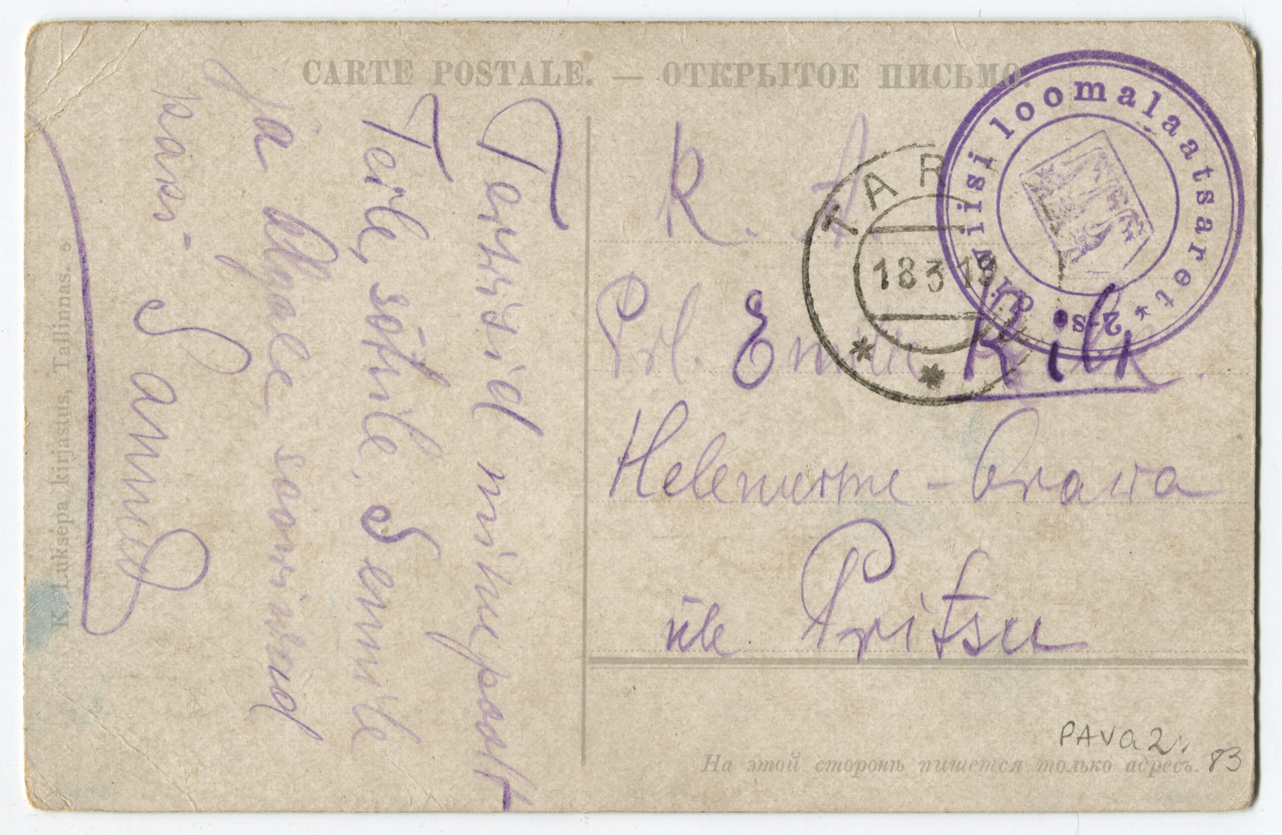 Rahvahulk Estonia teatrimaja ees Asutava Kogu avamise päeval, 23.04.1919. Foto: I. & P. Parikas Tallinnas.Kiri on saadetud 6. jalaväepolgu sidekomando teenistujale 19.02.1920. 6. jalaväepolgu sidekomando ülemaks määrati 20.02.1919 leitnant Aleksander Kulbusch (Kulgver). 23.10.1919 sai ta alamkapteni auastme.
