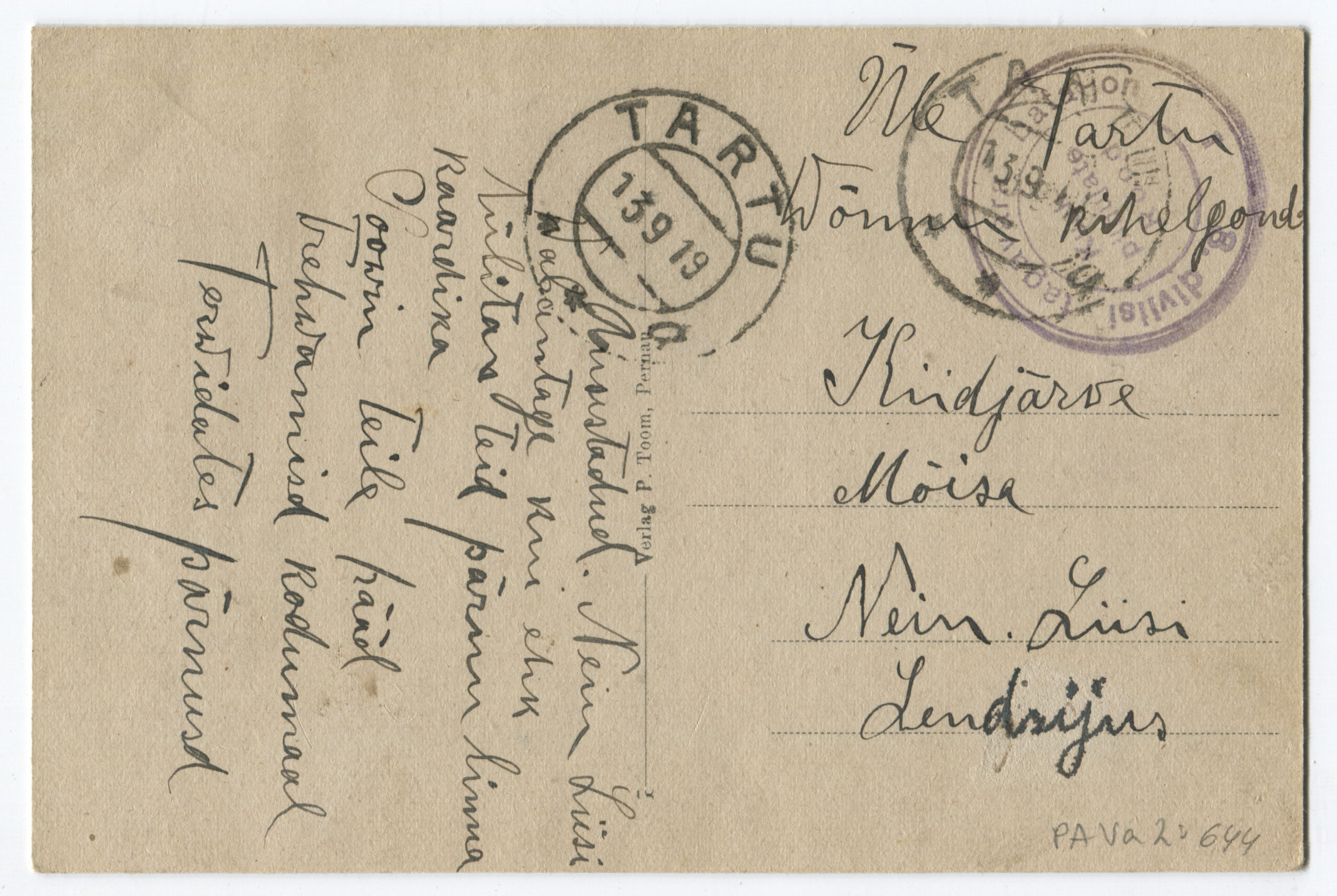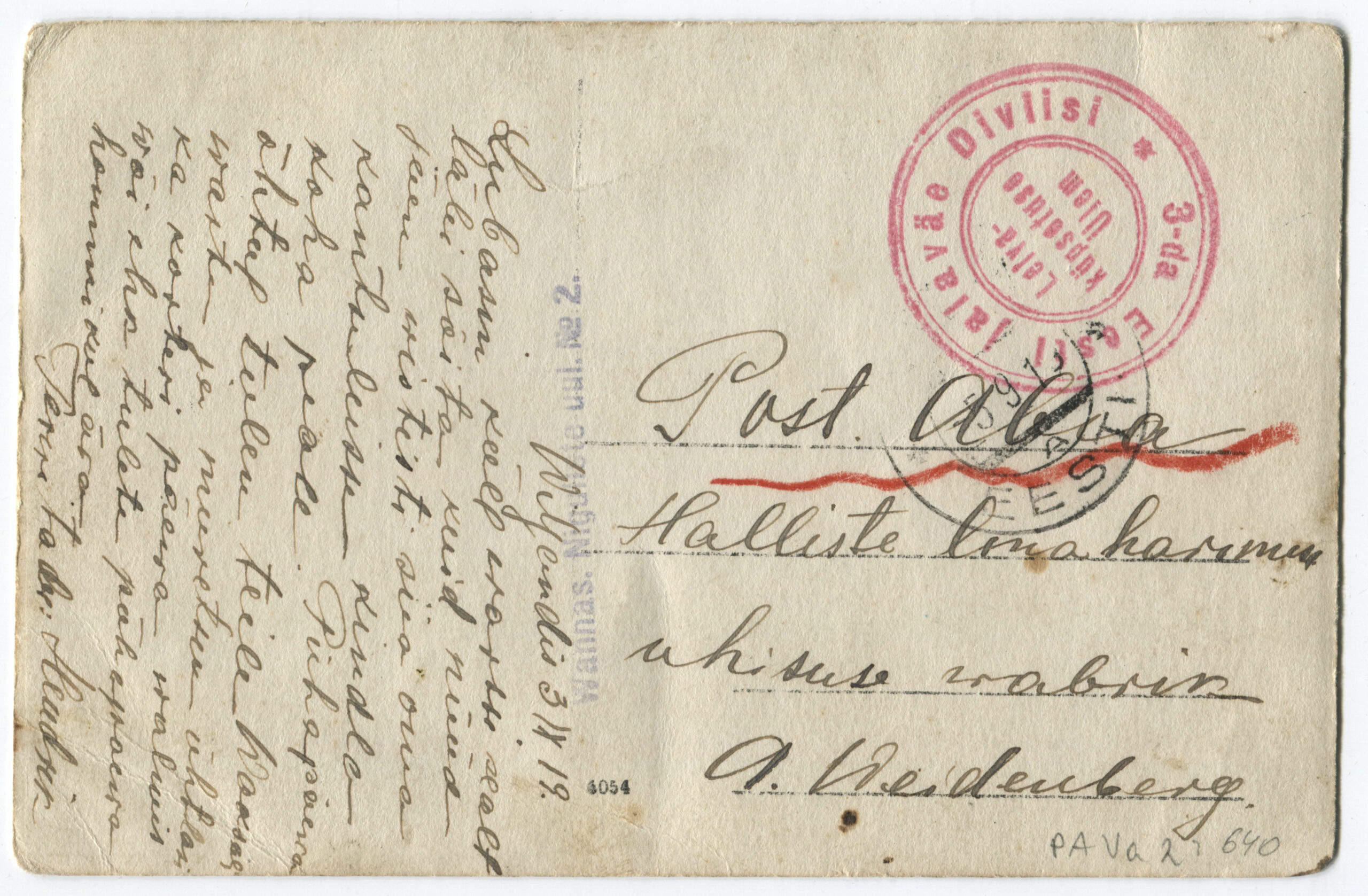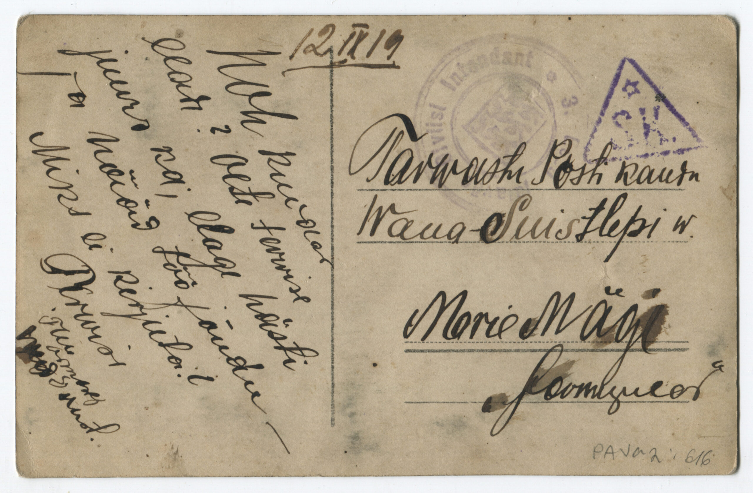 Kiri on saadetud Rakverest Viljandisse 24.06.1919.