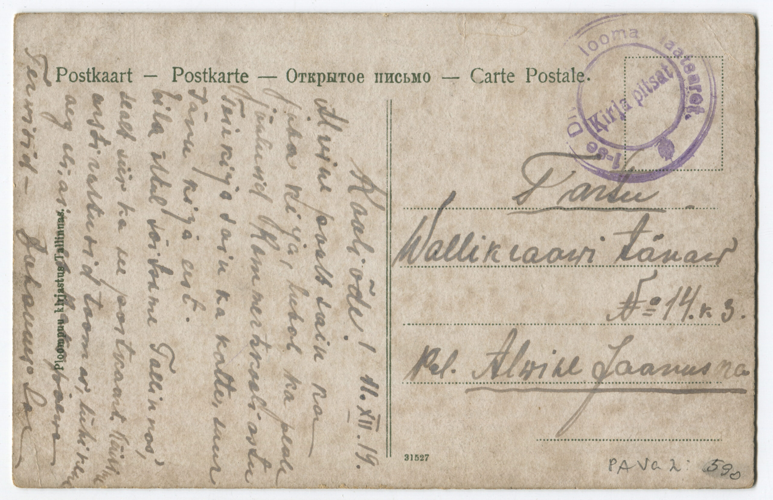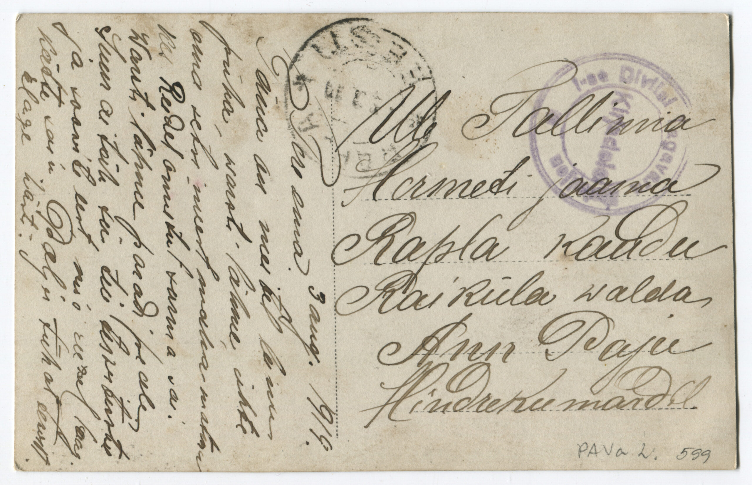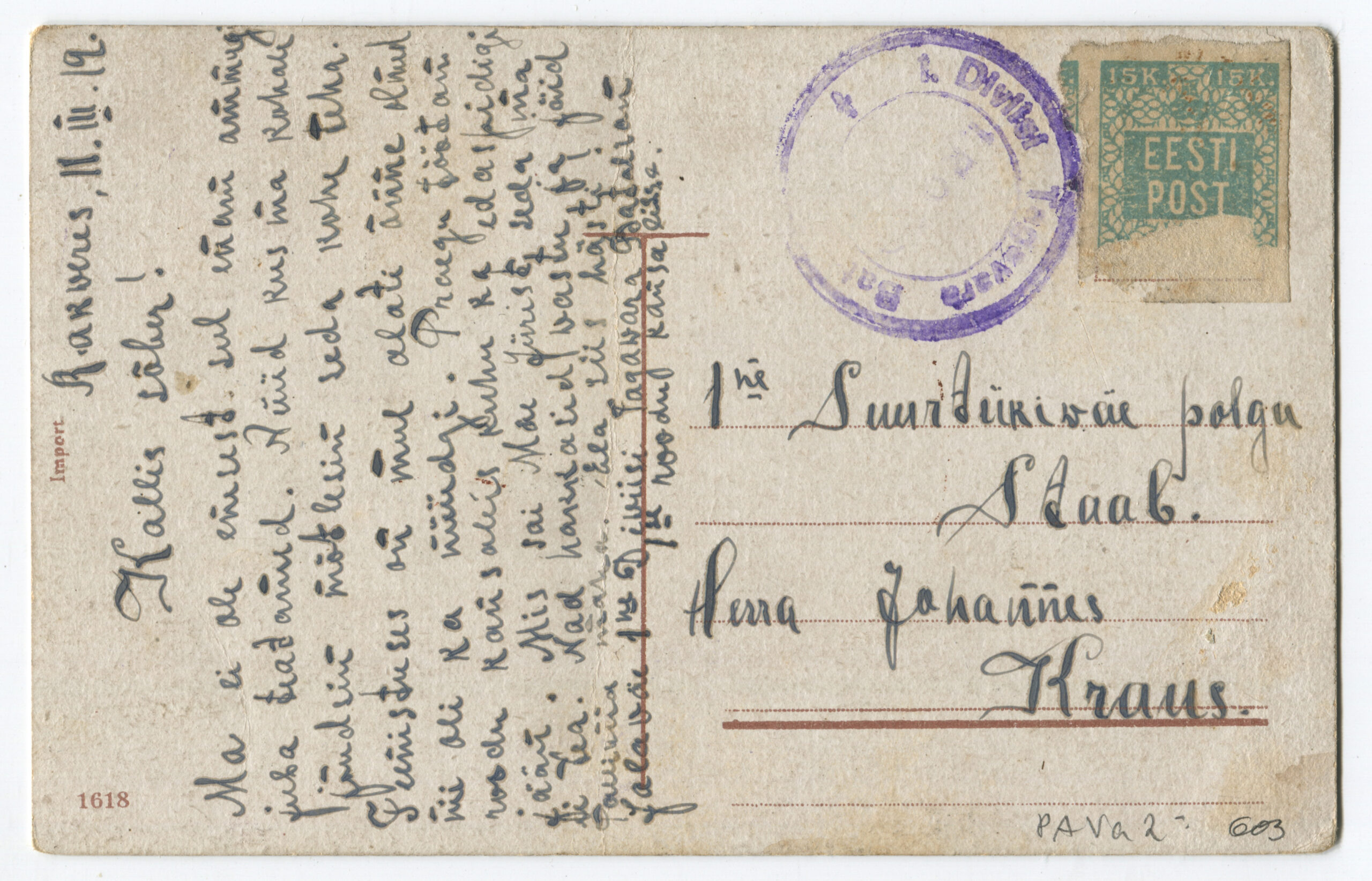 Kiri on saadetud 11.03.1919 Rakverest 1. suurtükiväepolgu staapi.