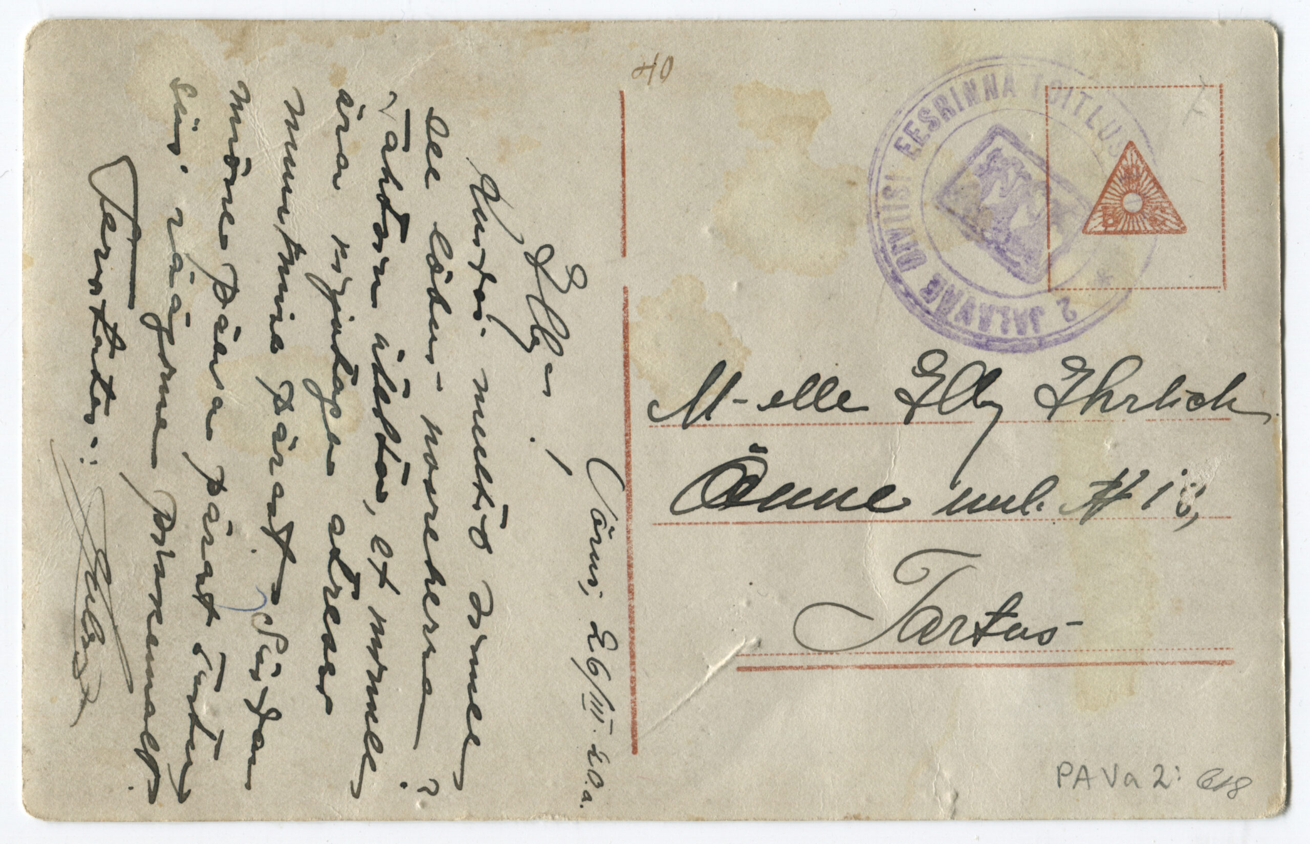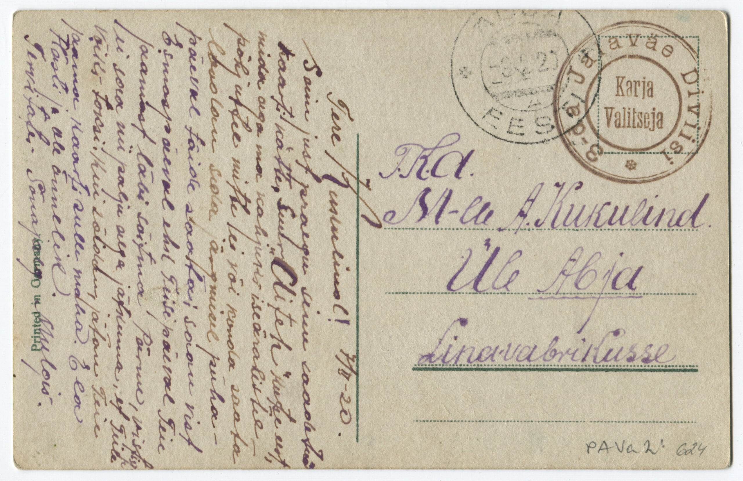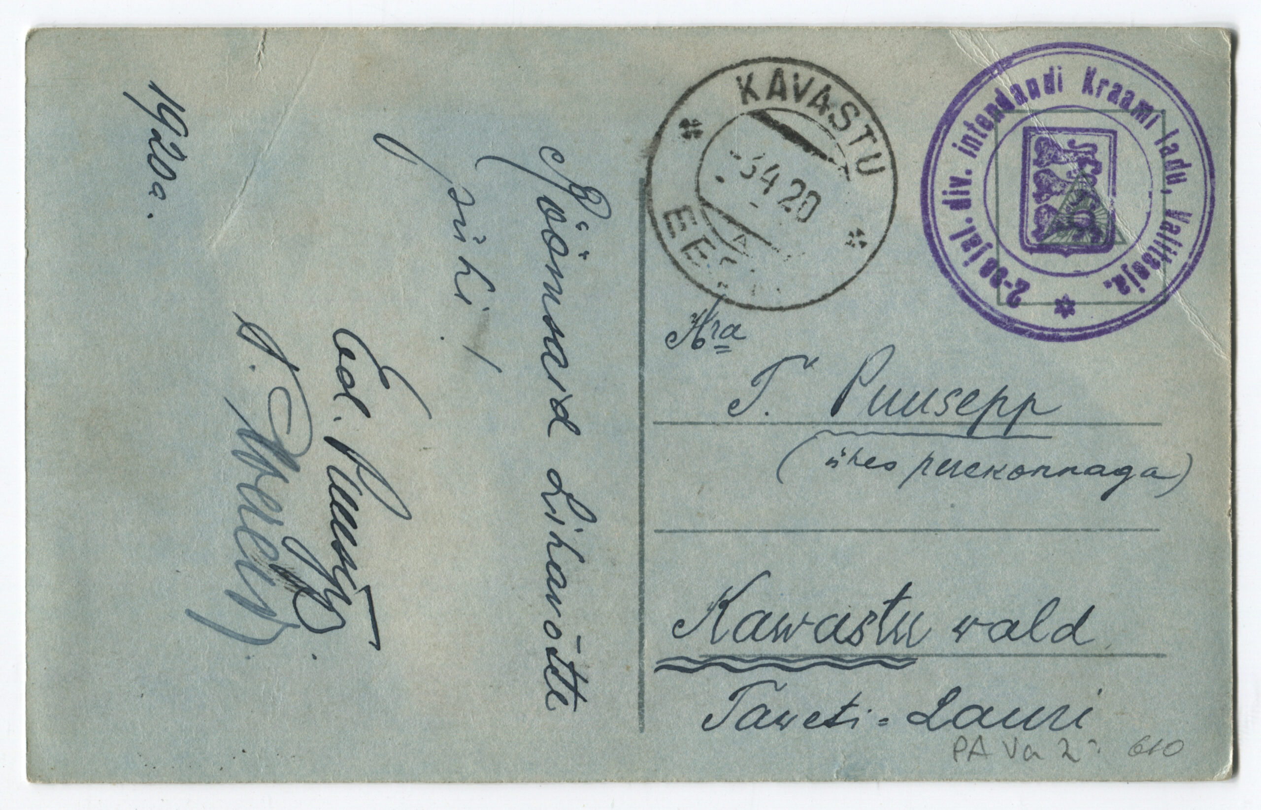 Kiri on saadetud päev pärast Vabadussõja lõppemist. Kalendertempel: Abja, 3.02.1920