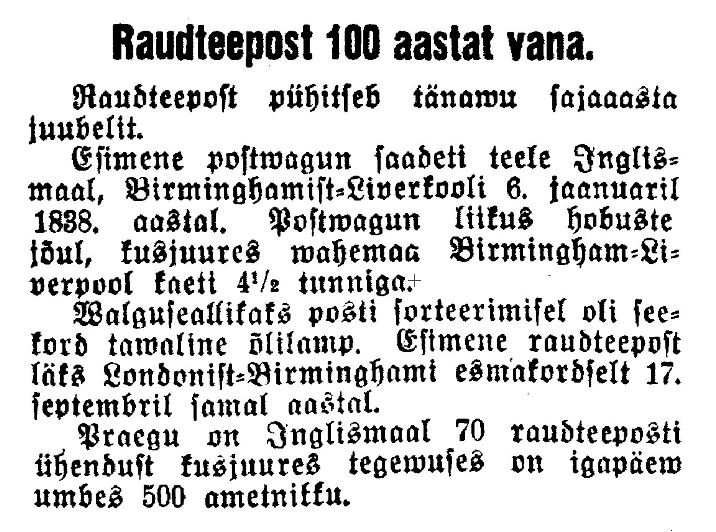 Balti raudteel algas ametlik postivedu 7. novembril (26. oktoobril) 1870.