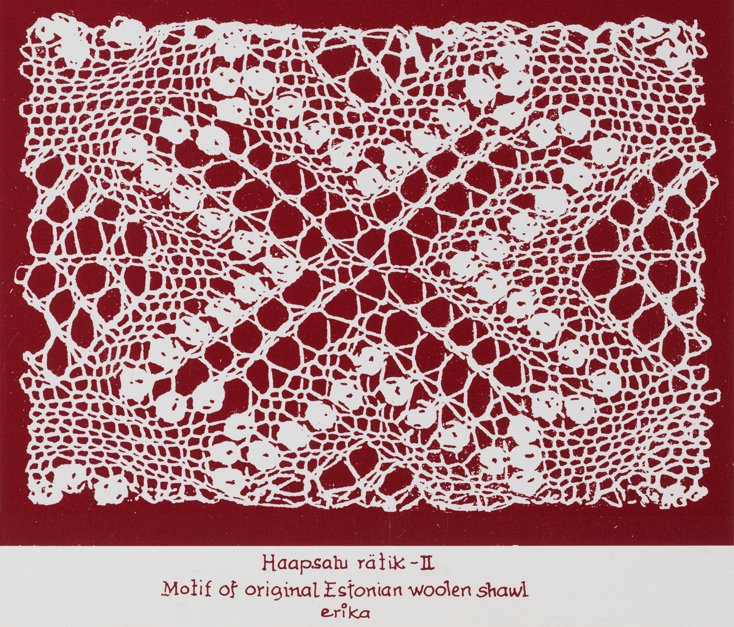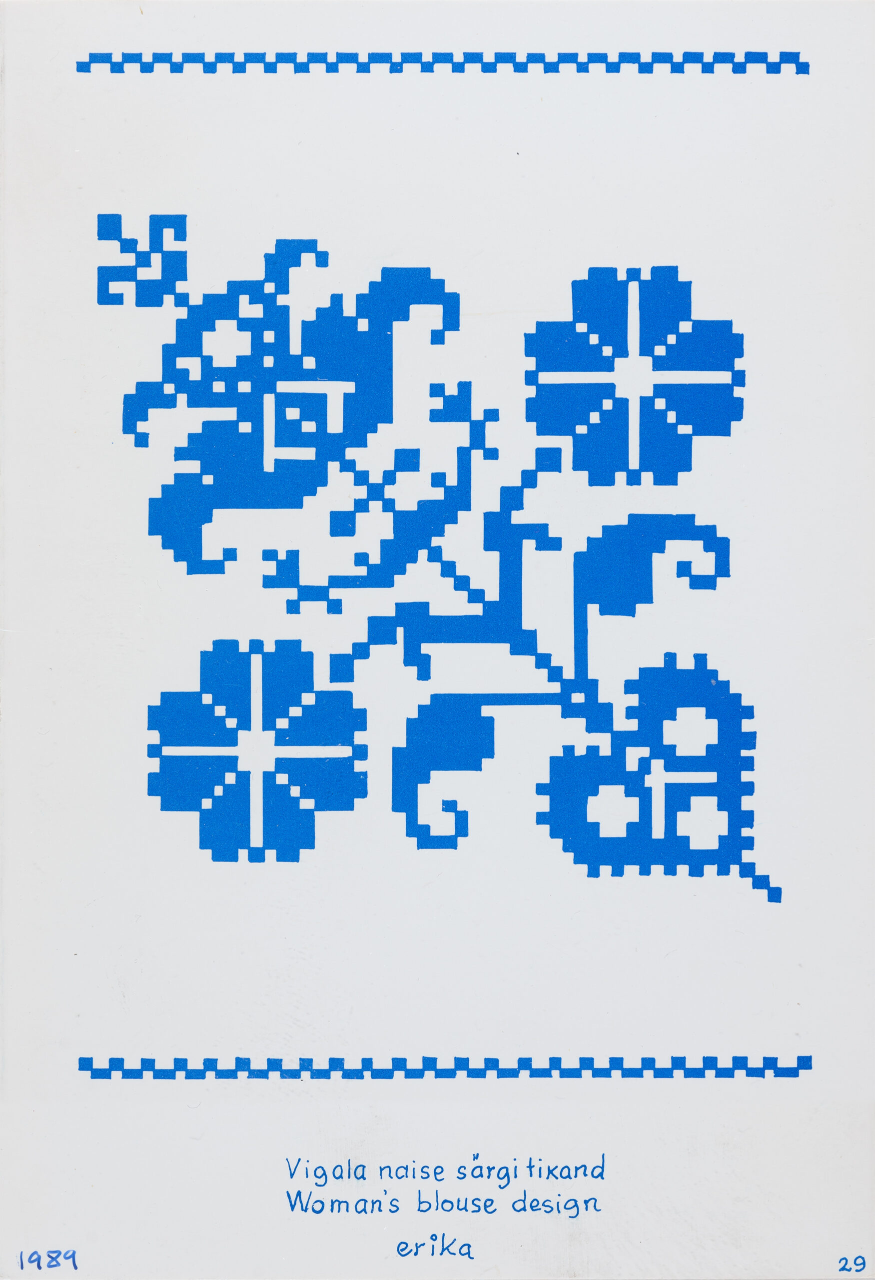 Haapsalu salli motiividHalliste kihelkondHelme kihelkondHelme kihelkond. VärvilehtIisaku kihelkondJõelähtme kihelkondLihula kihelkondLihula kihelkondLihula kihelkondLillekirjaga postkaart 1991Mustrimotiiv jõulukaardilPeetri kihelkondPõlva kihelkondSeto vöökiriSokimuster. VõrumaaTarvastu kihelkondTarvastu kihelkondTarvastu kihelkondTarvastu tanukiri. VärvimislehtTarvastu tikand. VärvimislehtVigala kihelkondSokimuster. Võrumaa. Värvimisleht