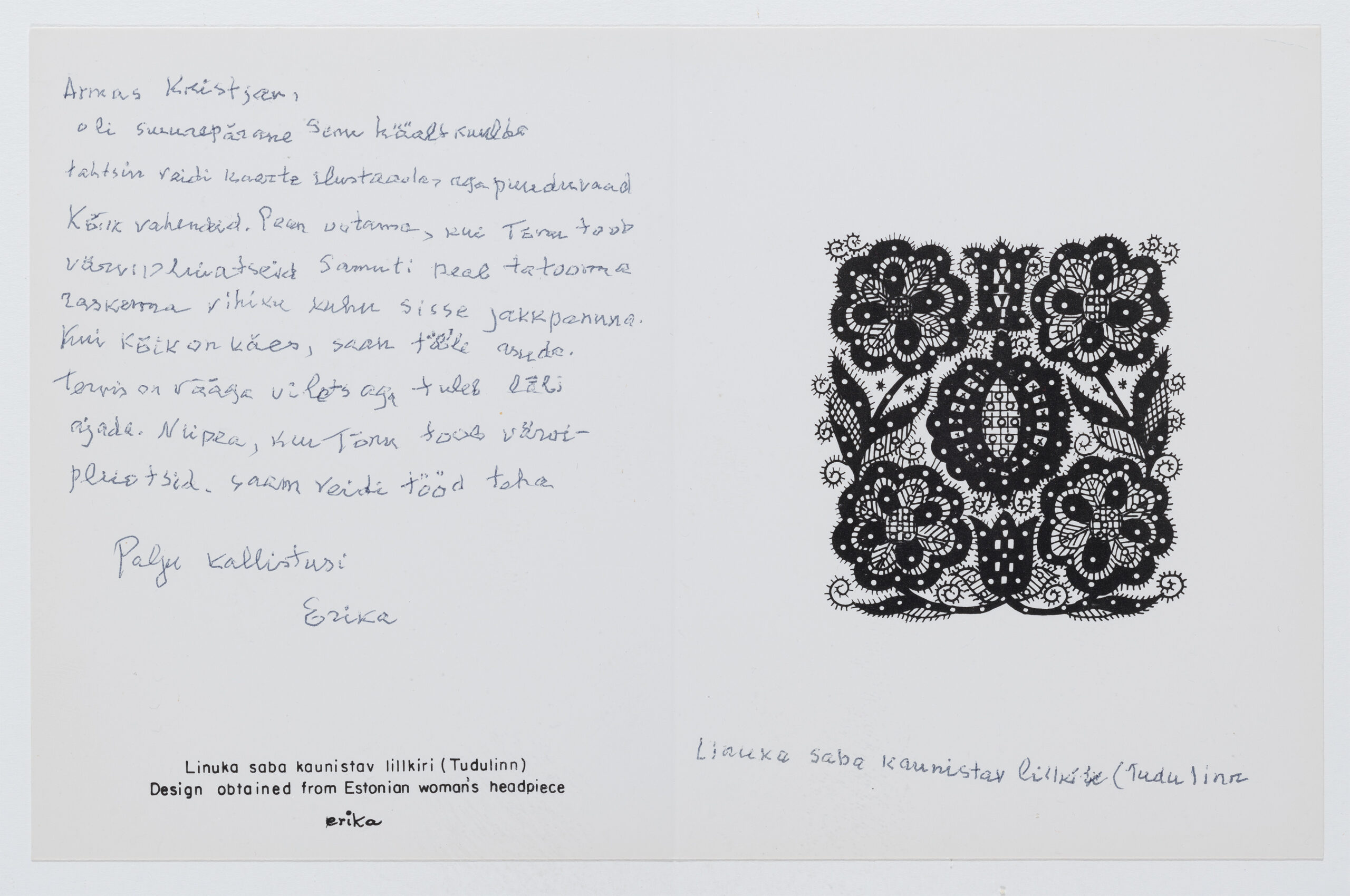 Erika Kalami postkaarte saadeti Eestisse USAst 1970.-80ndatel. Nüüd jõudsid Eesti Rahva Muuseumi tema etnograafiliste motiividega postkaartide originaalid. Need minimalistlikud ja kunstipärased jõulukaardid väljendavad koduigatsust ja neis tuleb esile mälus alles hoitud värvikirev rahvakultuuri maailm.