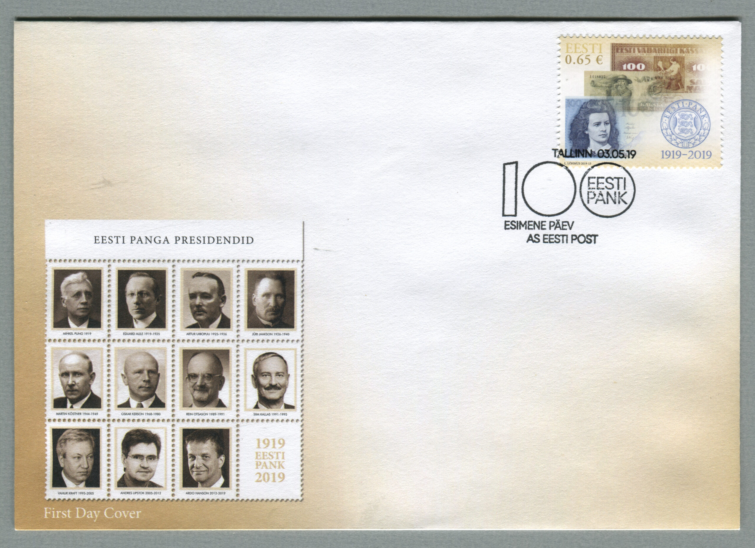 ERMi koguEsimese päeva ümbrik (FDC), „Eesti Pank 100“, 3.05.2019. Kunstnik Lembit Lõhmus.