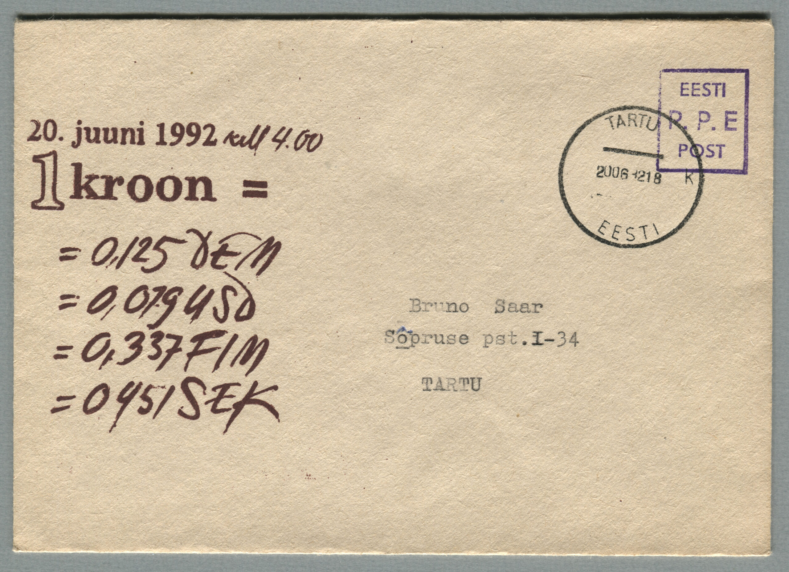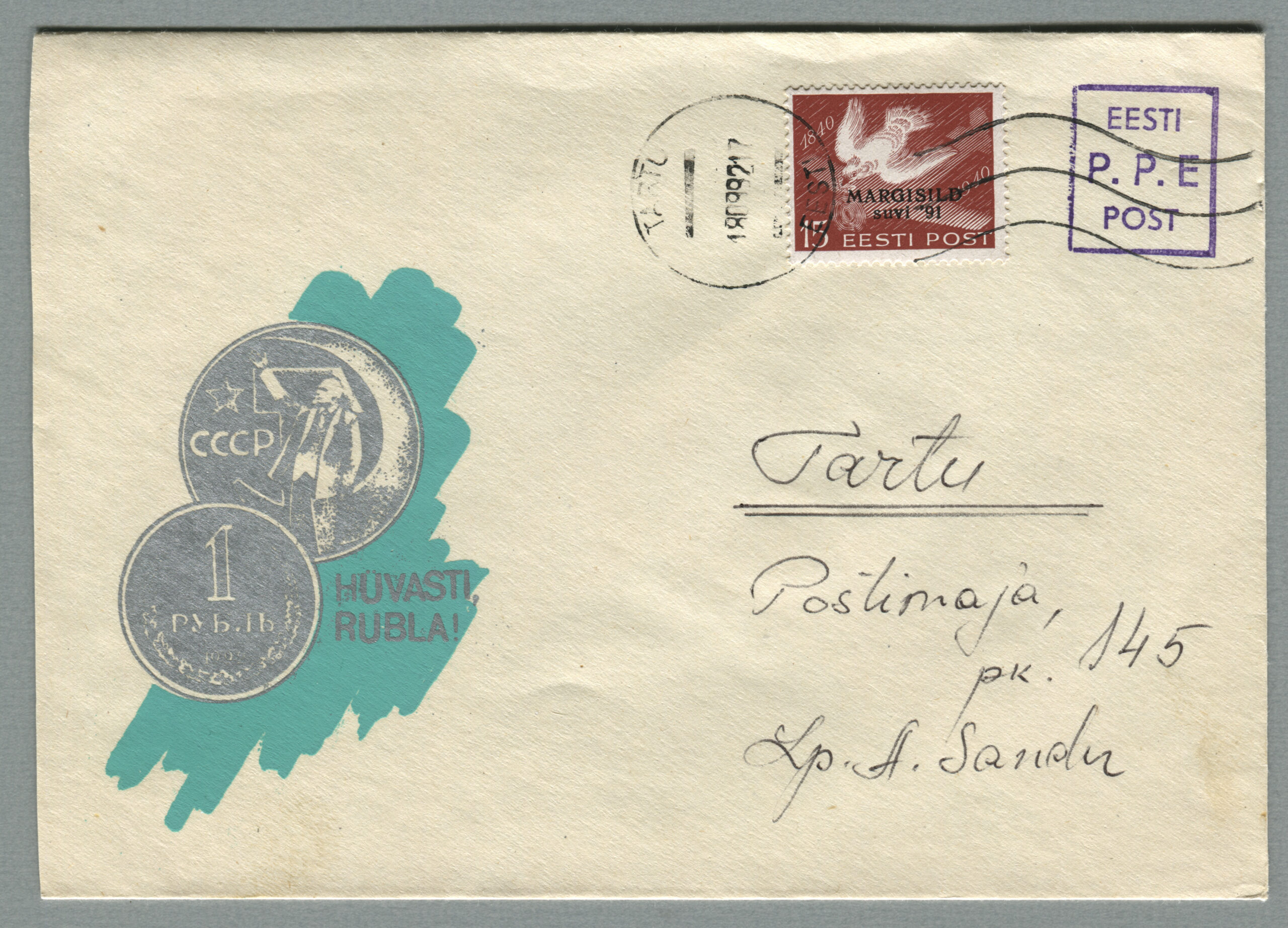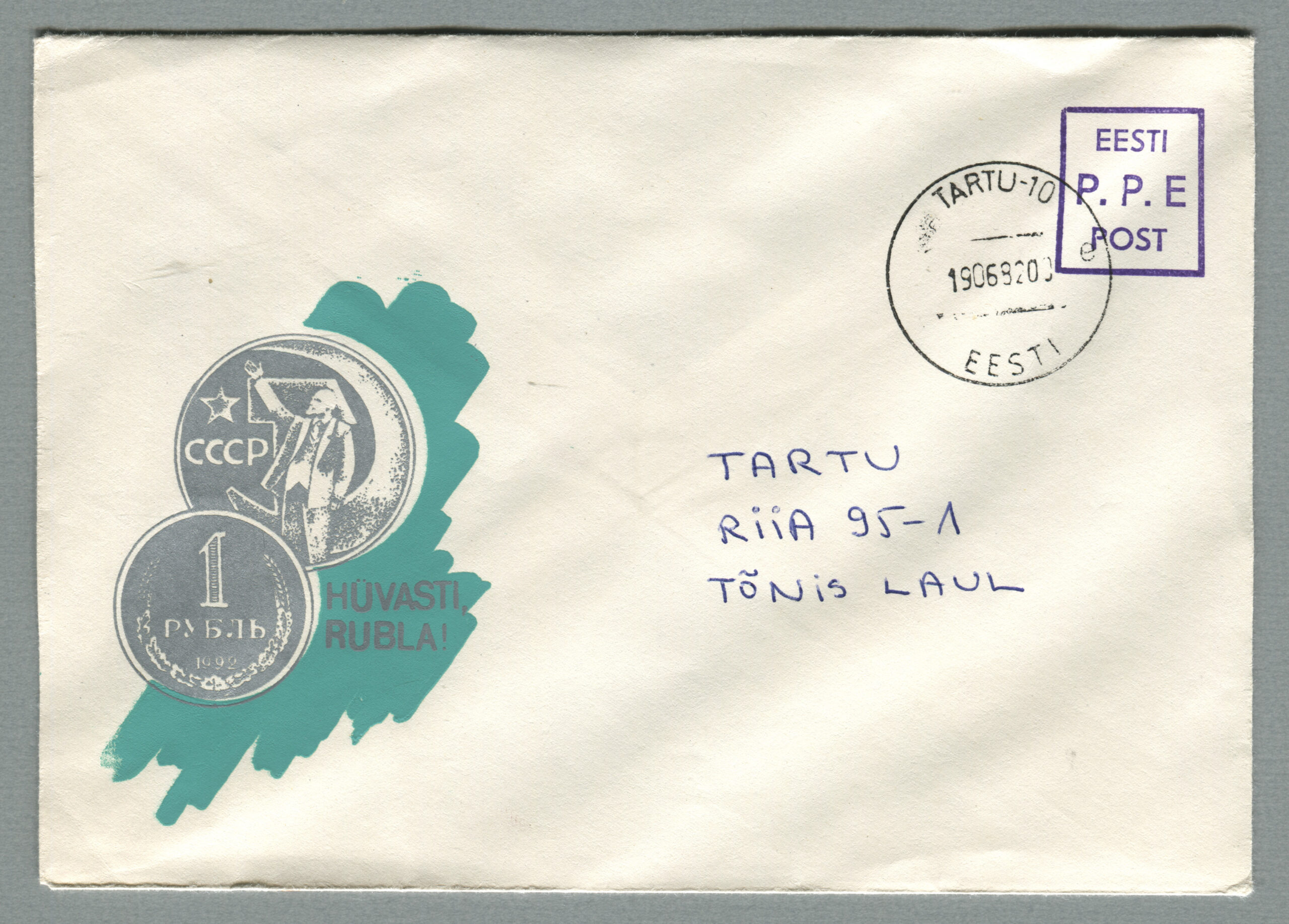 ErakoguEratervikasi „Hüvasti, rubla“. Kujundaja Marvi Saar, tellija Ülo Laul, ümbrik, tiraaž 100 (15.06.1992). Lilla käsitempel „P.P.E“.