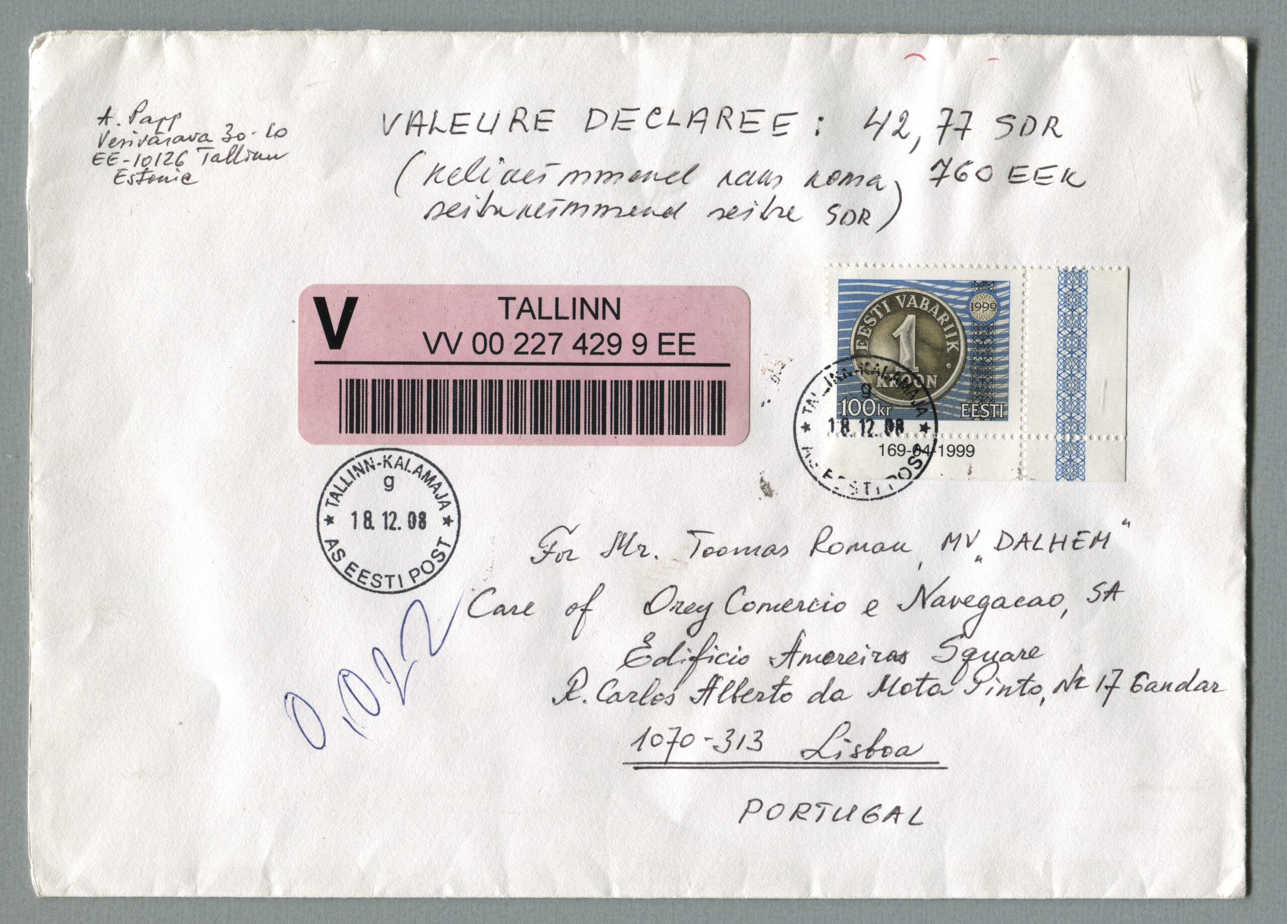 ErakoguVäärtkiri, mis on saadetud Tallinnast 18.12.2008 Lissaboni (Portugal).