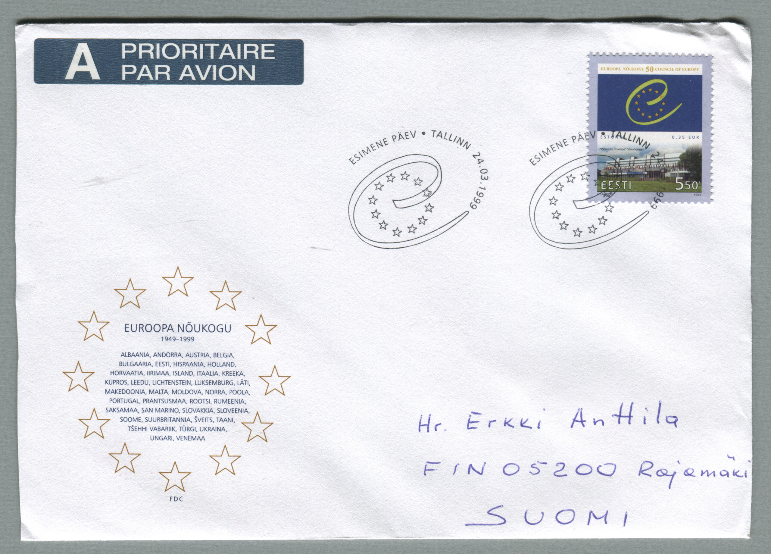 Erakogu„Euroopa Nõukogu 50“, 24.03.1999. Kunstnik Jaan Saar. Eesti postmargil oli esimest korda nominaal ka eurodes. Kehtivusaeg tähtajatu.
