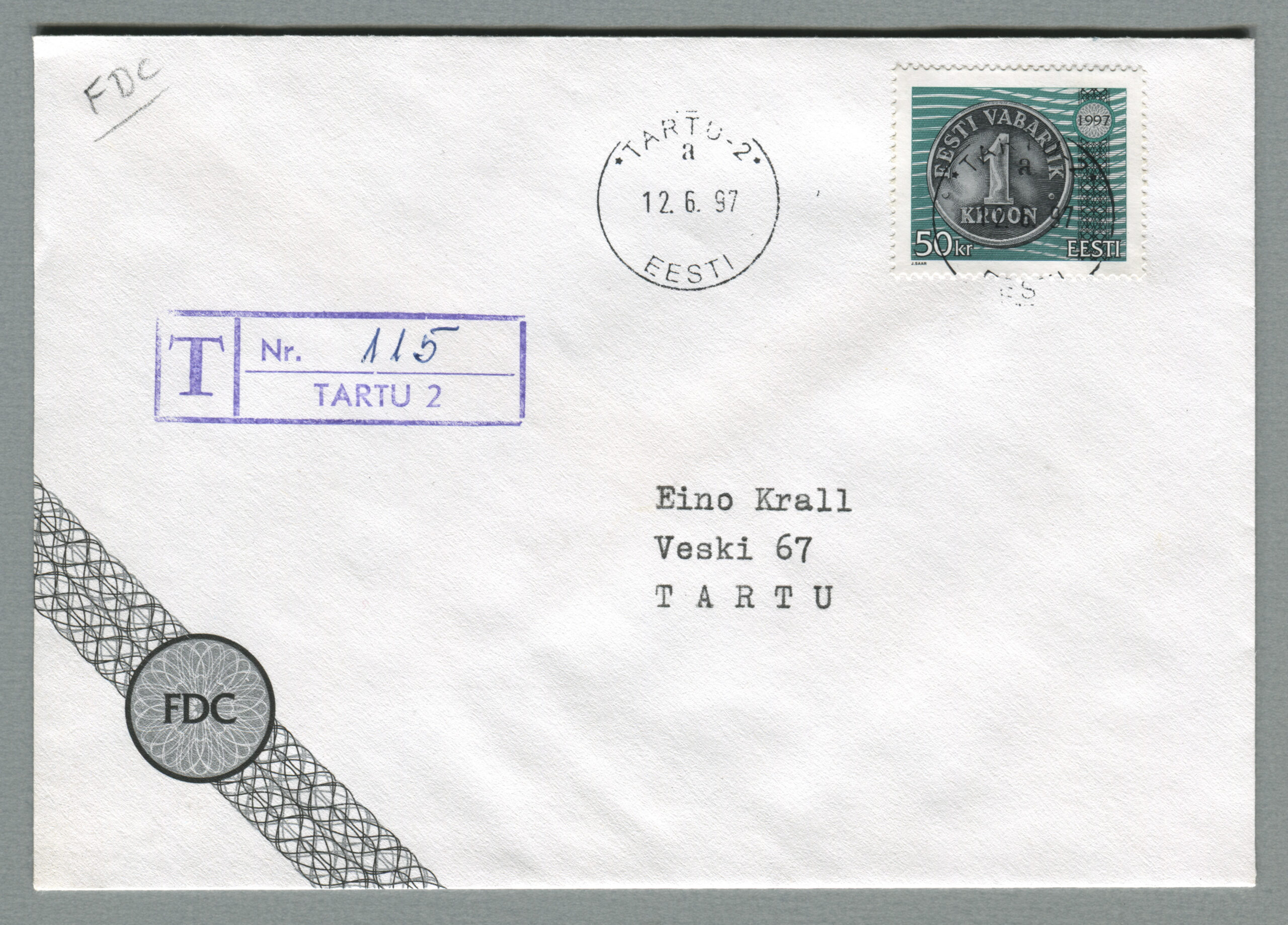 ERMi koguTähitud kiri, mis on saadetud margi ilmumise päeval Tartust, 12.06.1997.