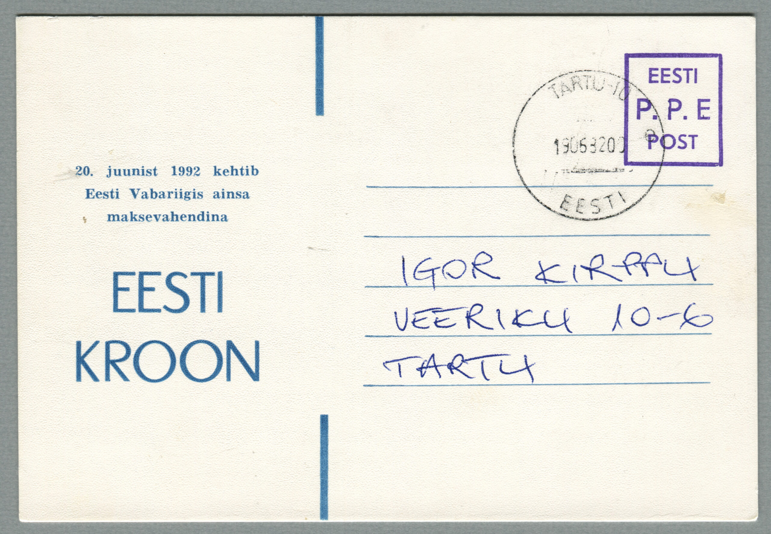 ErakoguErapostkaart „Eesti kroon“. Kujundaja ja tellija Ülo Laul, Tartu Trükikoda, tiraaž 500.