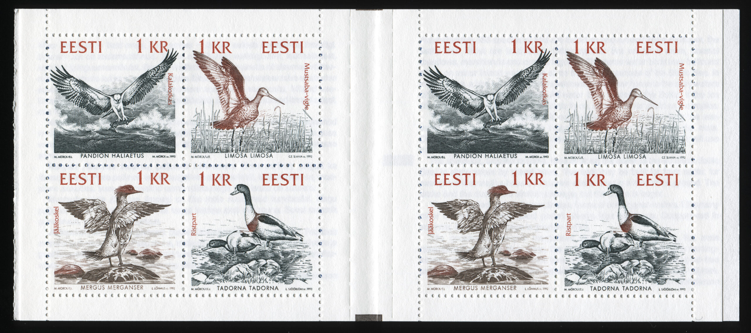 Esimene kroonivääringus mark oli Eesti–Läti–Leedu–Rootsi ühisväljaanne, margivihik „Mare Balticum. Merelinnud“, 3.10.1992. Eesti margil on jääkoskel ja selle kujundas Lembit Lõhmus.
